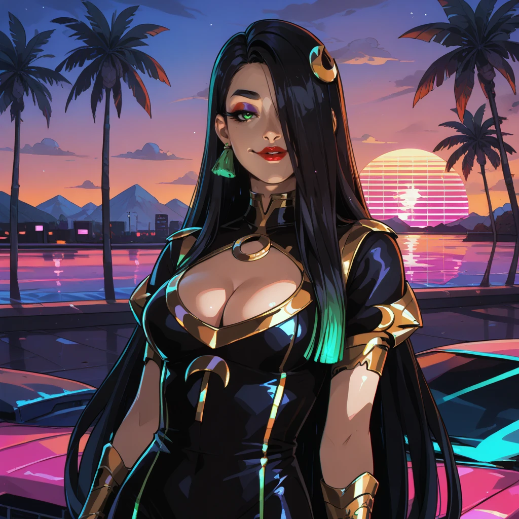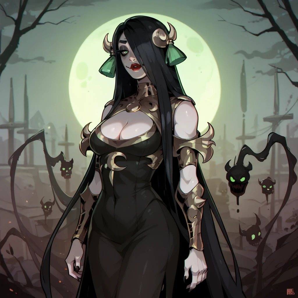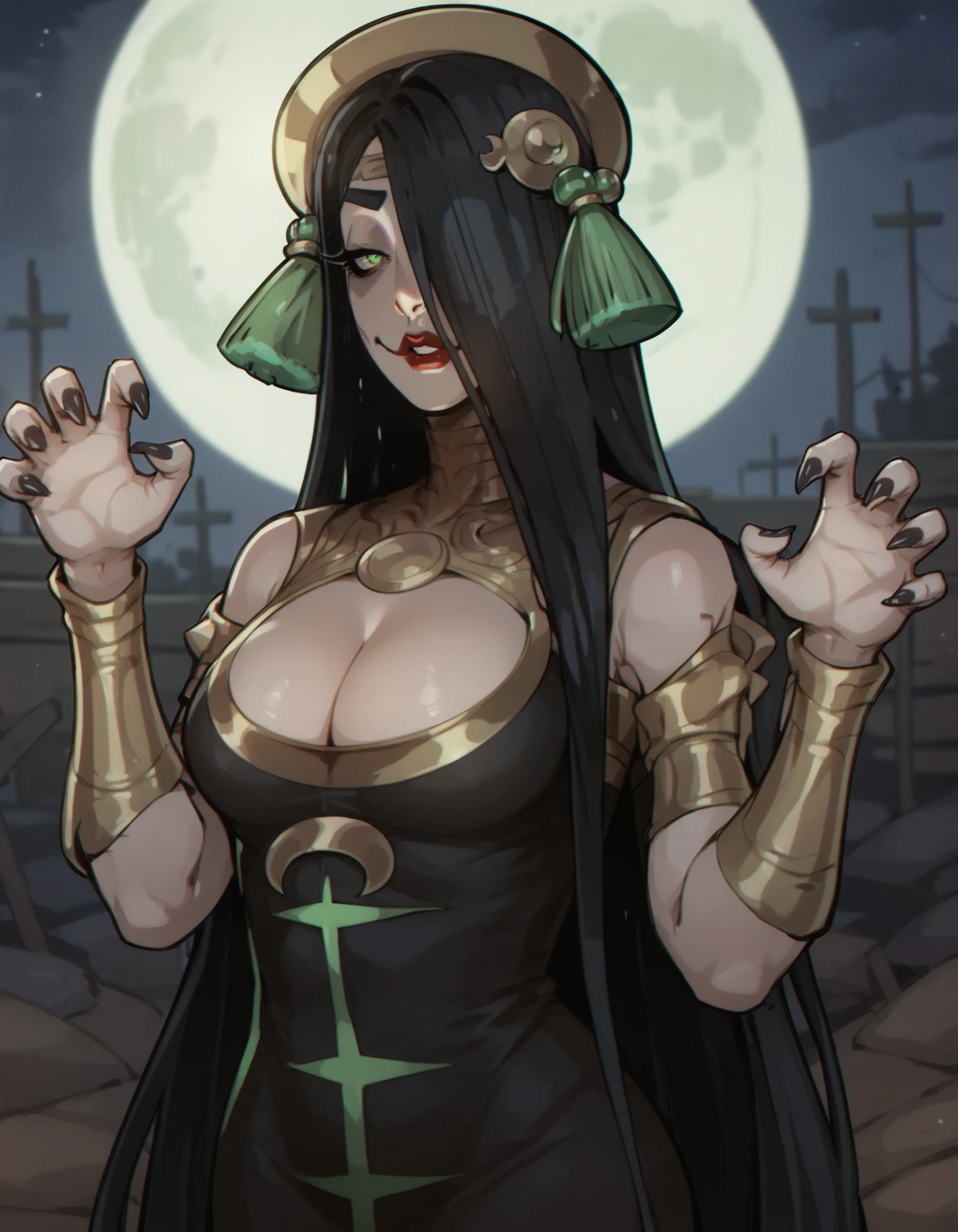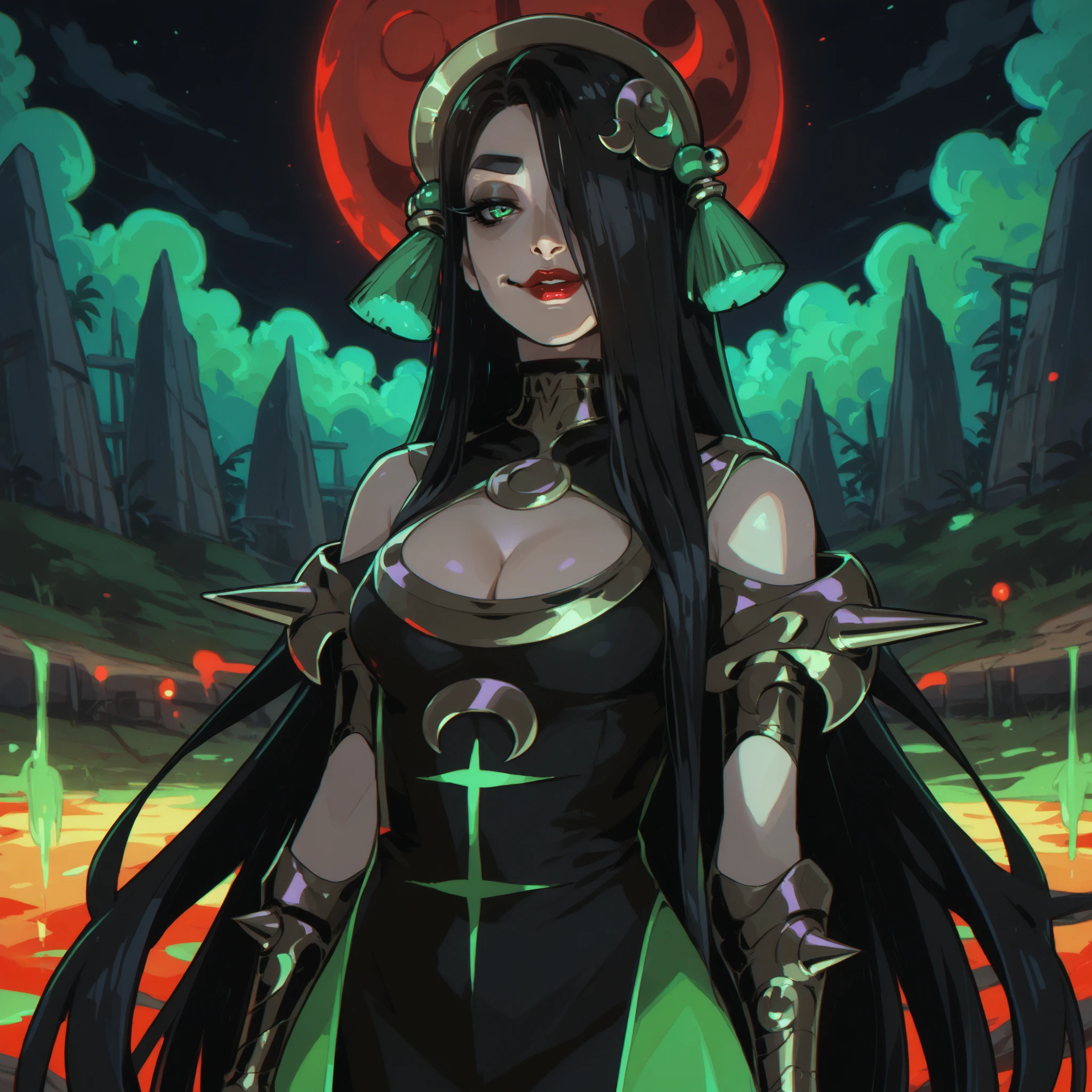 1girl, green eyes, hair over one eye, black dress, red lips, lipstick, very long hair, black hair, cleavage, golden headband around head, clothing cutout, green tassel