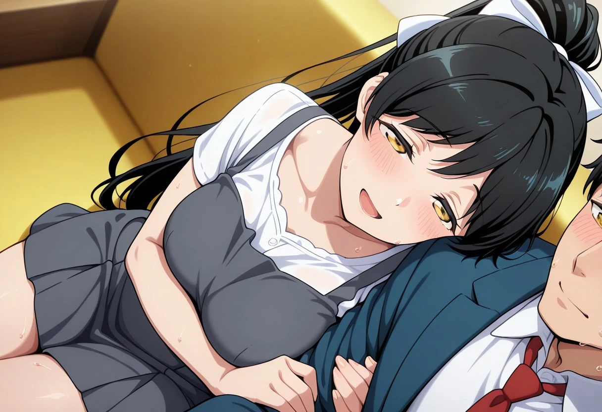 long hair, bangs, black hair, bow, yellow eyes, ponytail, hair bow, high ponytail, mature female, medium breasts