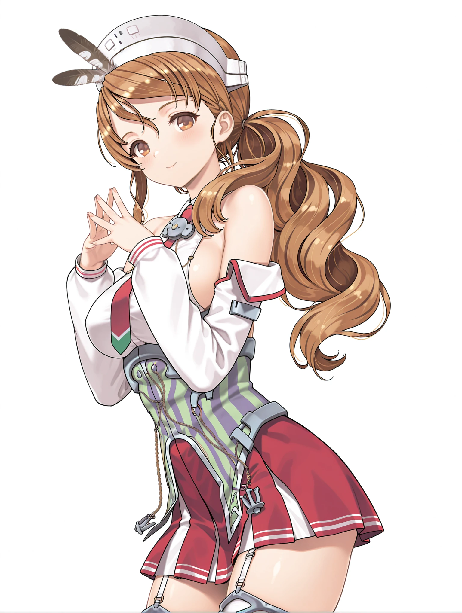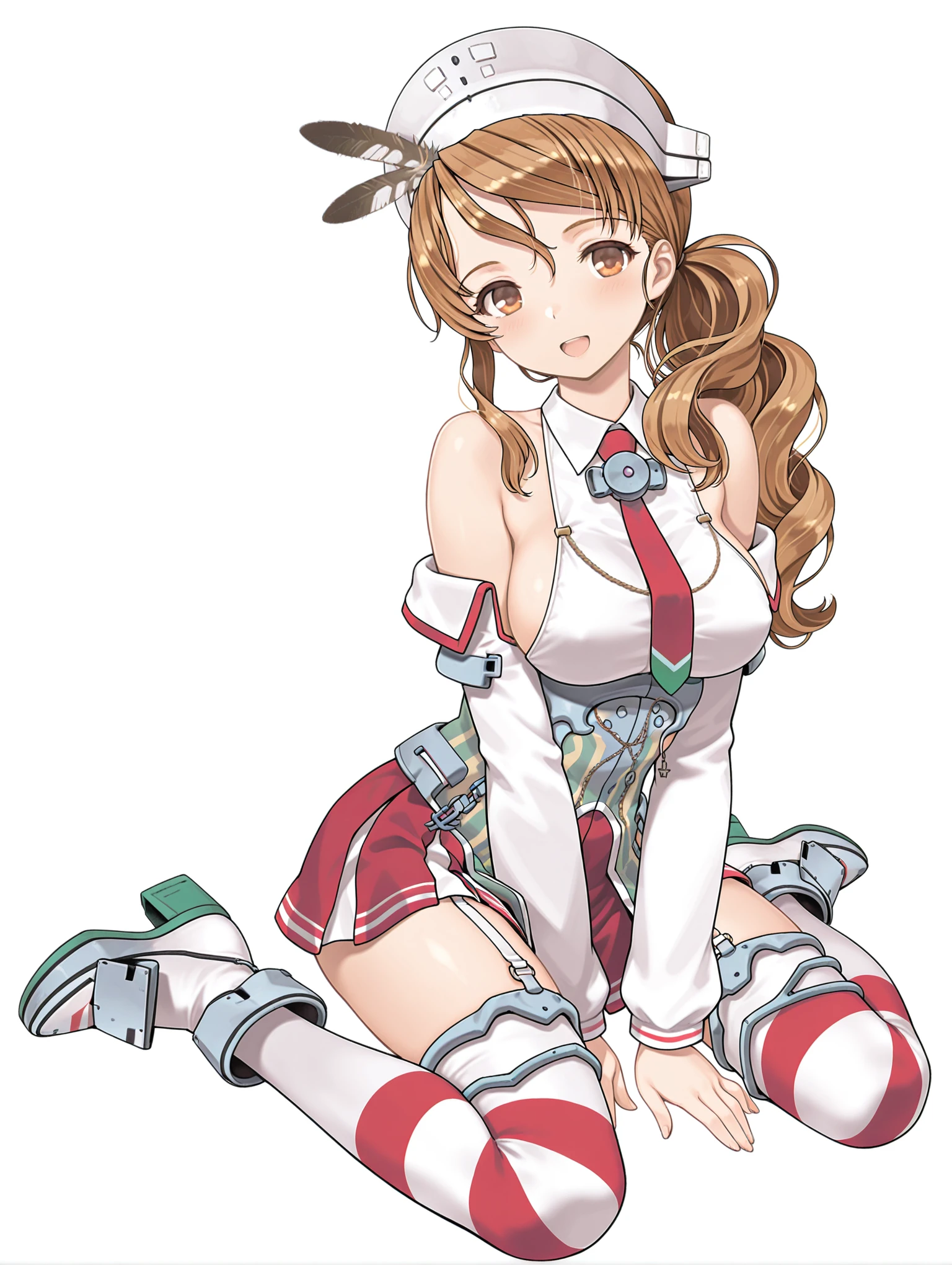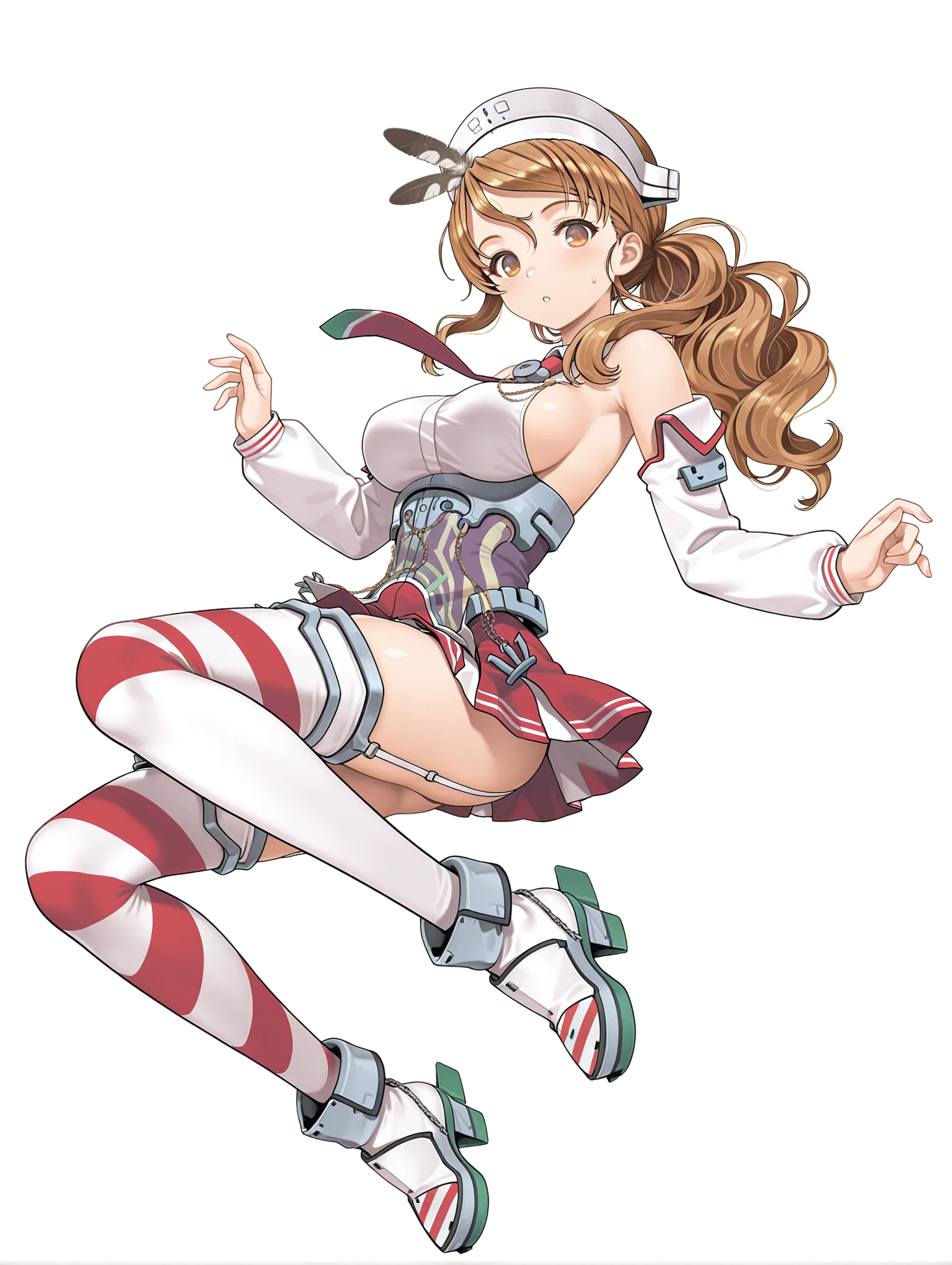 l_clothes,detached sleeves,red necktie,bare shoulders,sideboob,corset,red miniskirt,garter straps,striped thighhighs,rudder footwear,