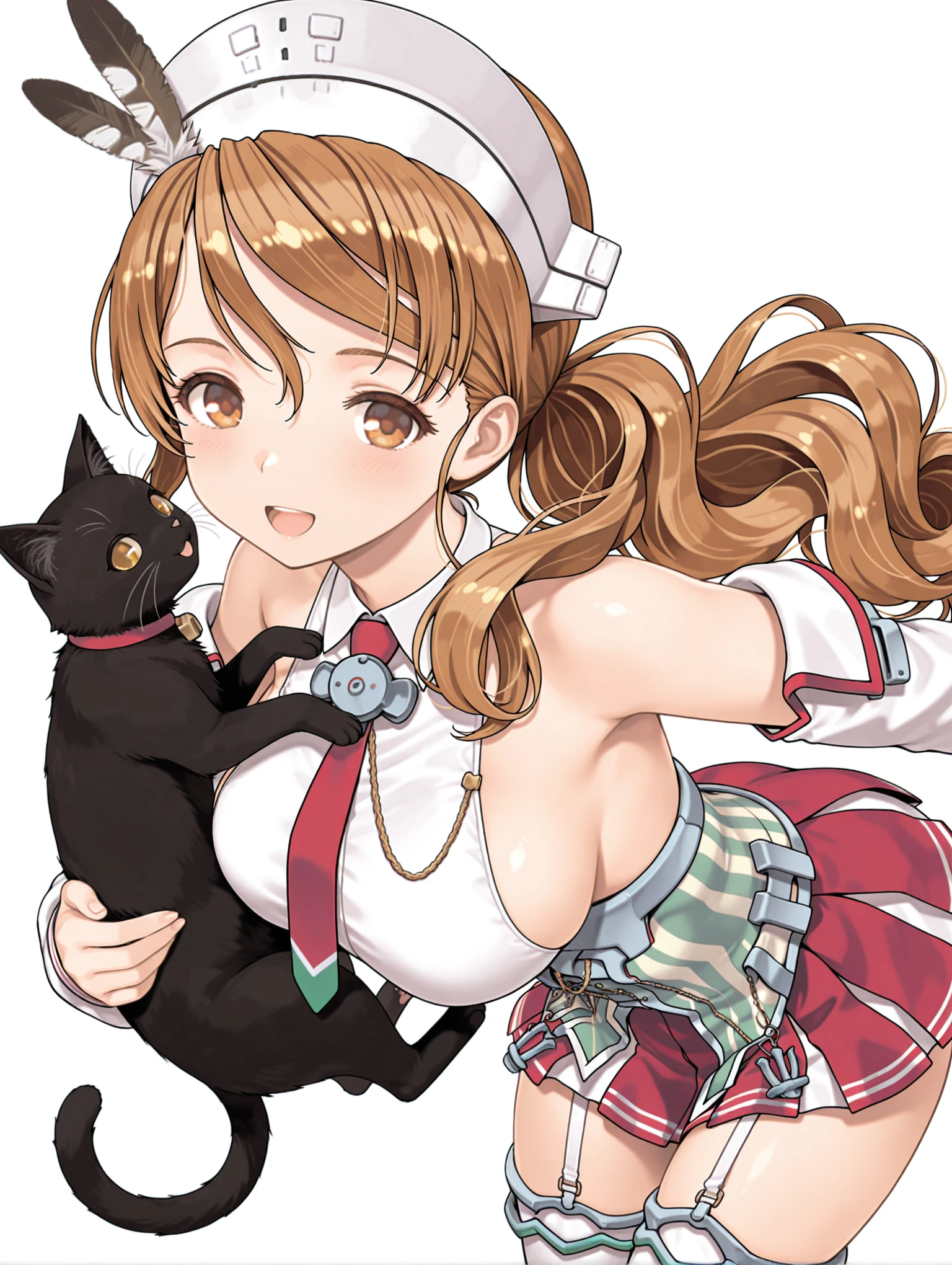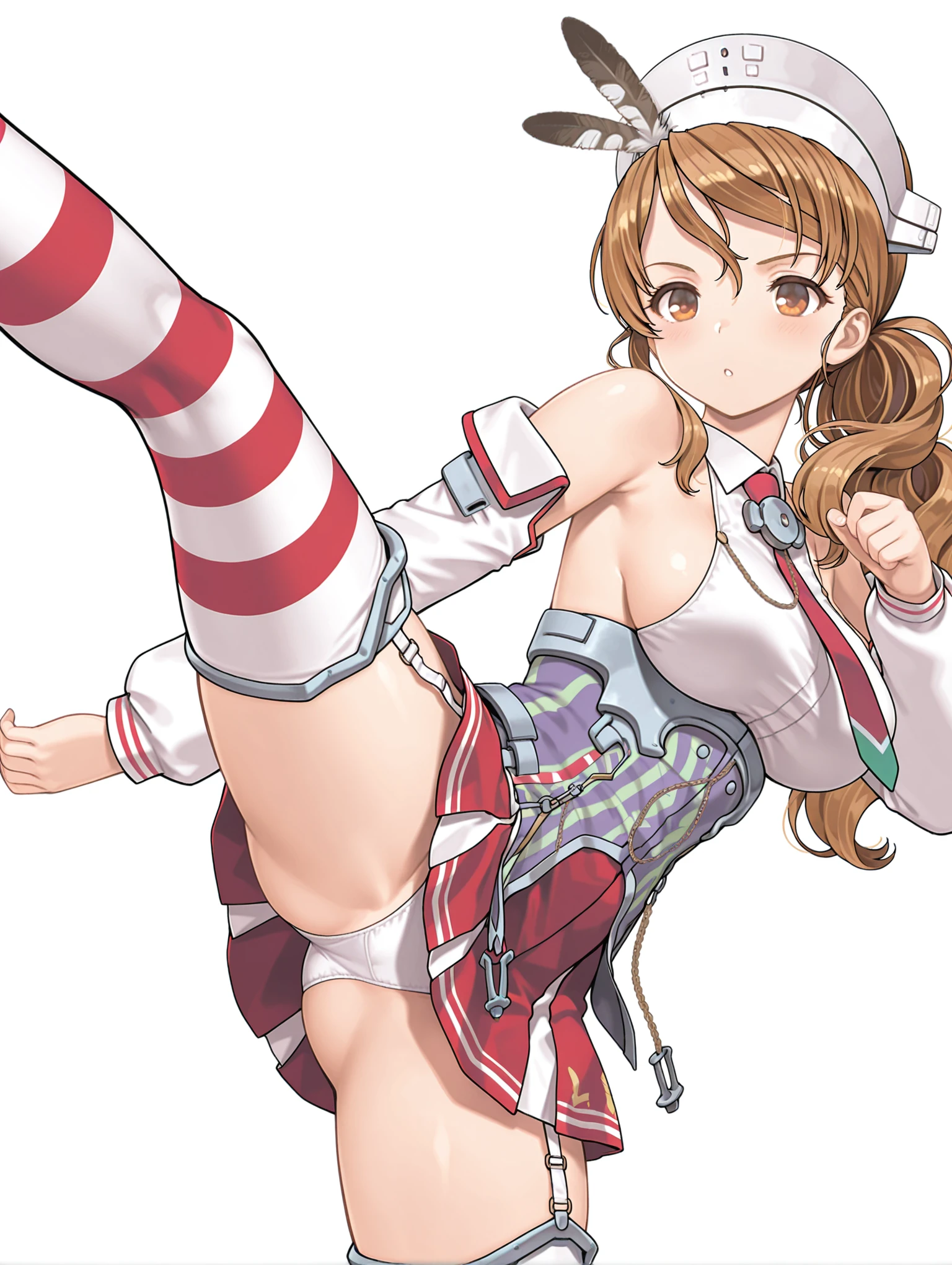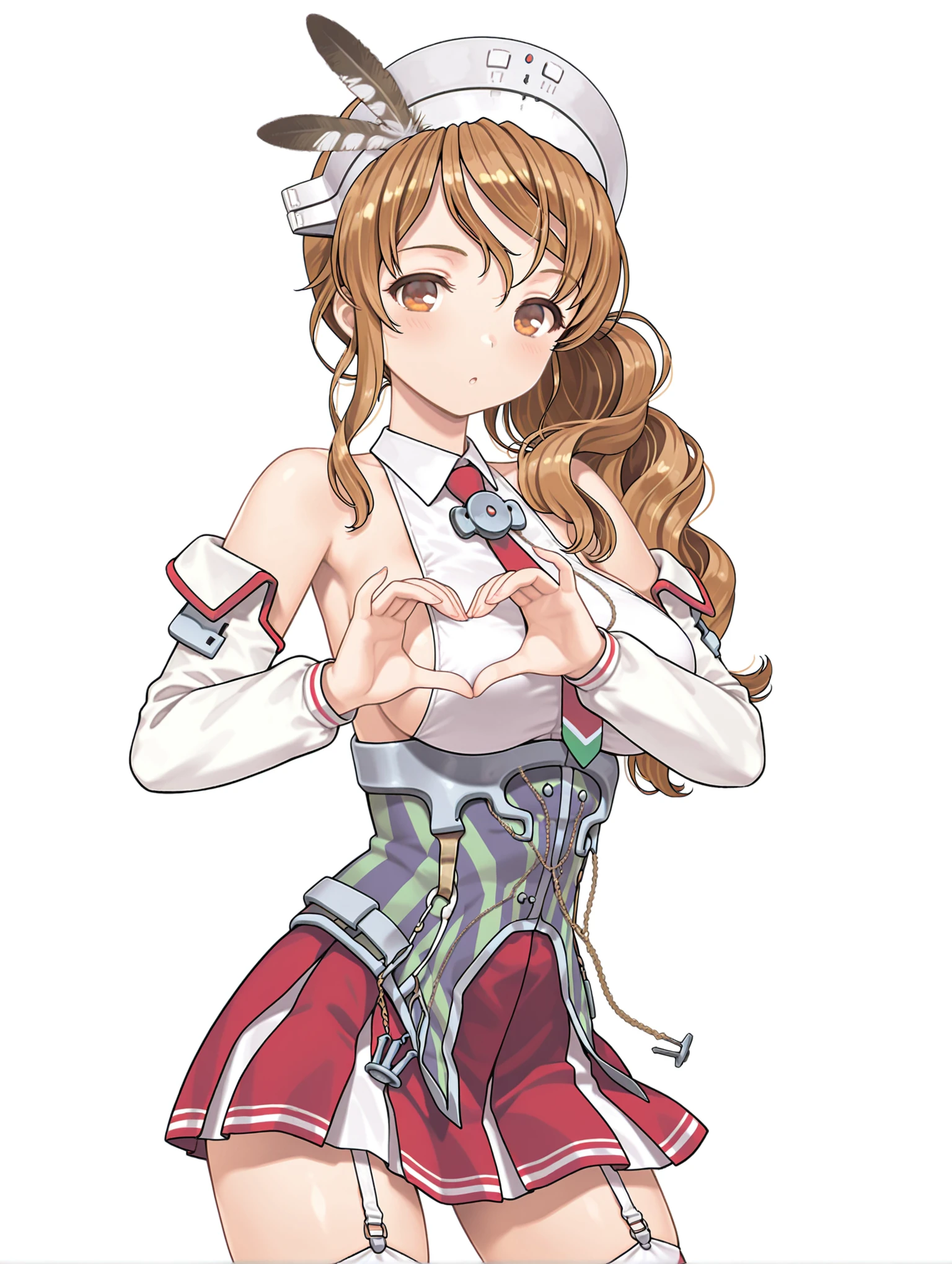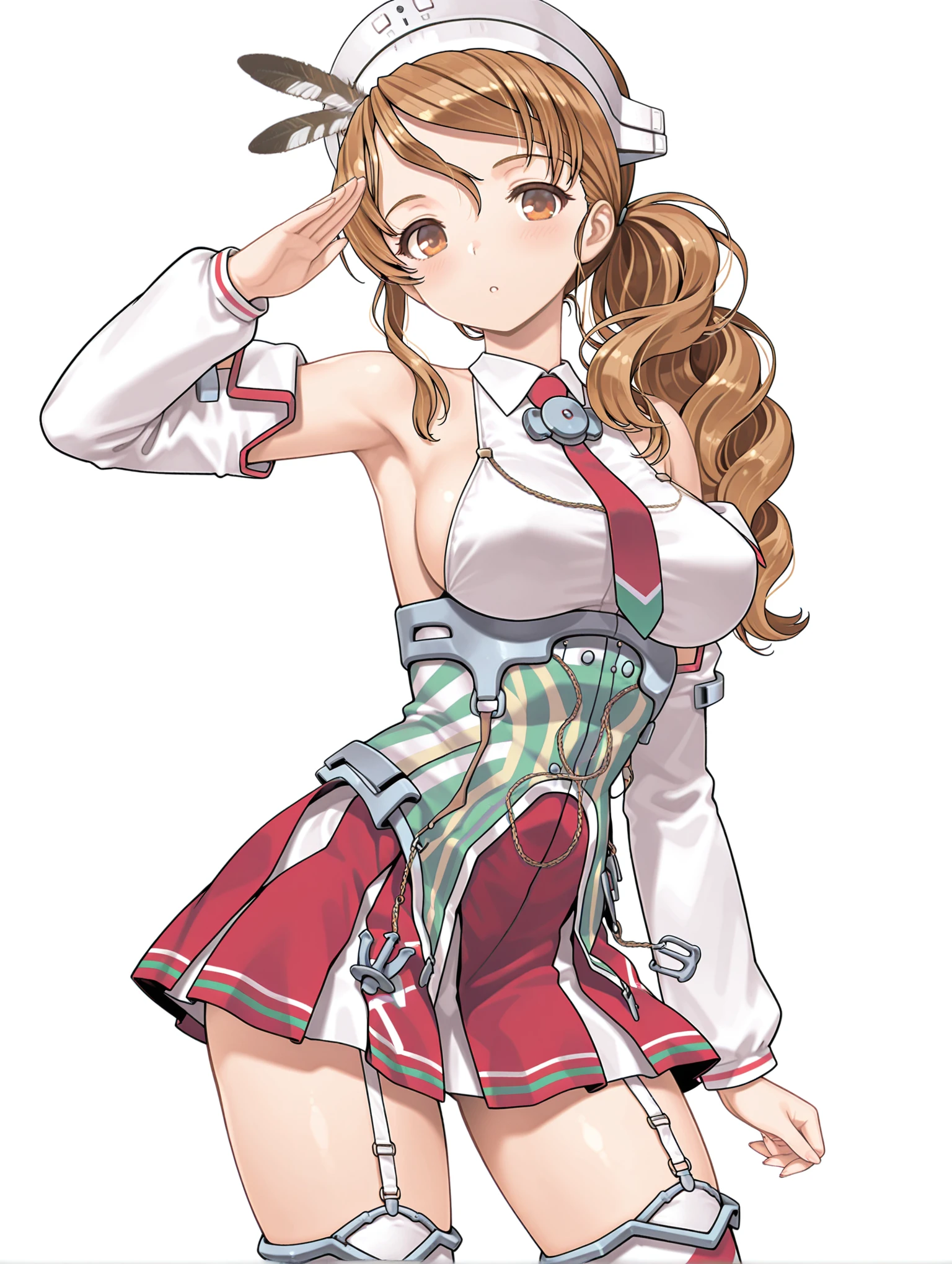 l_clothes,detached sleeves,red necktie,bare shoulders,sideboob,corset,red miniskirt,garter straps,striped thighhighs,rudder footwear,