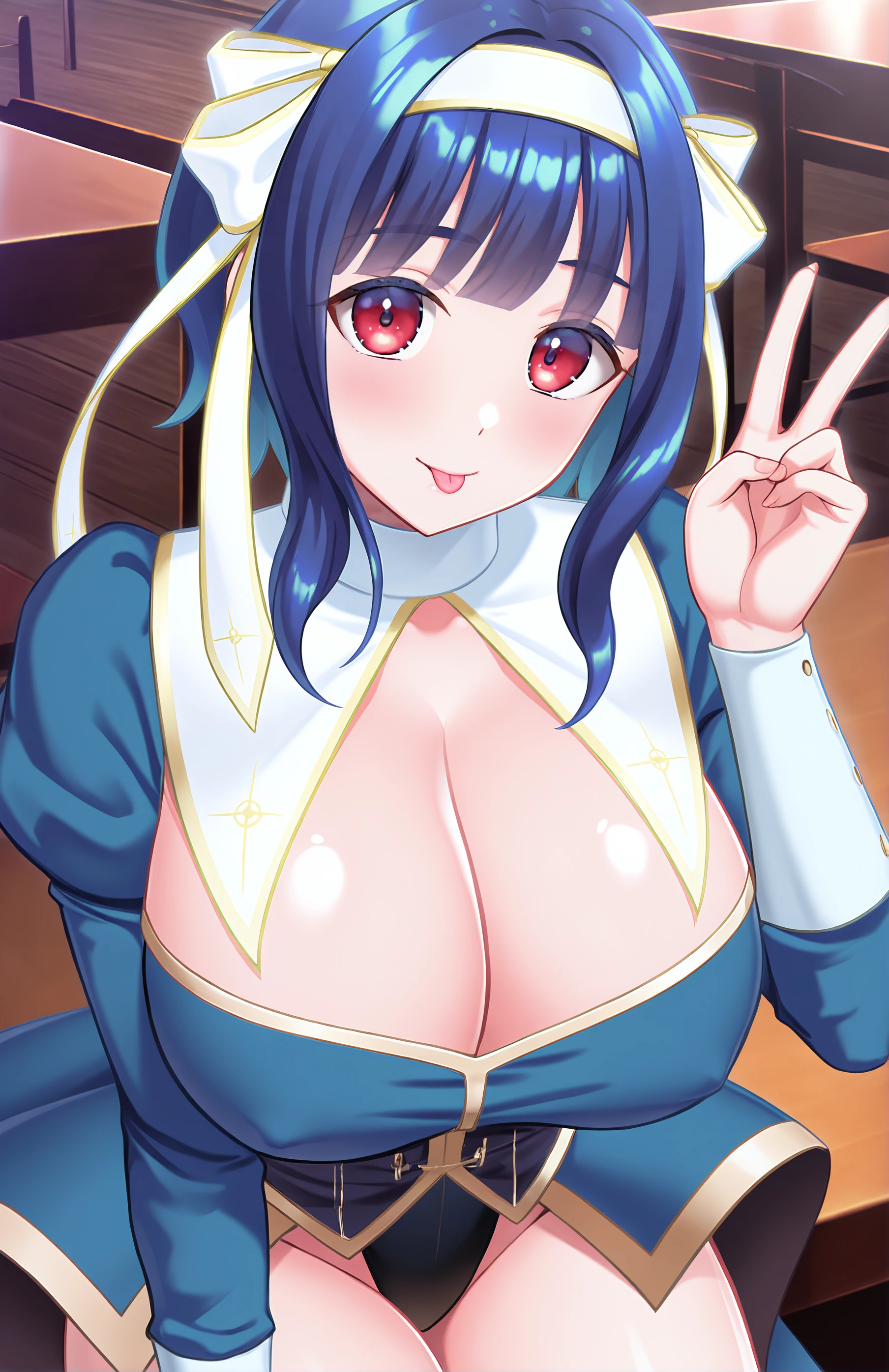 ElenaKoutris, breasts, short hair, bangs, large breasts, red eyes, long sleeves, ribbon, cleavage, blue hair, hair ribbon, hairband, puffy sleeves, huge breasts, leotard, juliet sleeves, skirt, white hairband