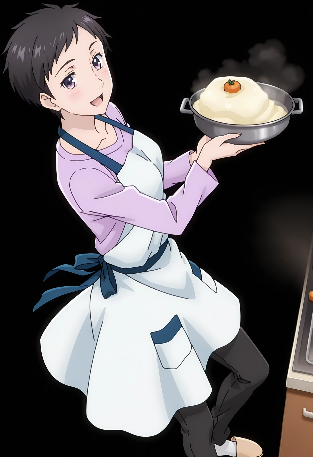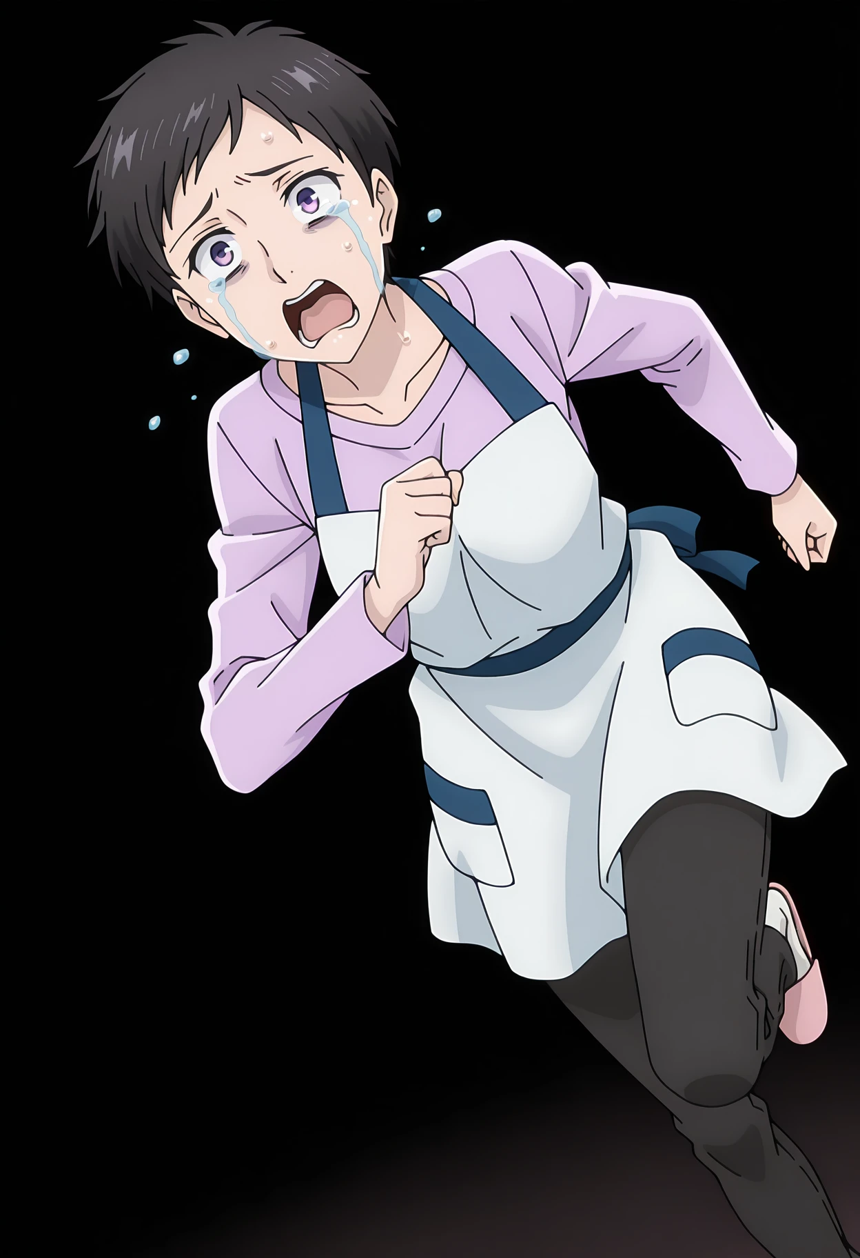 collarbone, purple shirt, long sleeves, apron, black pants, white socks, slippers