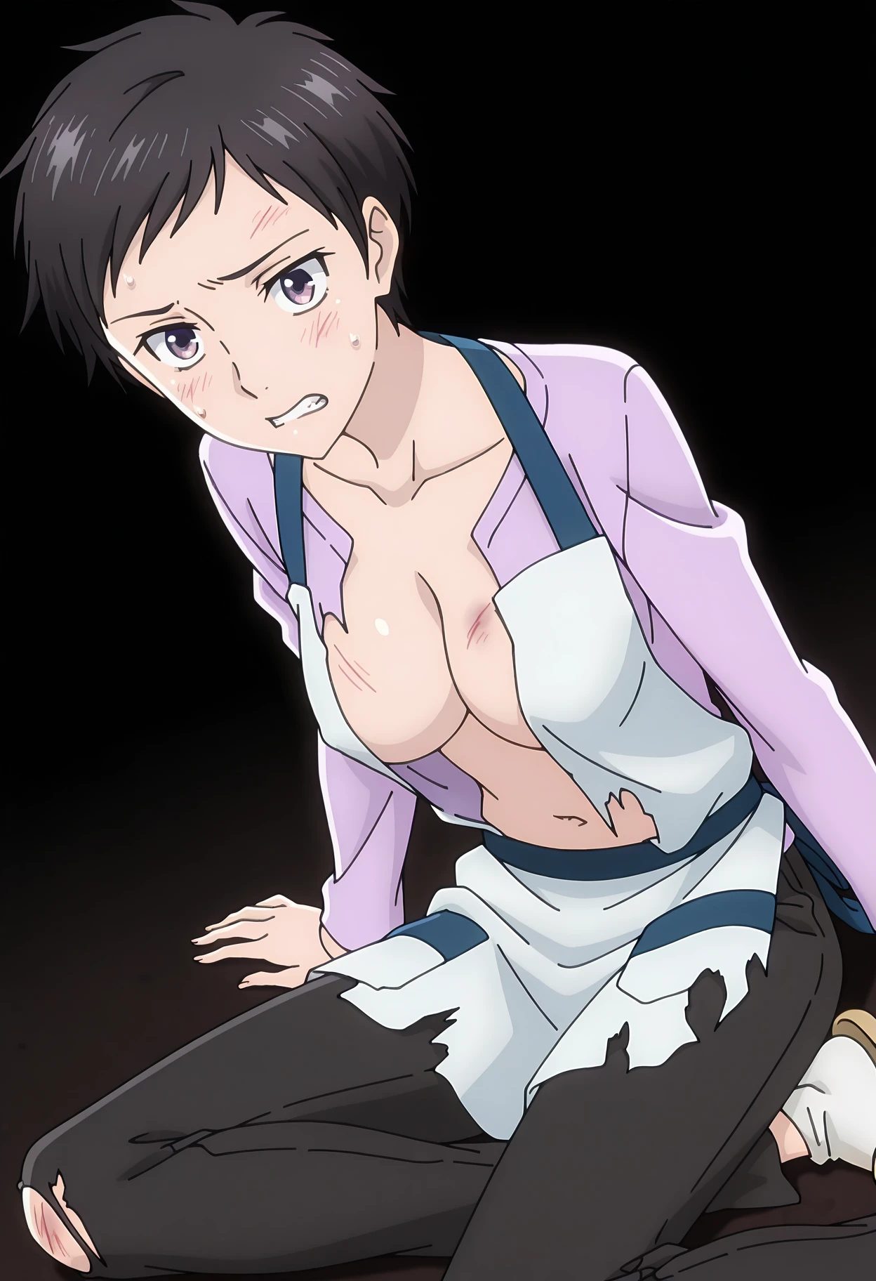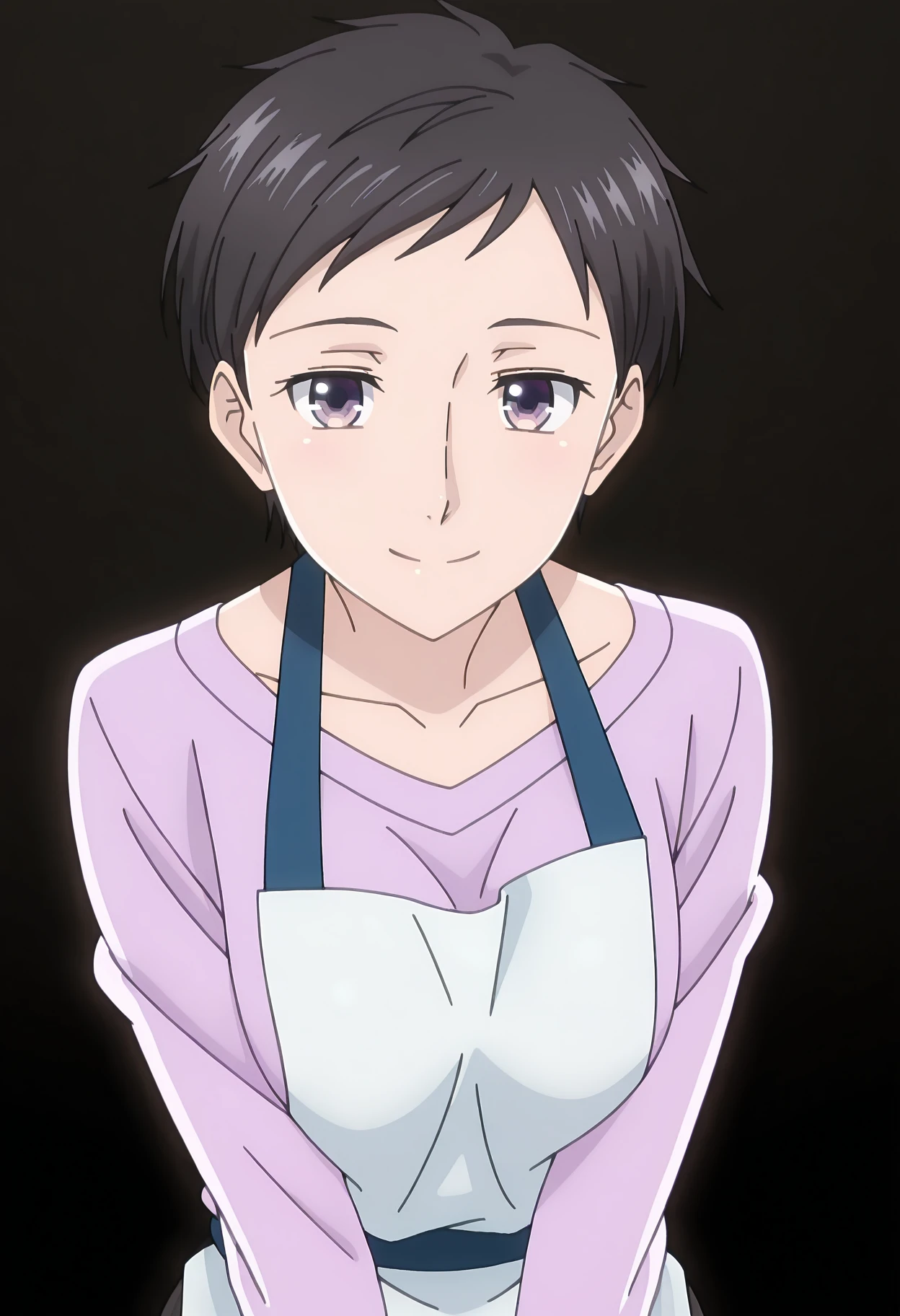 1girl, arima yuriko, mature female, short hair, black hair, purple eyes, small breasts