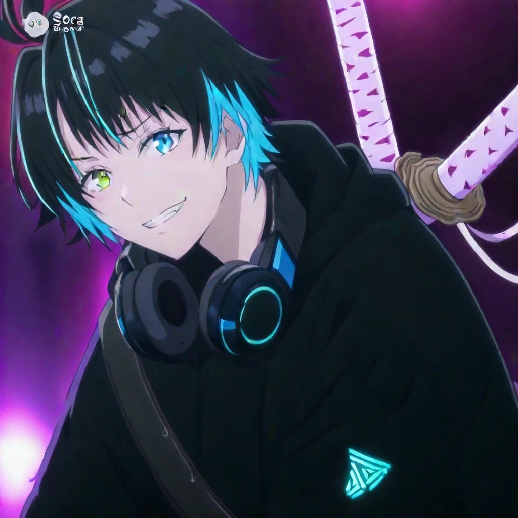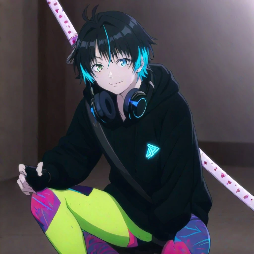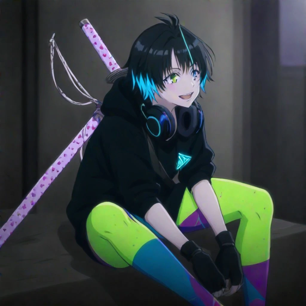 “Young anime female with short black hair featuring teal highlights, pale skin, sharp eyes, wearing a loose black hoodie, neon green leggings, fingerless black gloves, and a katana strapped diagonally across his back.”