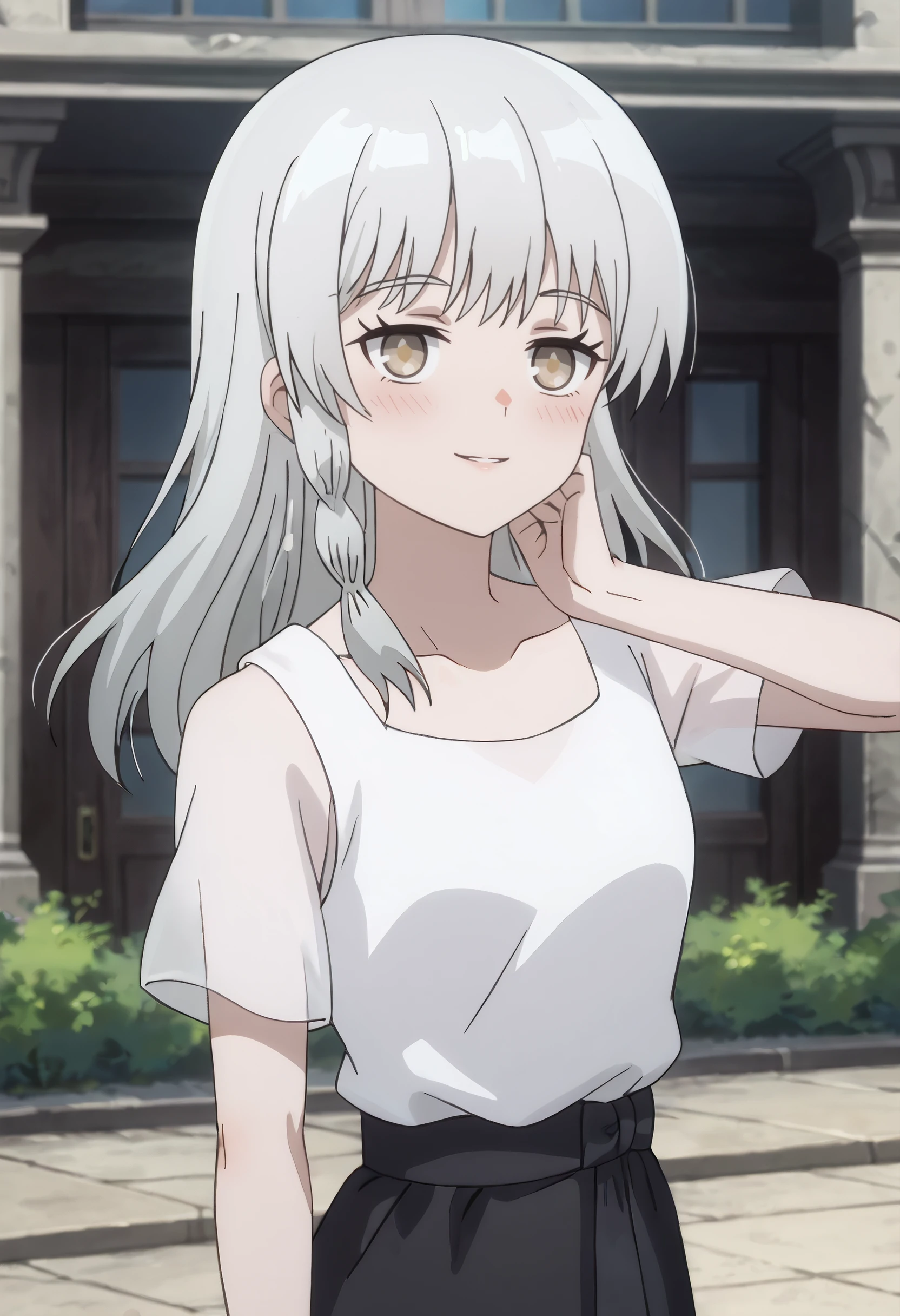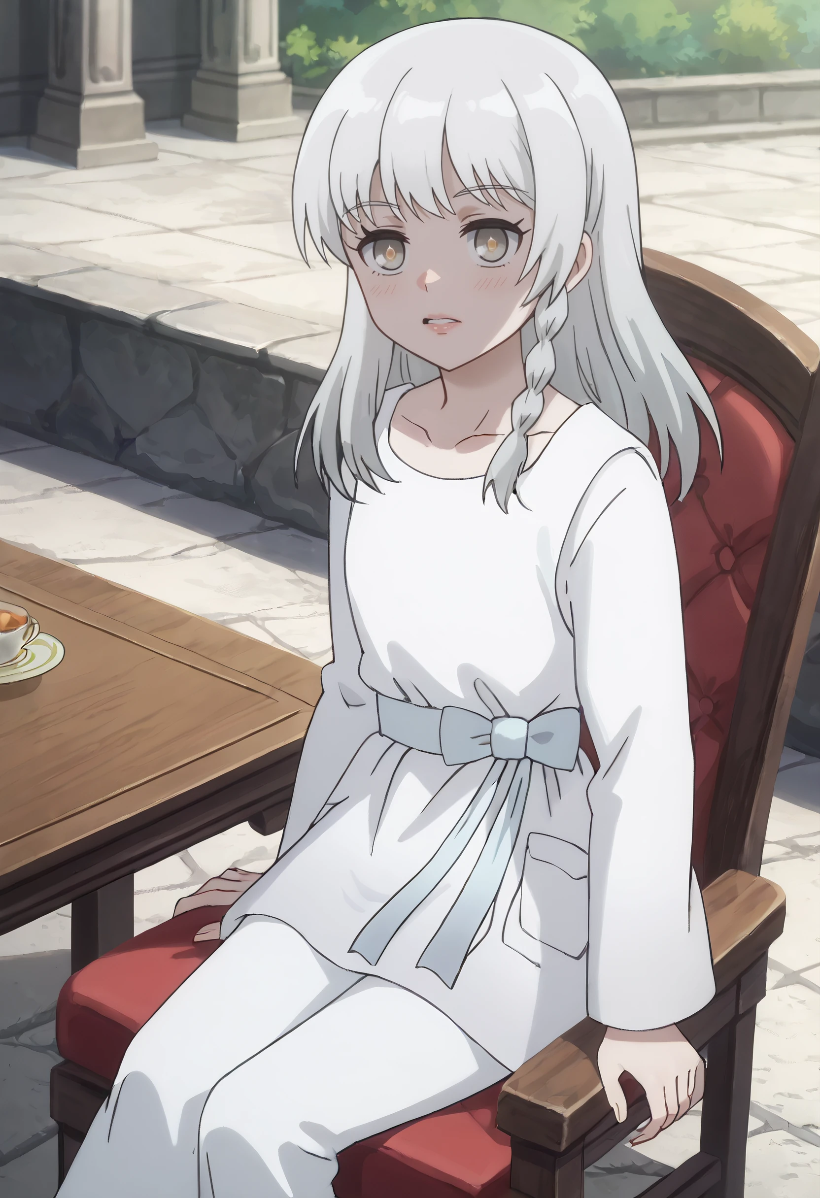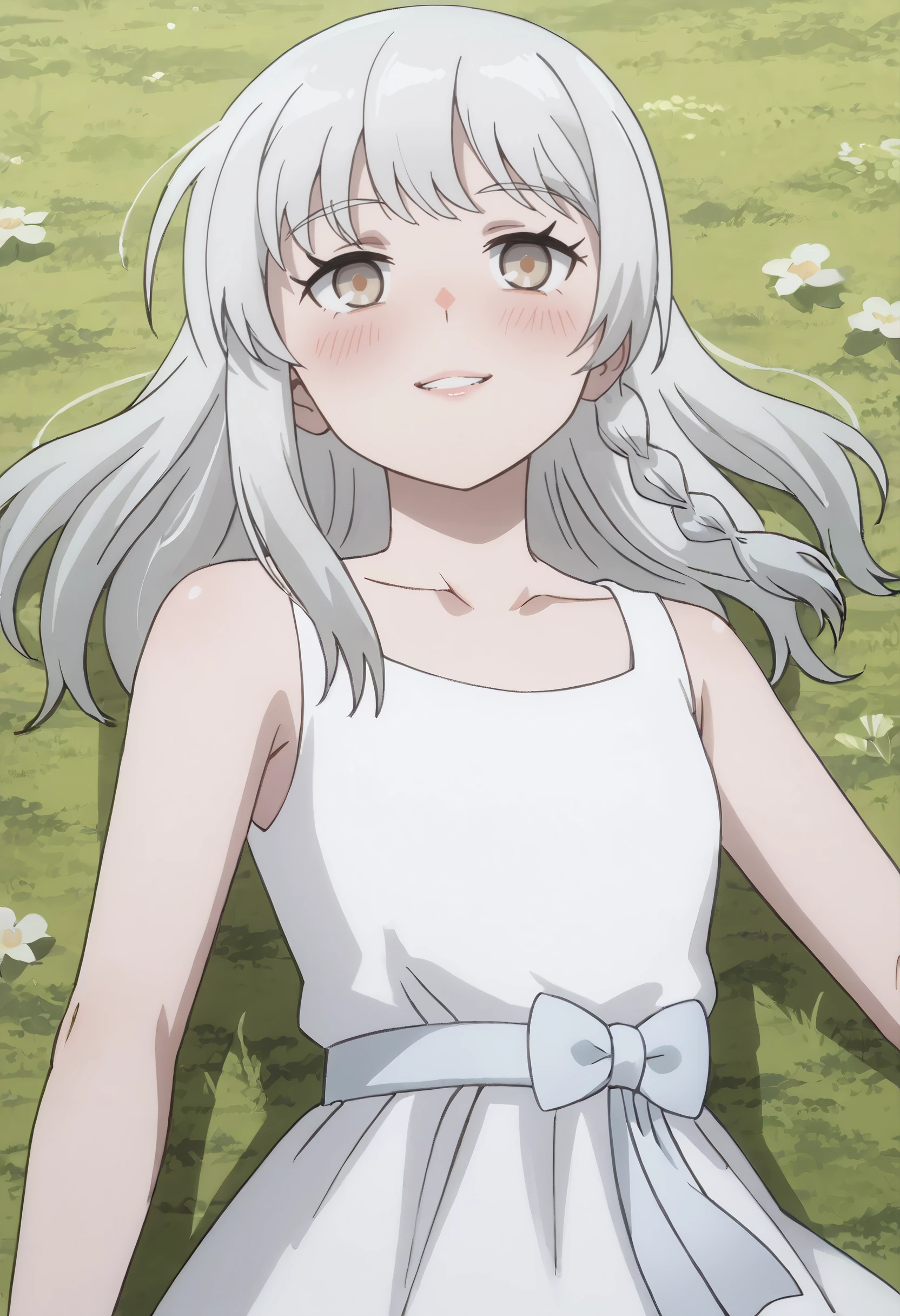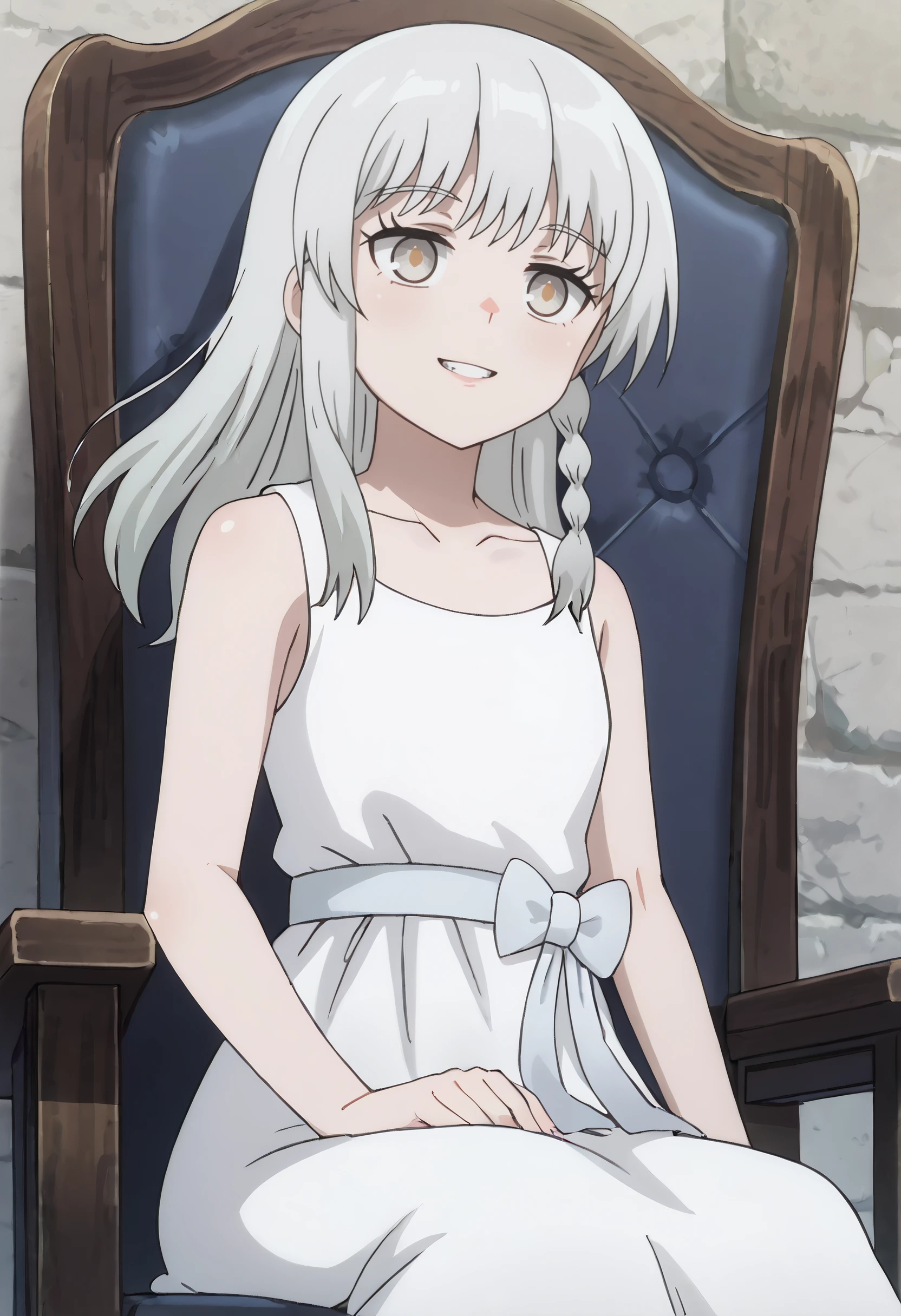 AMGSerena, long hair, bangs, braid, eyebrows visible through hair, brown eyes, white hair,