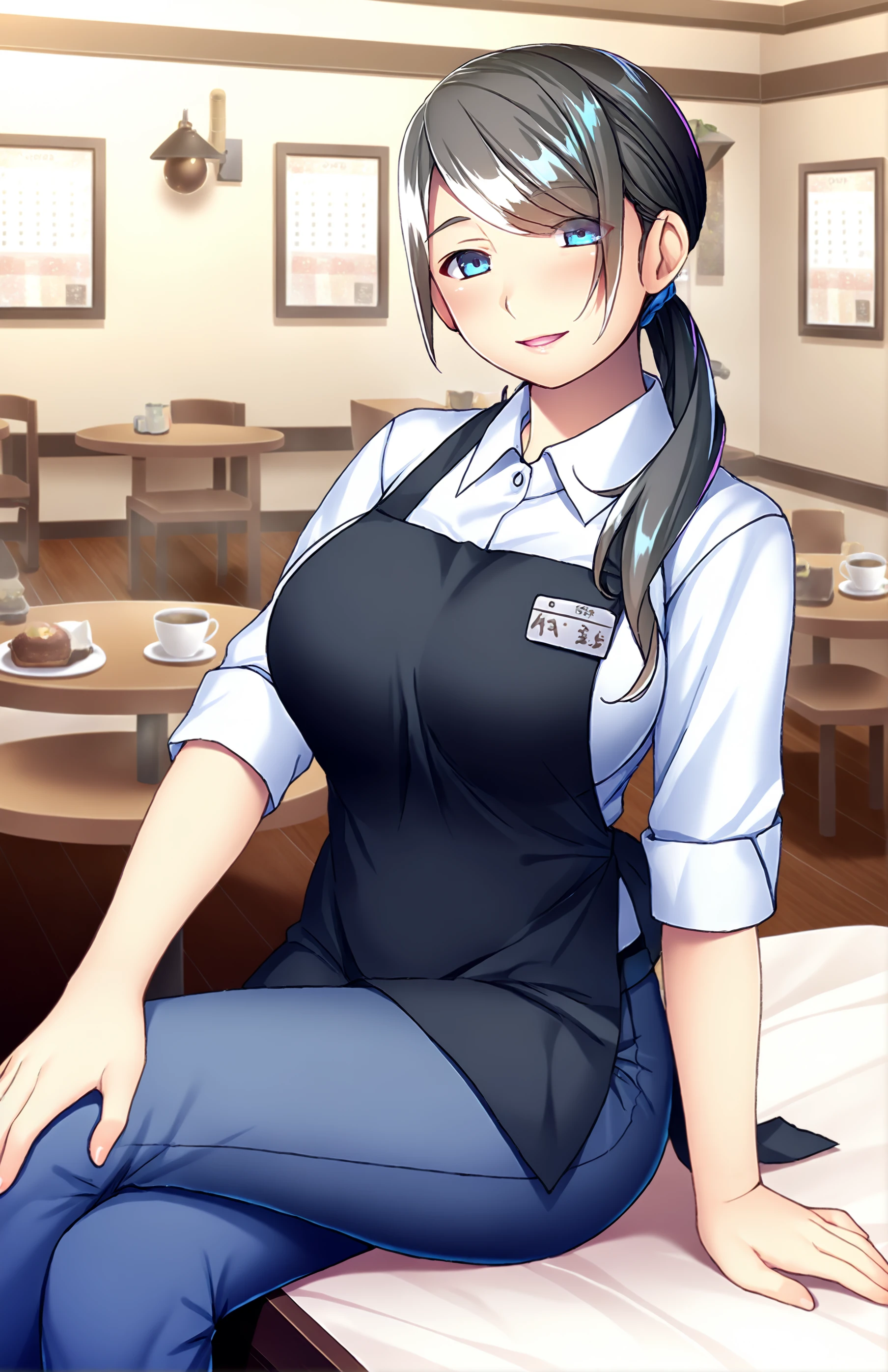 MoribuchiAyaka, long hair, breasts, wrinkles, blue eyes, large breasts, black hair, ponytail, black apron, bed, name tag, white shirt, collared shirt, pants