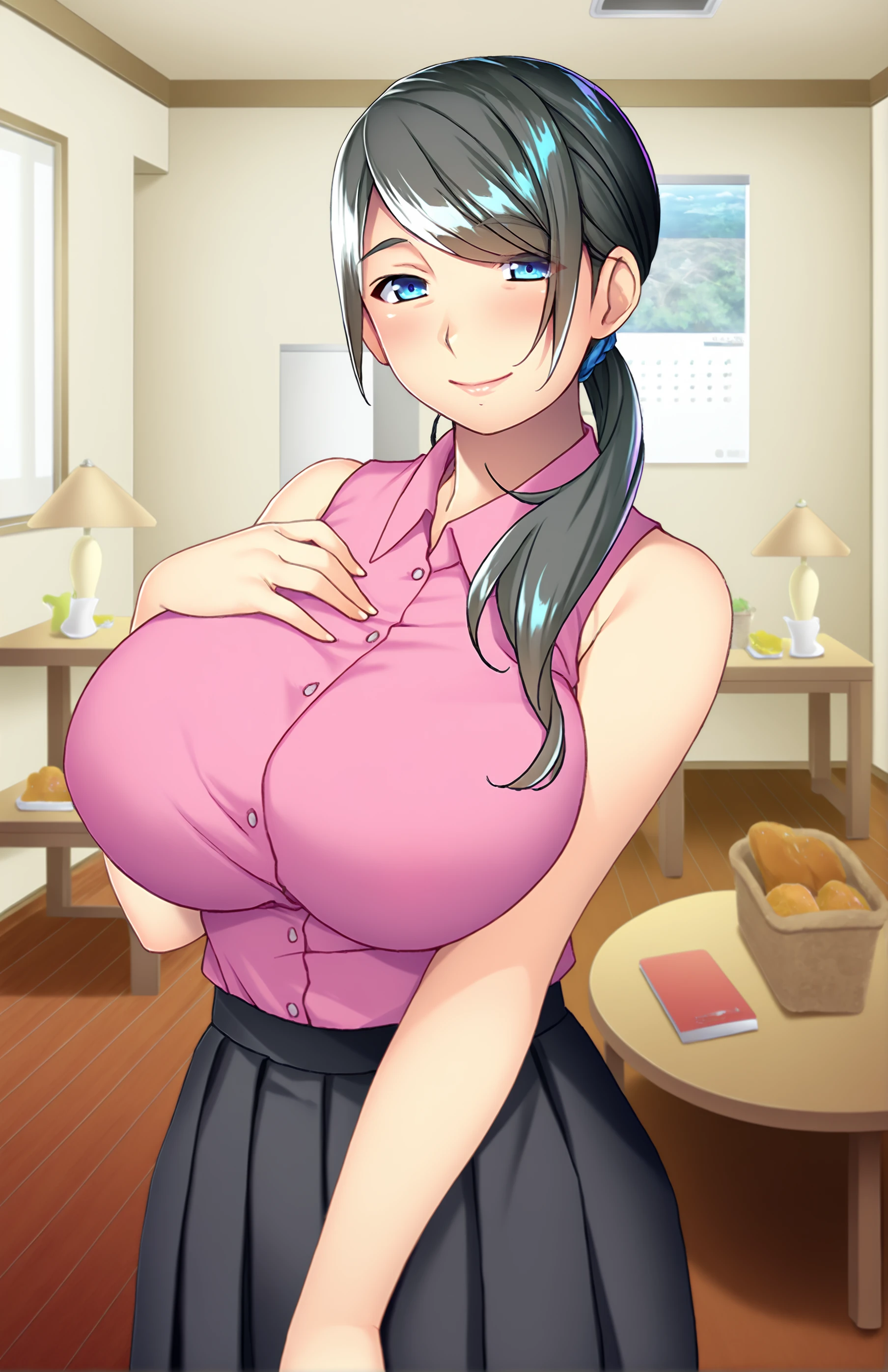 MoribuchiAyaka, long hair, breasts, wrinkles, blue eyes, skirt, large breasts, shirt, black hair, bare shoulders, ponytail, sleeveless, huge breasts, sleeveless shirt, pink shirt, untucked shirt, black skirt, pleated skirt, mature female