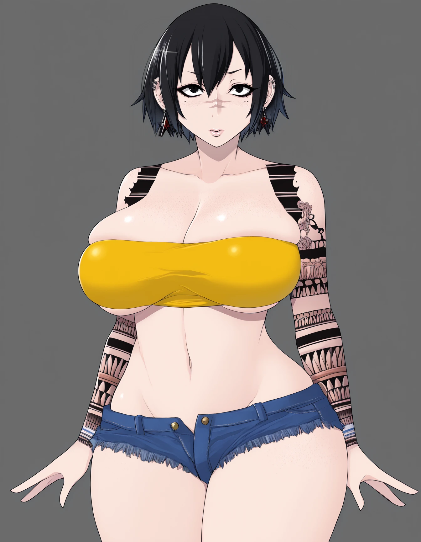 "ryontm, short hair, jewelry, arm tattoo, black hair, scar on nose, earrings, ear piercing "