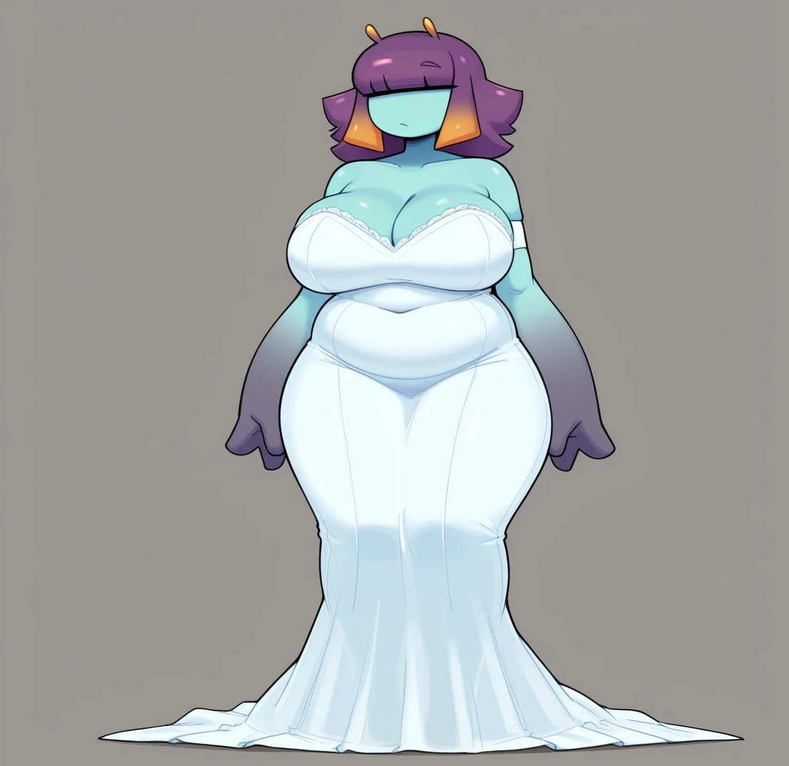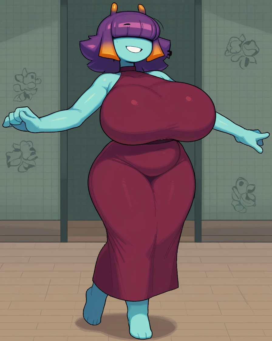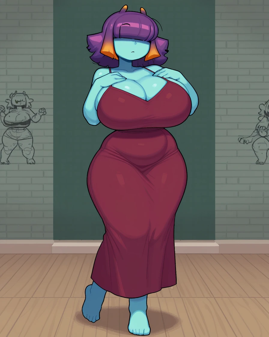 Purple hair, multicolored hair, orange hair, gradient hair, colored skin, monster girl, curvy, plump, blue skin, belly,