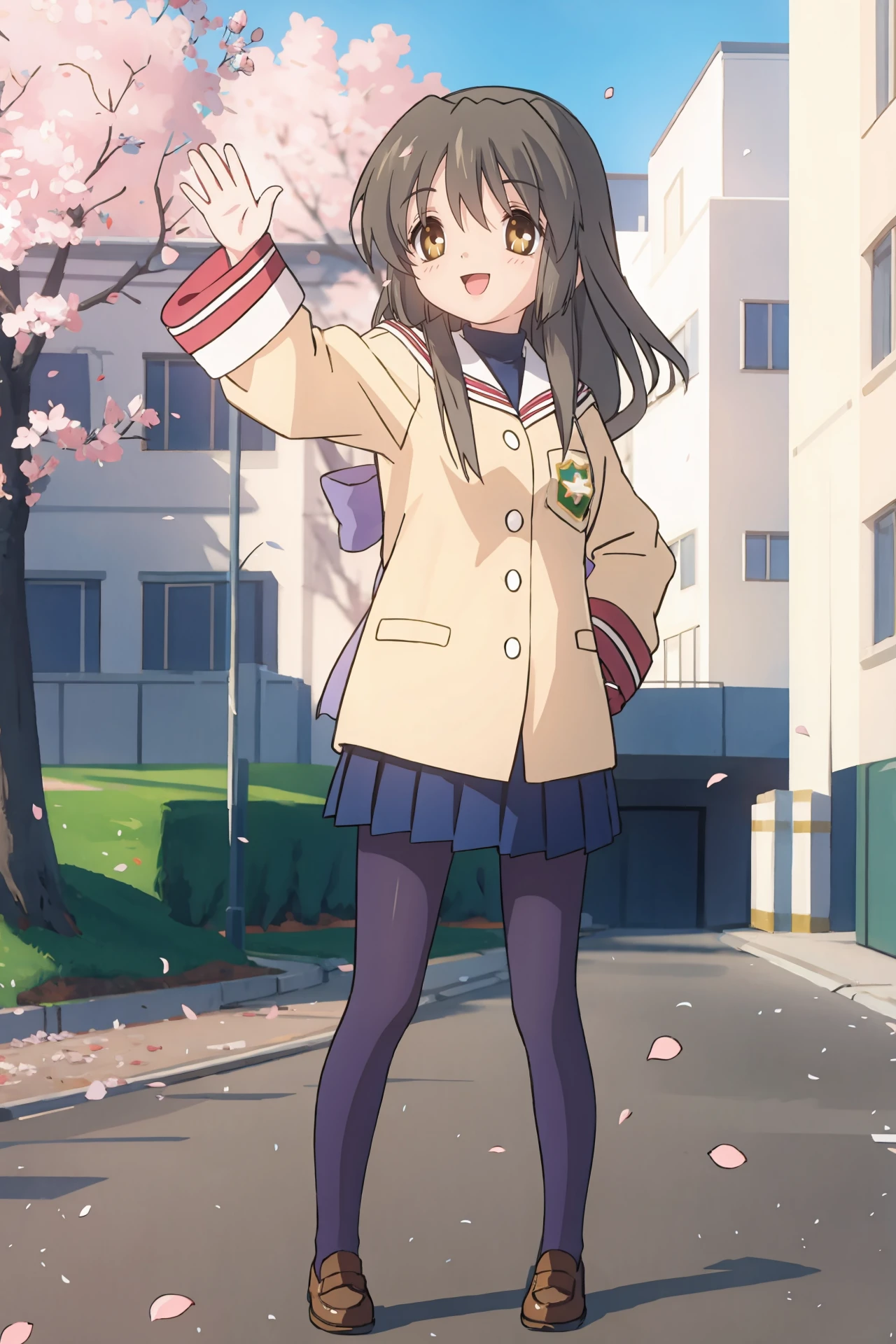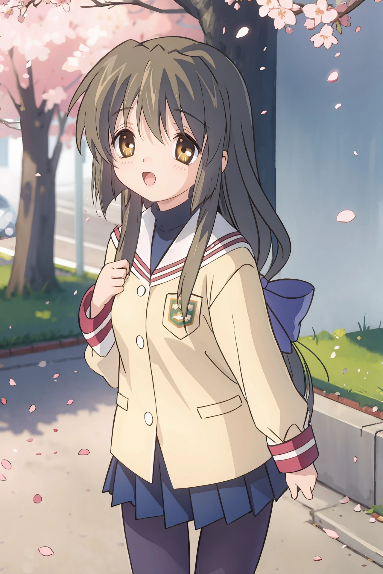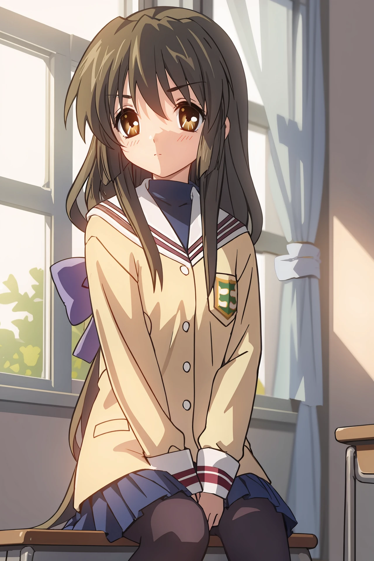 Additional prompts for the most seen costume: blue hair bow, low-tied long hair, navy turtleneck, yellow blazer, blue pleated skirt, navy pantyhose, loafers