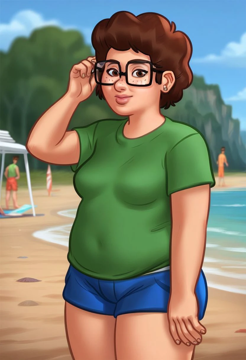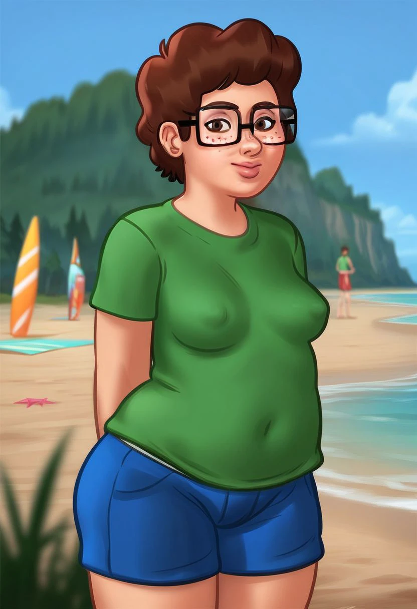 1girl, freckles, brown eyes, fat, chubby, glasses, green shirt, t-shirt, blue shorts, small breasts