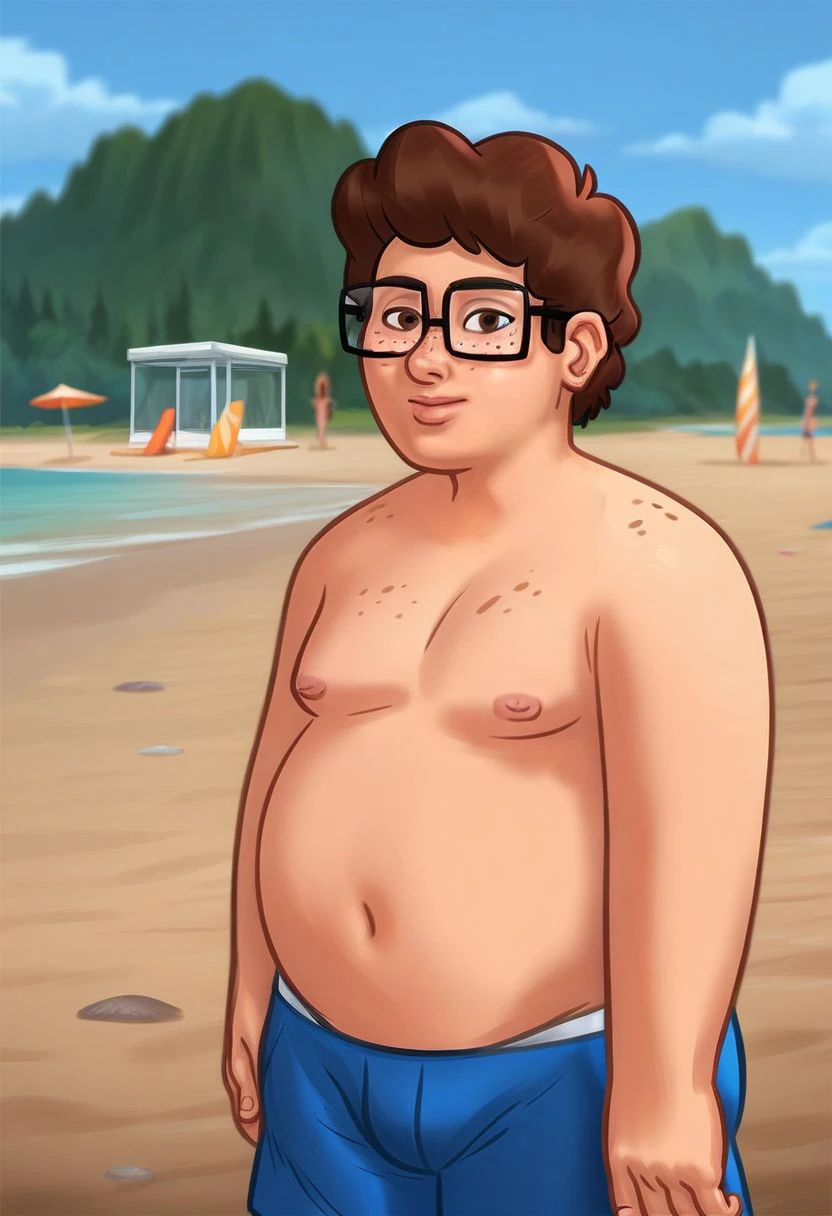 1boy, freckles, brown eyes, fat, glasses, green shirt, t-shirt, blue shorts