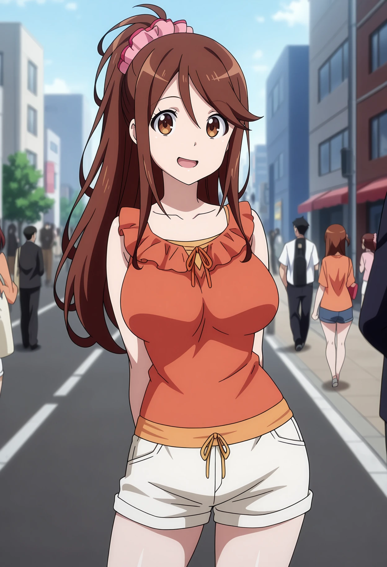 high ponytail, long hair, hair between eyes, brown hair, brown eyes, hair scrunchie, pink scrunchie