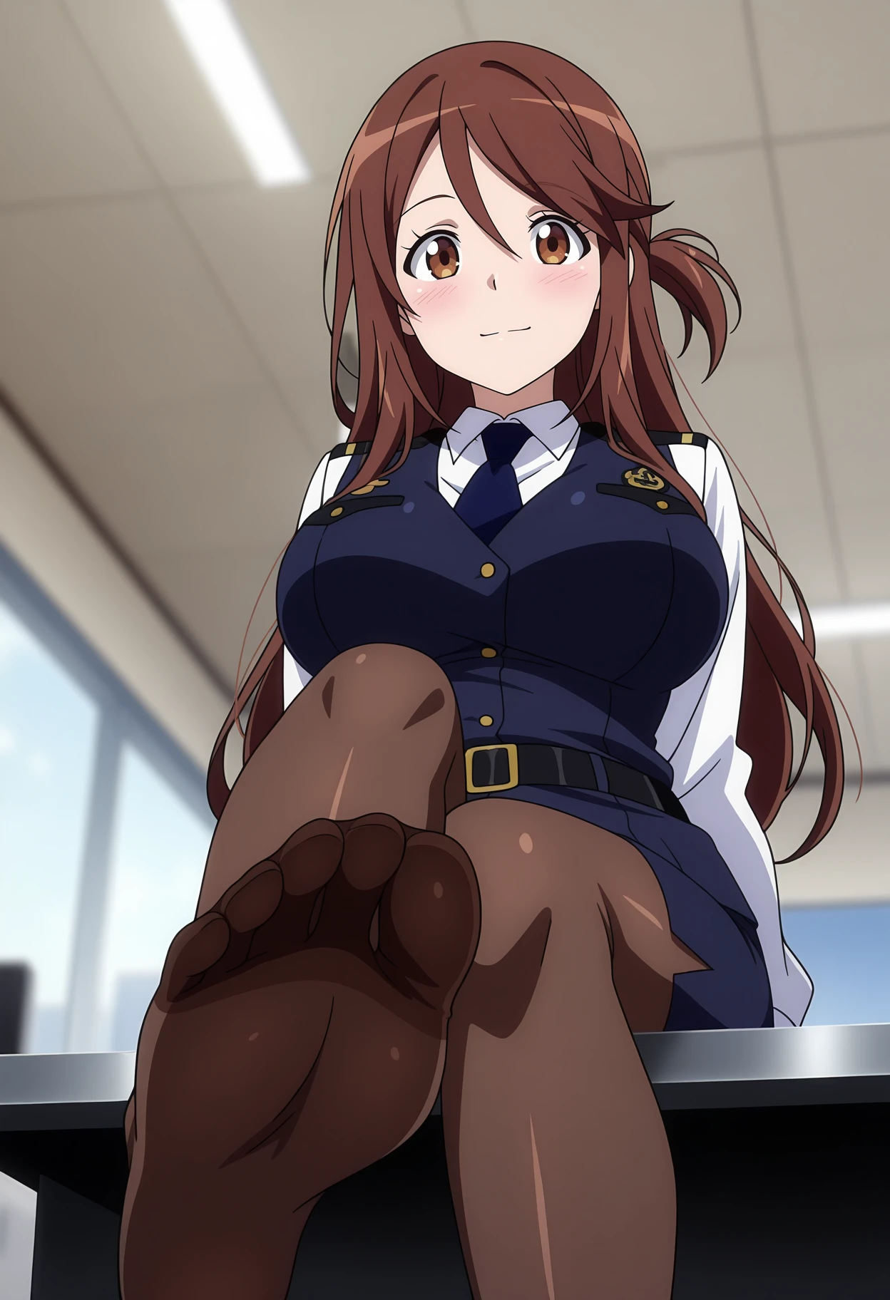 police uniform, blue jacket, long sleeves, collared shirt, white shirt, blue necktie, black belt, pencil skirt, blue skirt, brown pantyhose