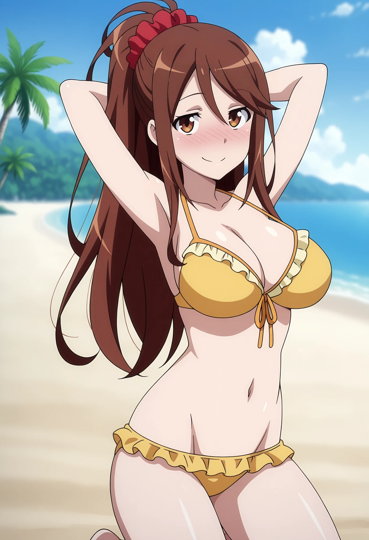 front-tie bikini top, frilled bikini, yellow bikini, large breasts, lowleg bikini