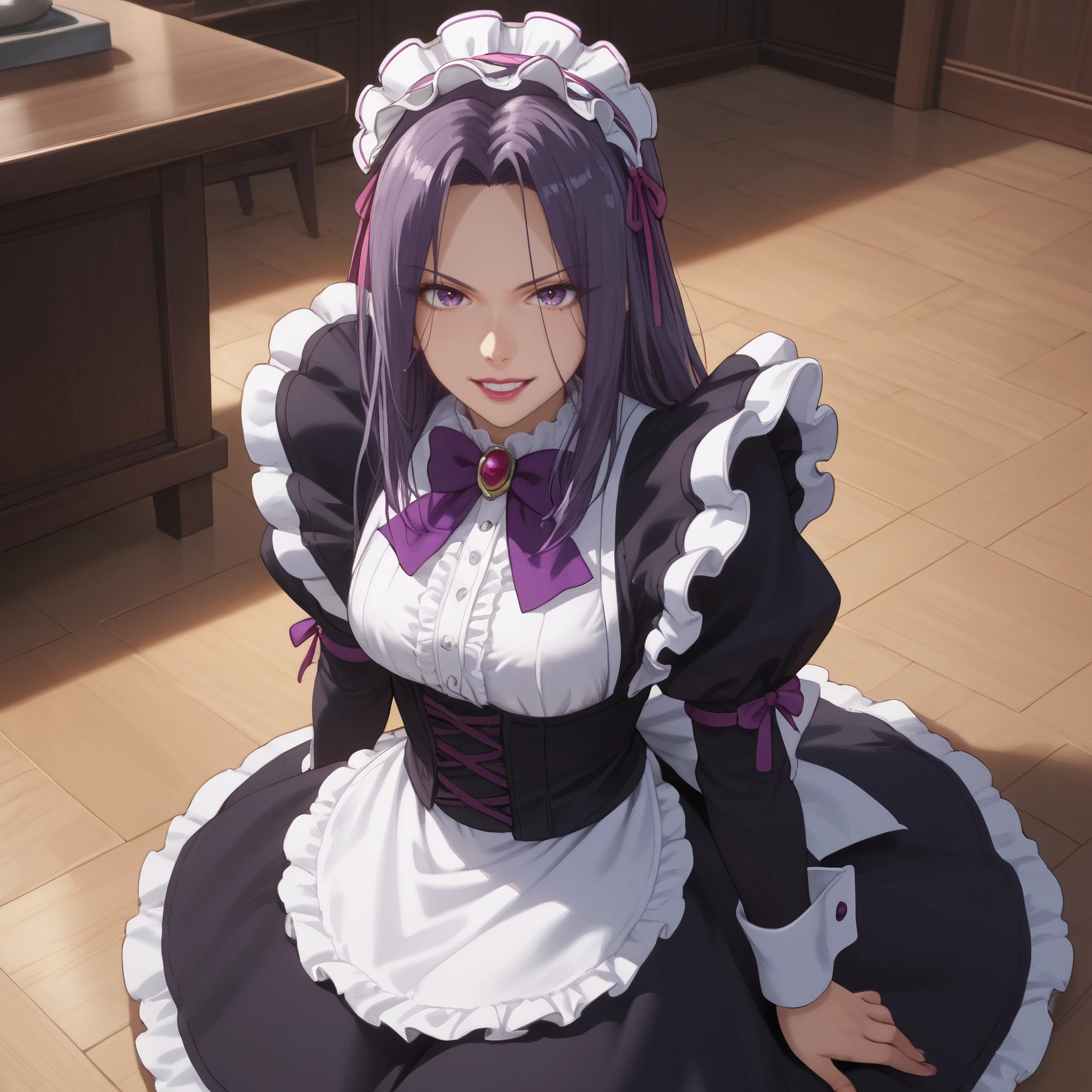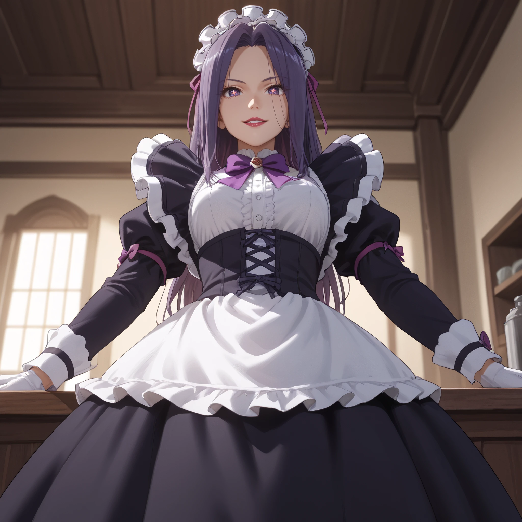 dress, maid headdress, maid, long sleeves, frills, enmaided, fur trim, apron, fur collar, maid apron, gloves, puffy sleeves, black dress,