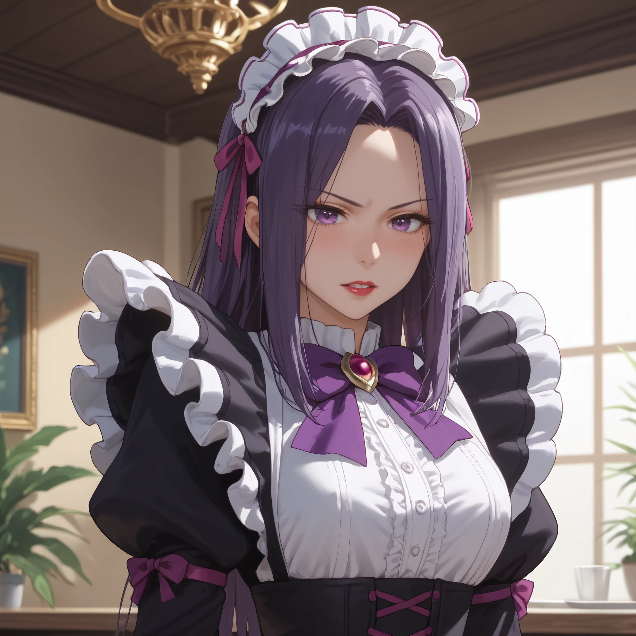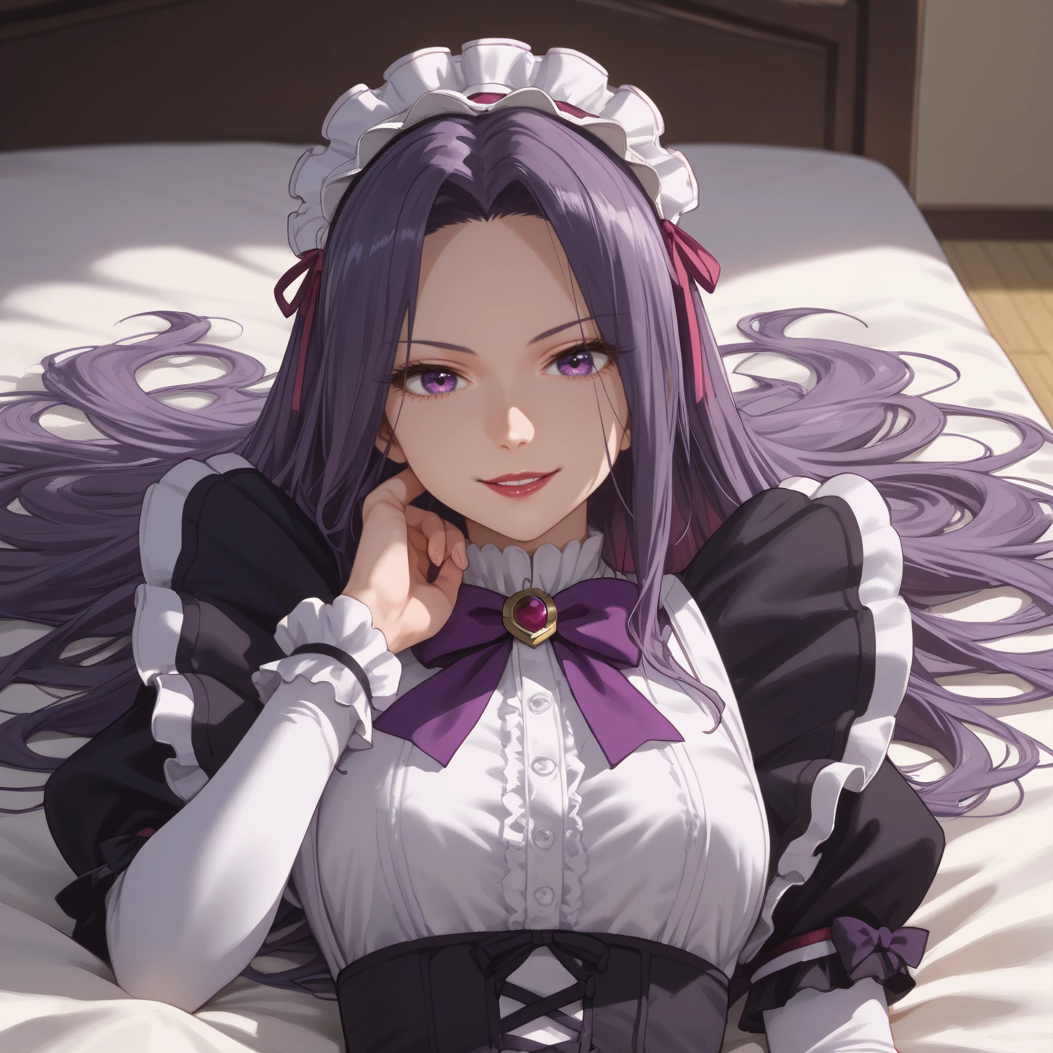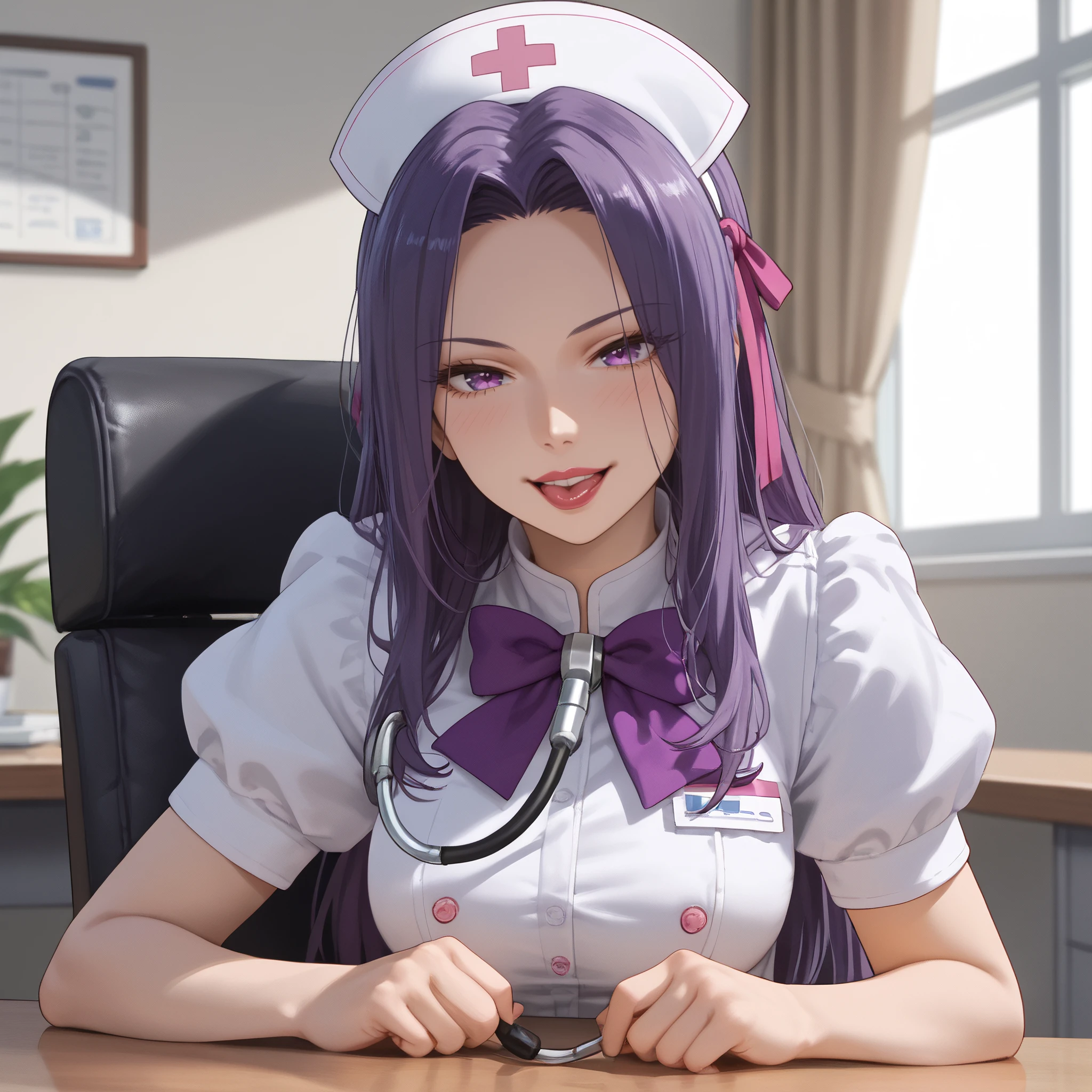 AMWNagi, long hair, purple hair, purple eyes, ribbon, bangs, hair ribbon, very long hair, bow, parted bangs, lipstick, purple bow, hairband,