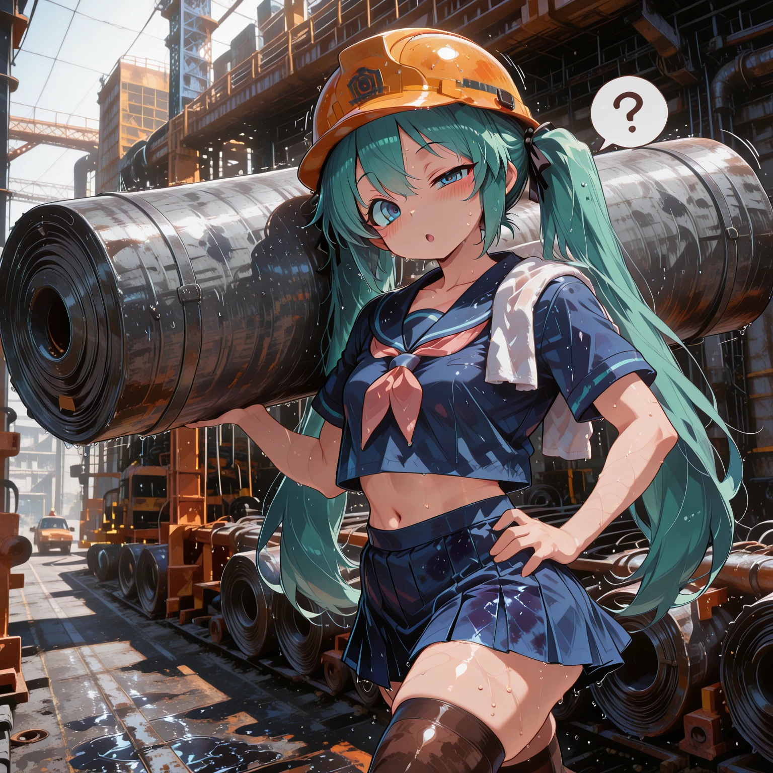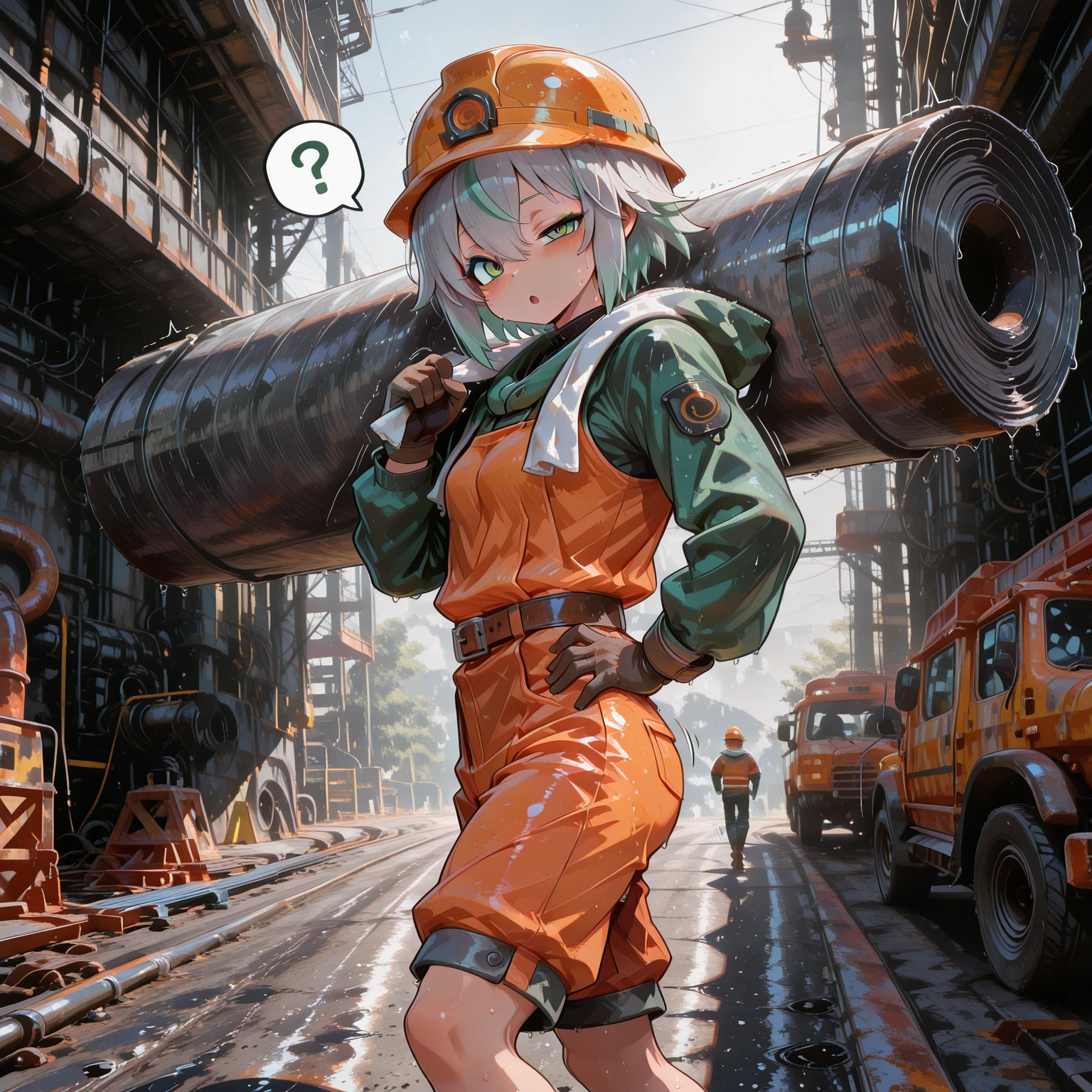 wet,outdoors,Construction Site,sunshine,orange hard hat ,towel on shoulder,stained clothes,stain,sweat,blushLet's see what you guys can do with this creepy LoRA.Please post work photos of your adorable waifu directly below—it'll generate some free buzz for me!
