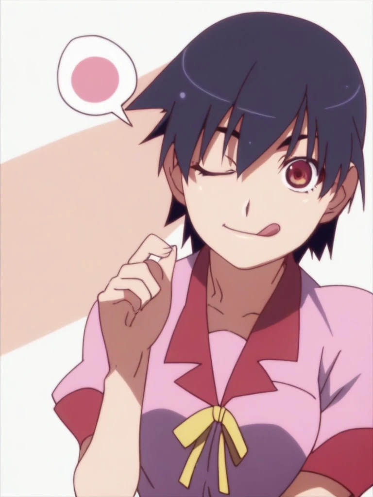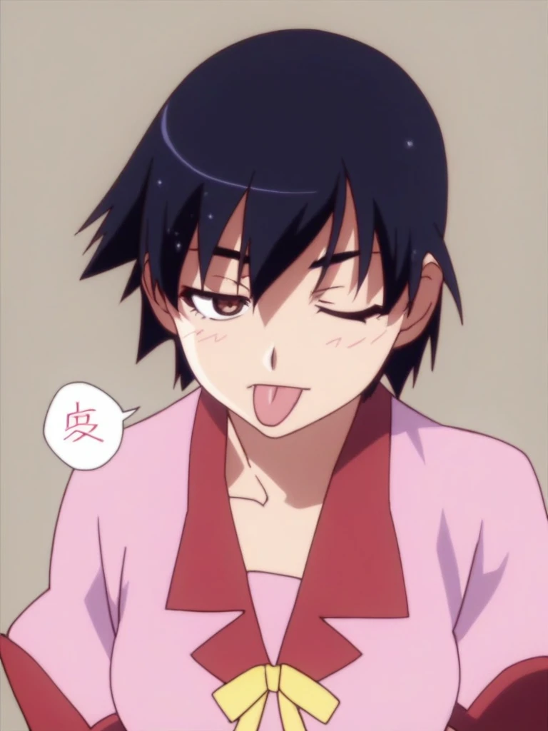 1girl, kanbaru suruga, short hair, black hair, brown eyes,