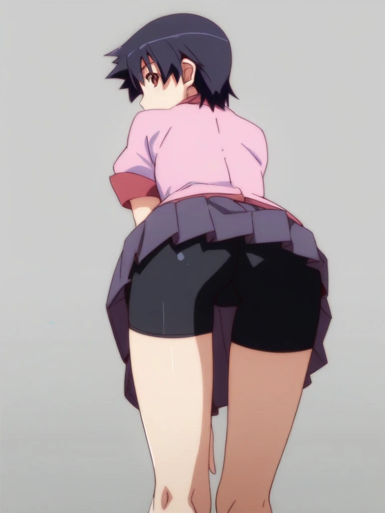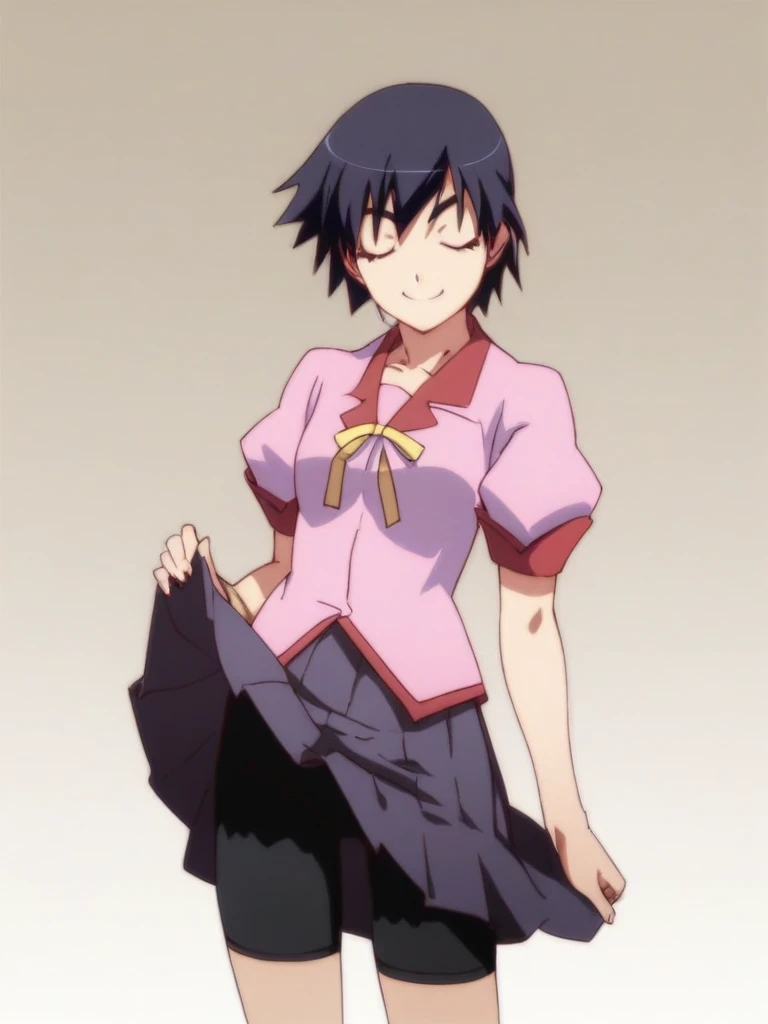 1girl, kanbaru suruga, short hair, black hair, brown eyes, naoetsu high school uniform, ribbon, pleated skirt, bike shorts
