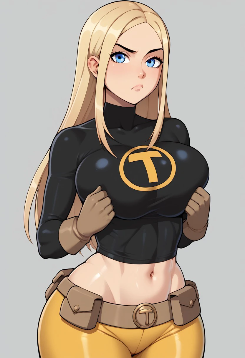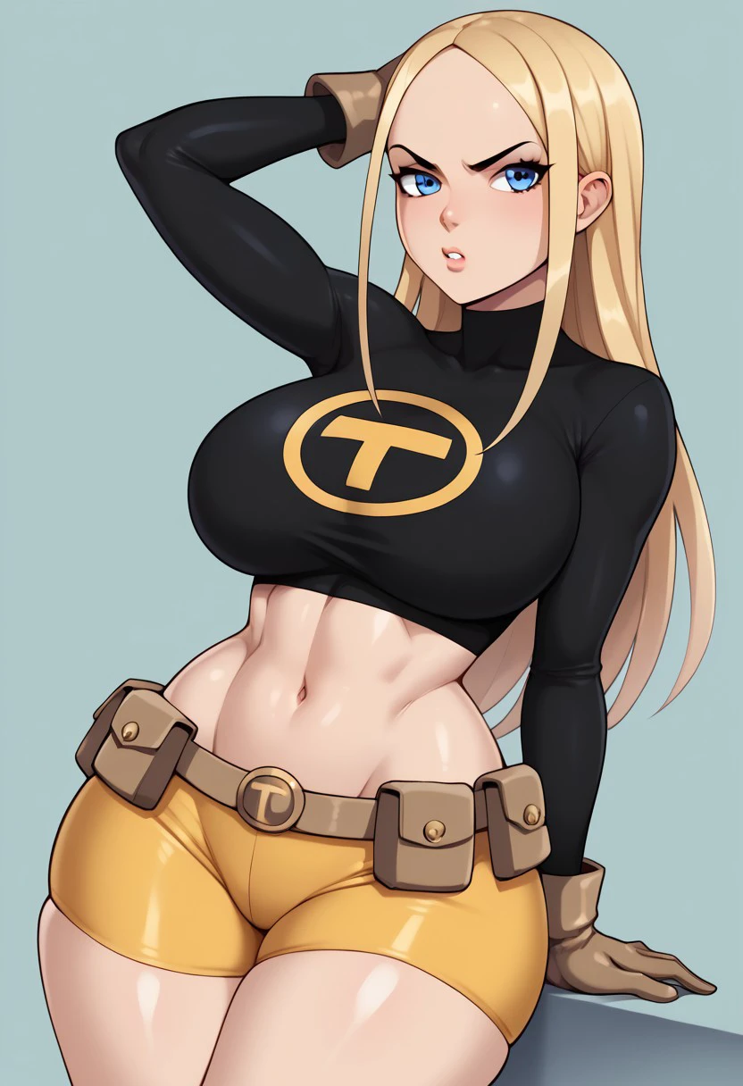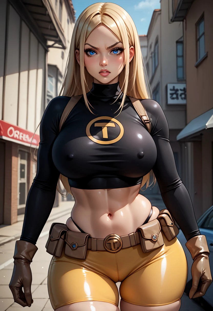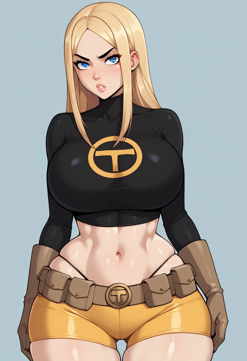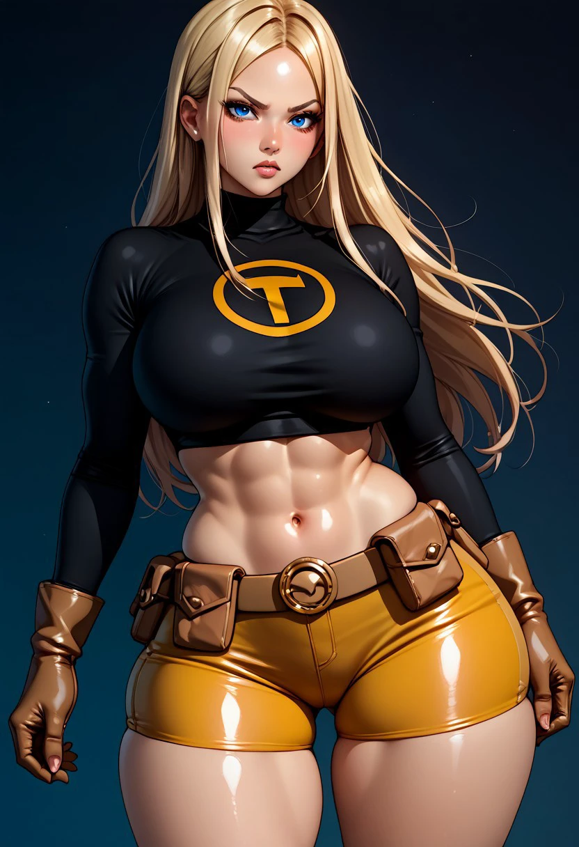 TerraTT, 1girl, blonde hair, long hair, blue eyes, forehead, parted bangs, black shirt, long sleeves, turtleneck, midriff, navel, yellow shorts, biker shorts, brown belt, brown gloves, skintight shirt, brown shoes