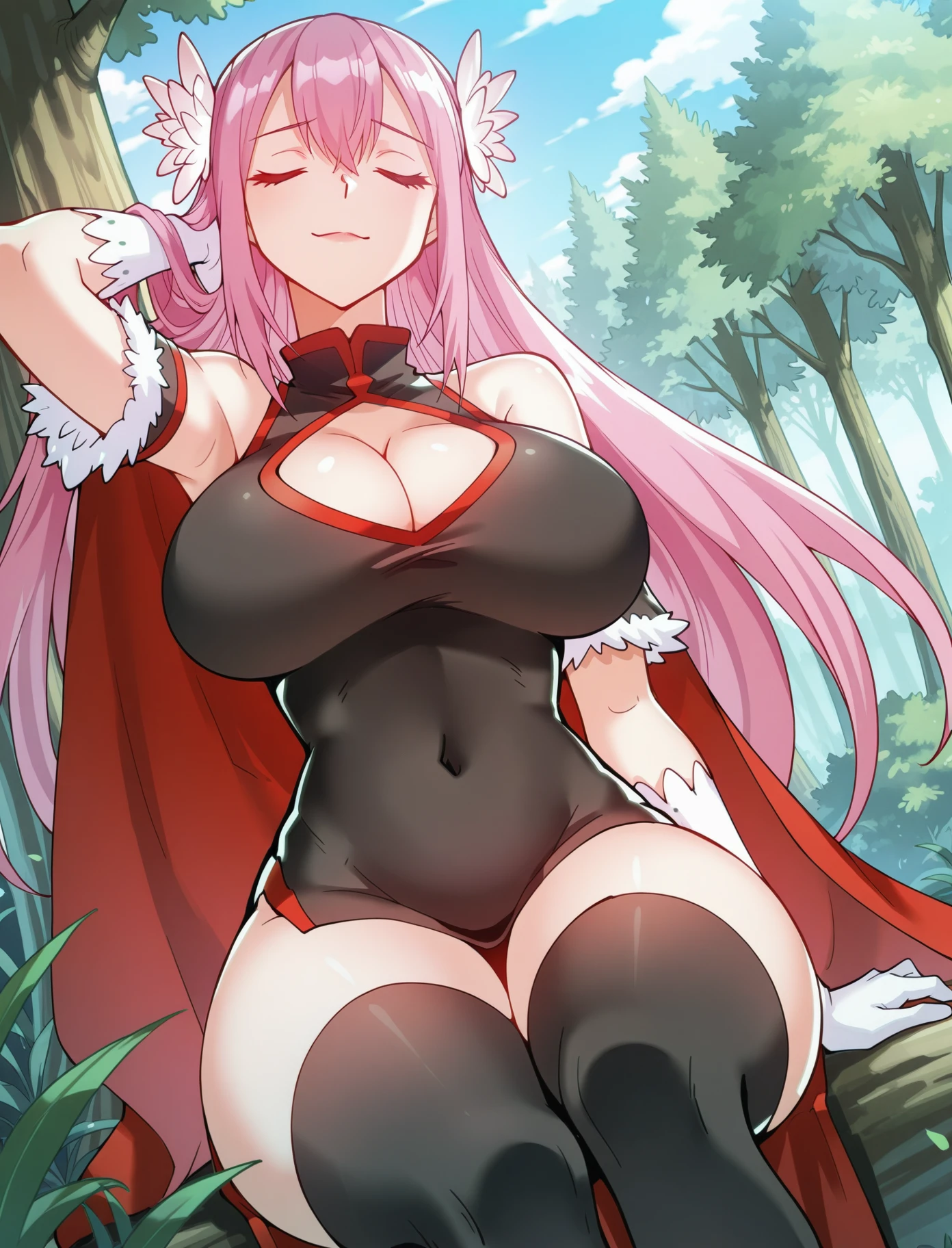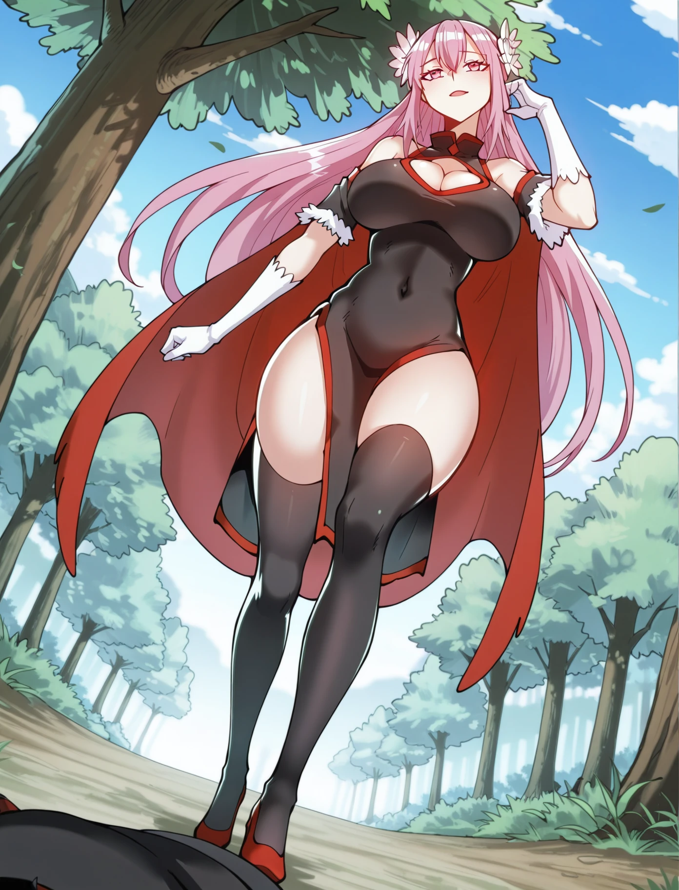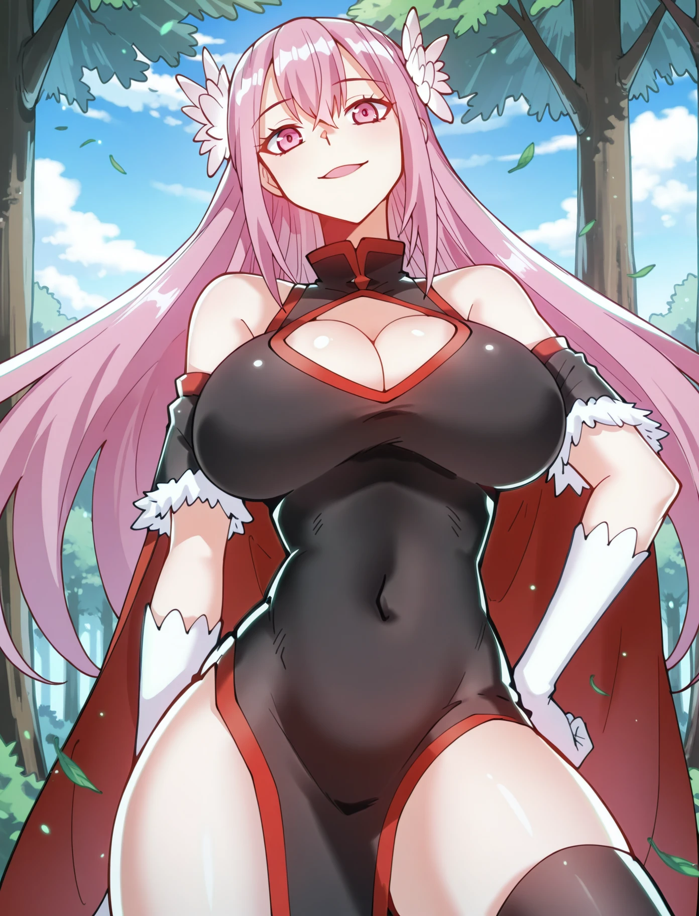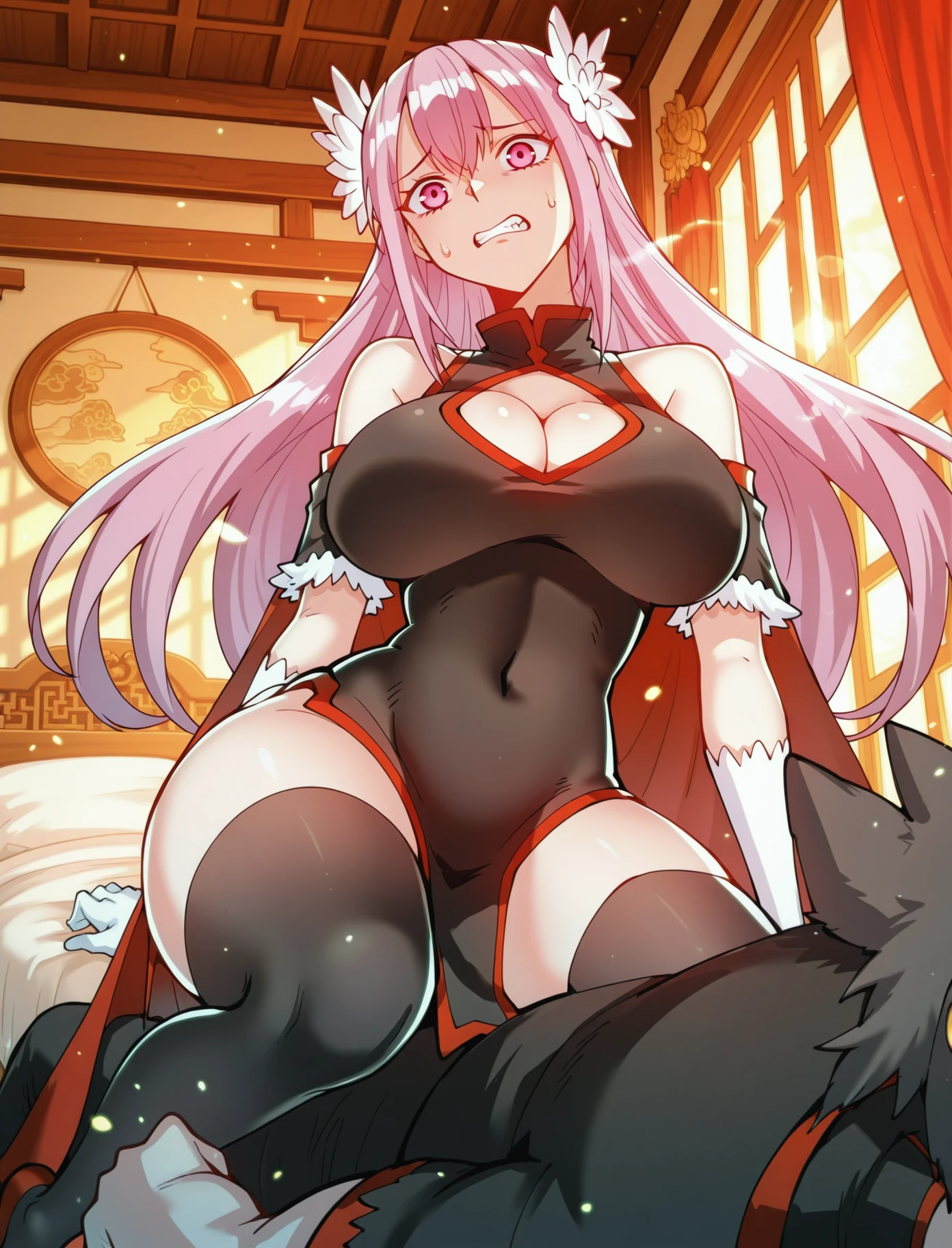 Blissful Palace Girl,long pink hair,hair ornament,pink eyes,red cape with white fur trim