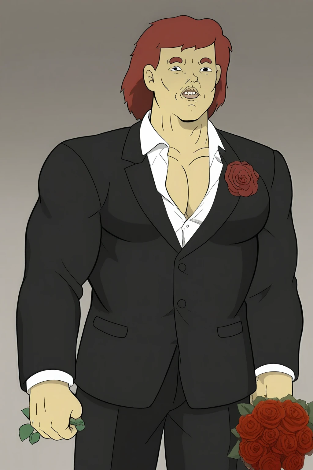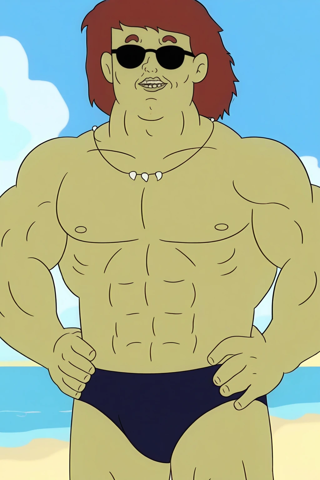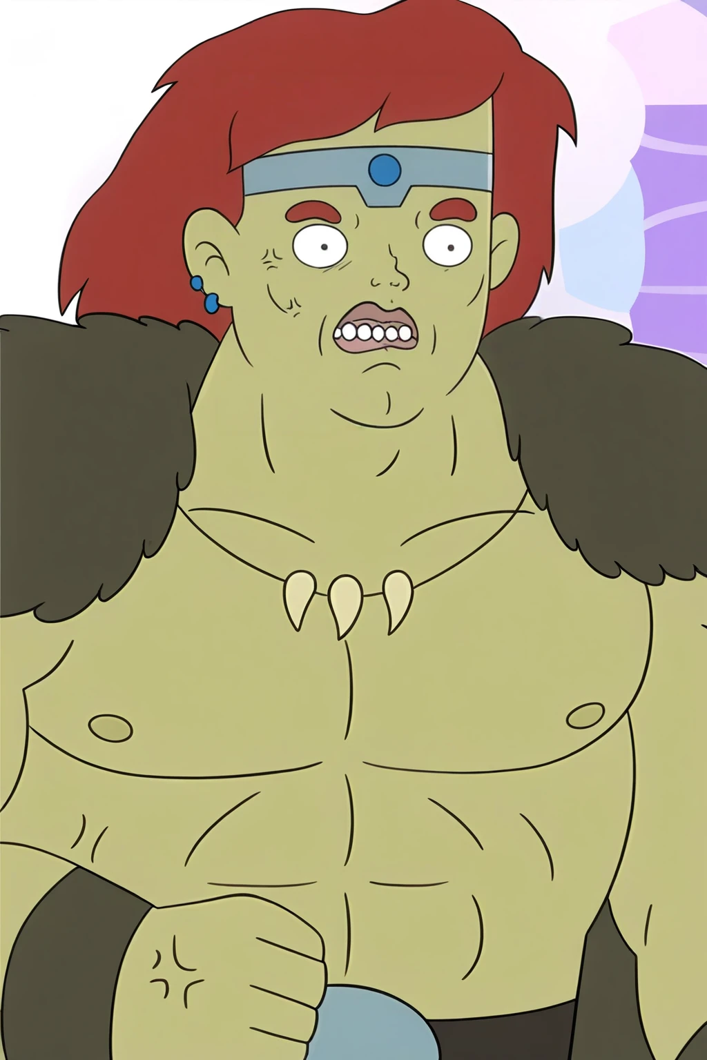 Trigger : thechaogoobarb, muscular, dark red hair, medium hair, circlet, earrings, upper teeth only, fur cape, tooth necklace, fur bracer, loincloth, belt, belt buckle, boots
