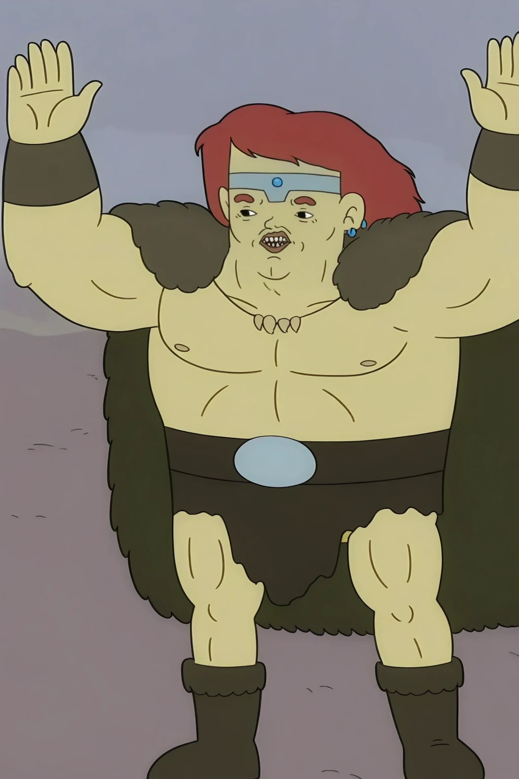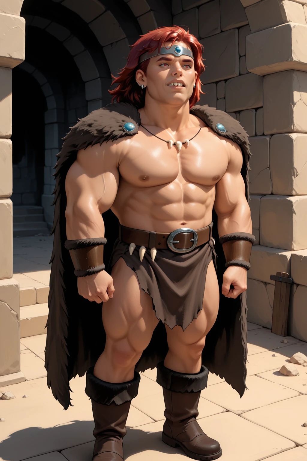 thechaogoobarb, muscular, dark red hair, medium hair, circlet, earrings, upper teeth only, fur cape, tooth necklace, fur bracer, loincloth, belt, belt buckle, boots