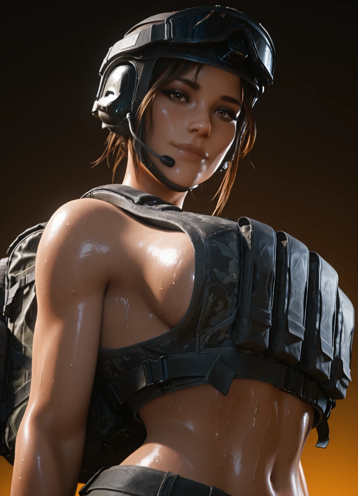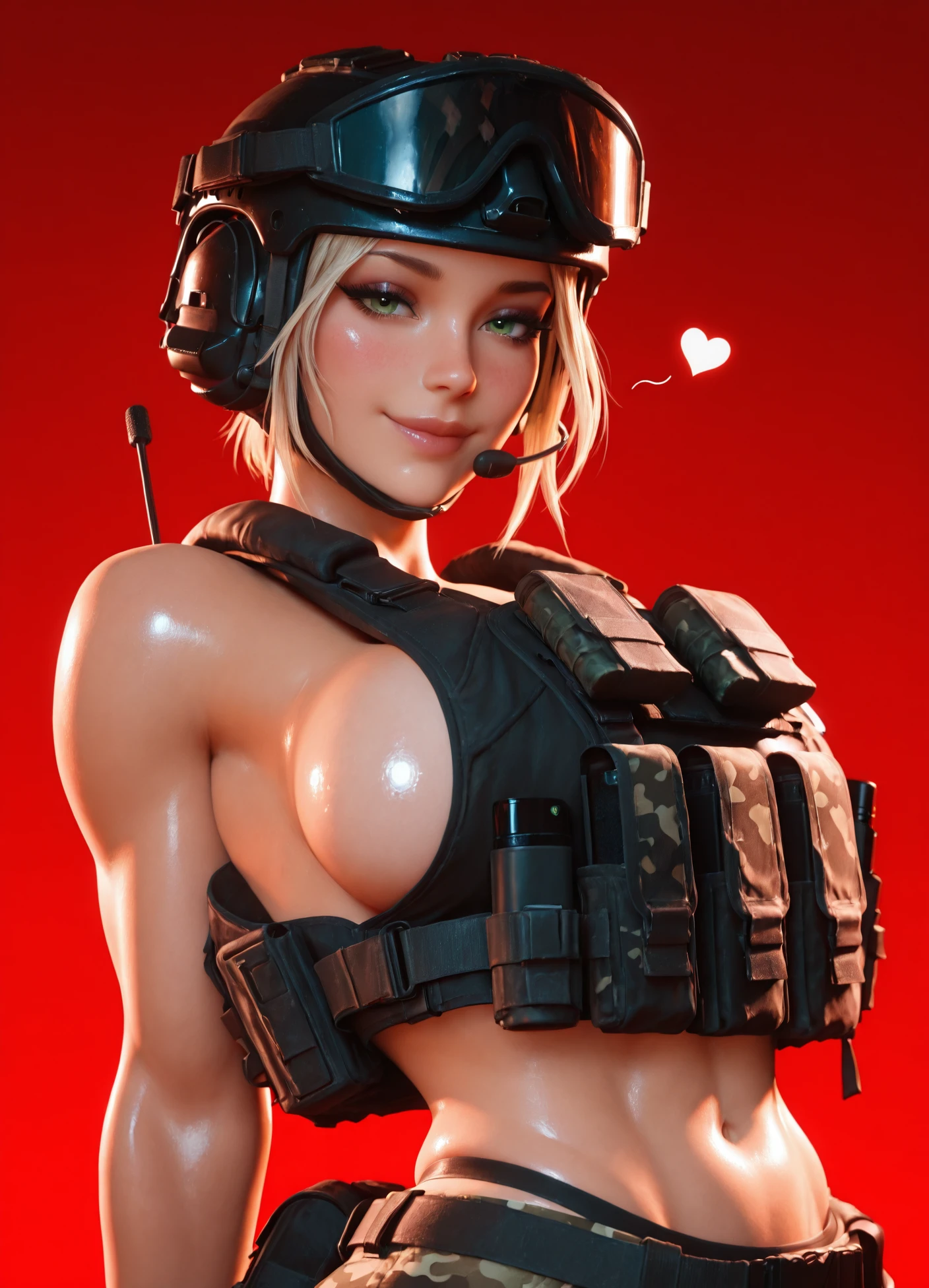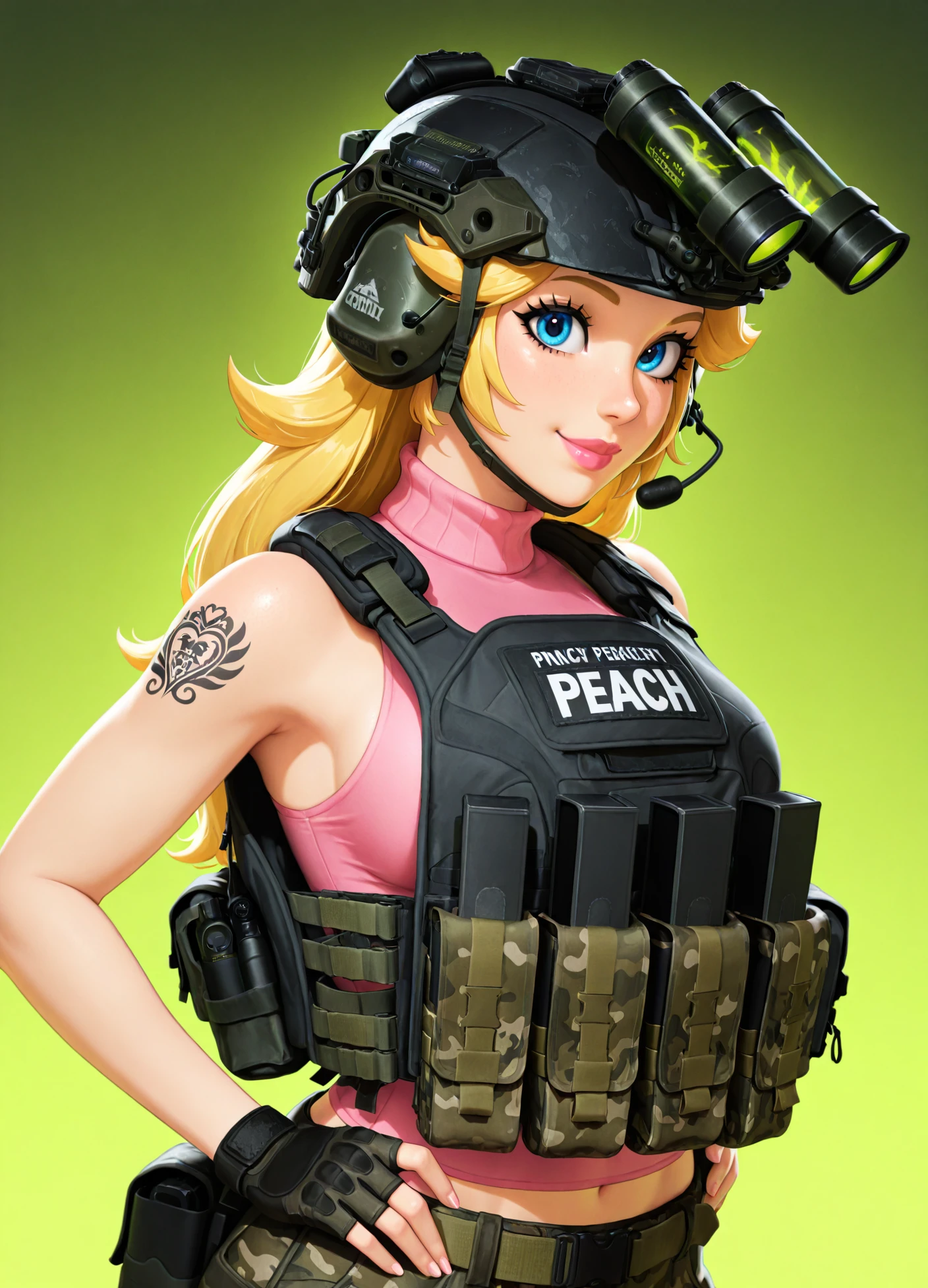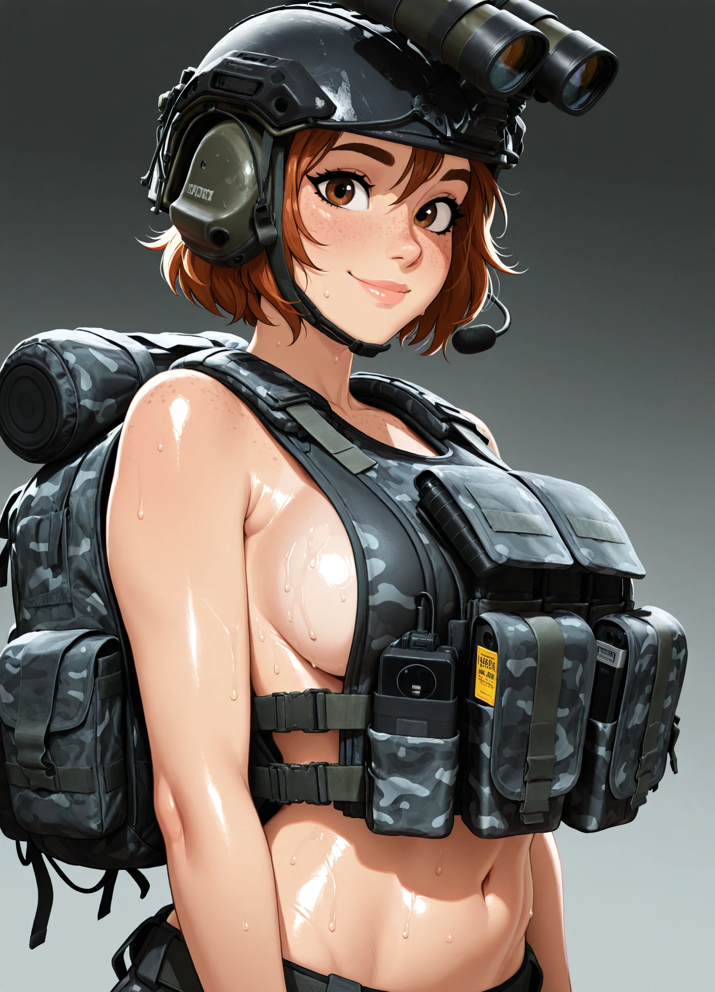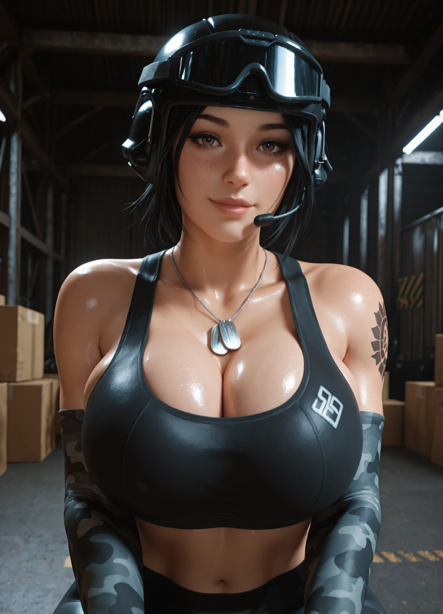 tacticool, helmet, gloves, underwear, military operator, military, load bearing vest, headset, bulletproof vest, body armor, goggles on helmet, night vision, gloves, backpack, radio, dog tags, sports bra, camouflage, elbow gloves, tattoo, watch, holster, plate carrier, body armor, boots, thigh holster, headset, combat boots,