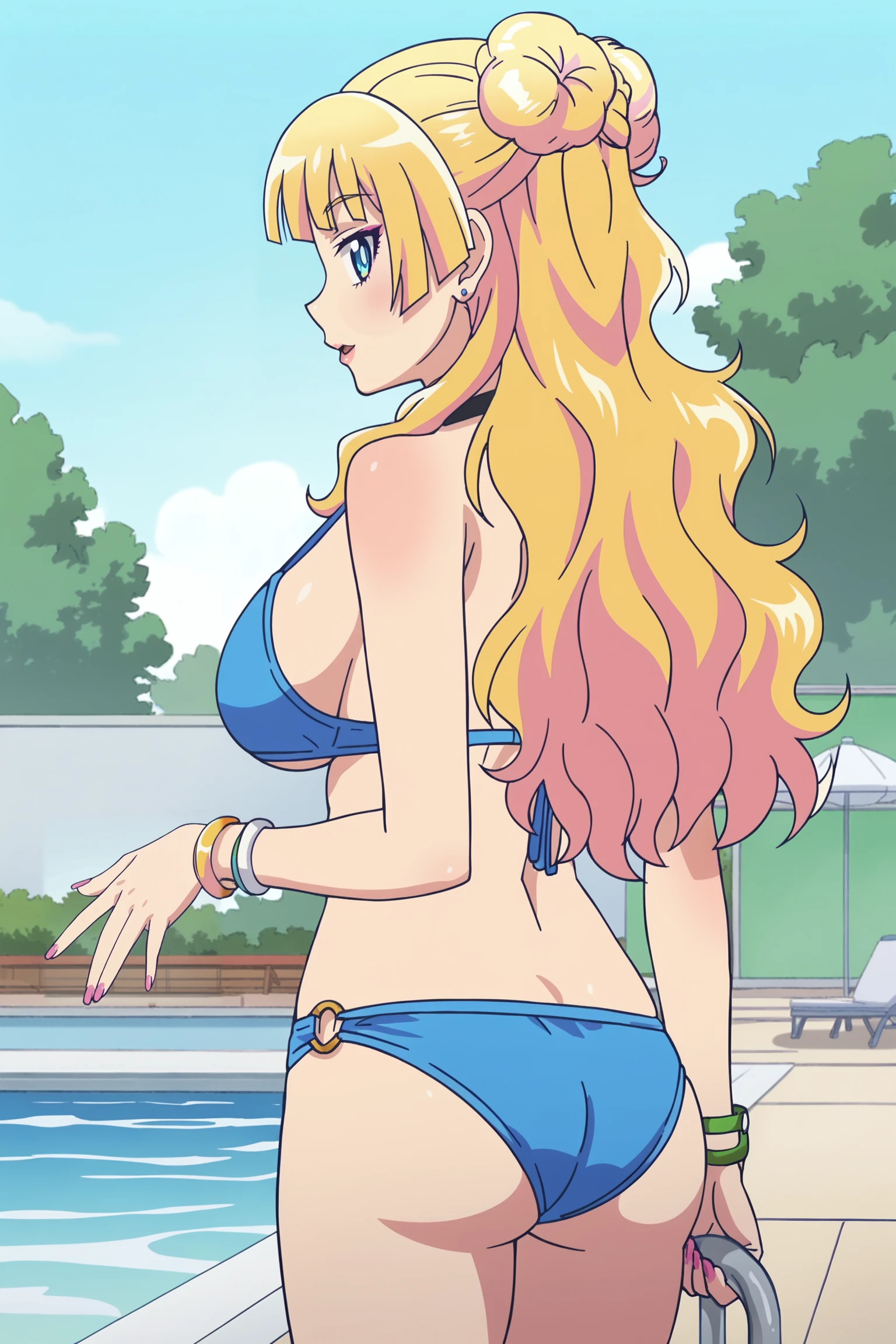 · Galko blue swimsuit | 1girl, solo, blonde hair, long hair, blue eyes, large breasts, earrings, nail polish, lips, Galko blue swimsuit, swimsuit, blue bikini, bikini skirt, asymmetrical hair, single side bun, hair bun, choker, cleavage, legs,, frilled bikini,