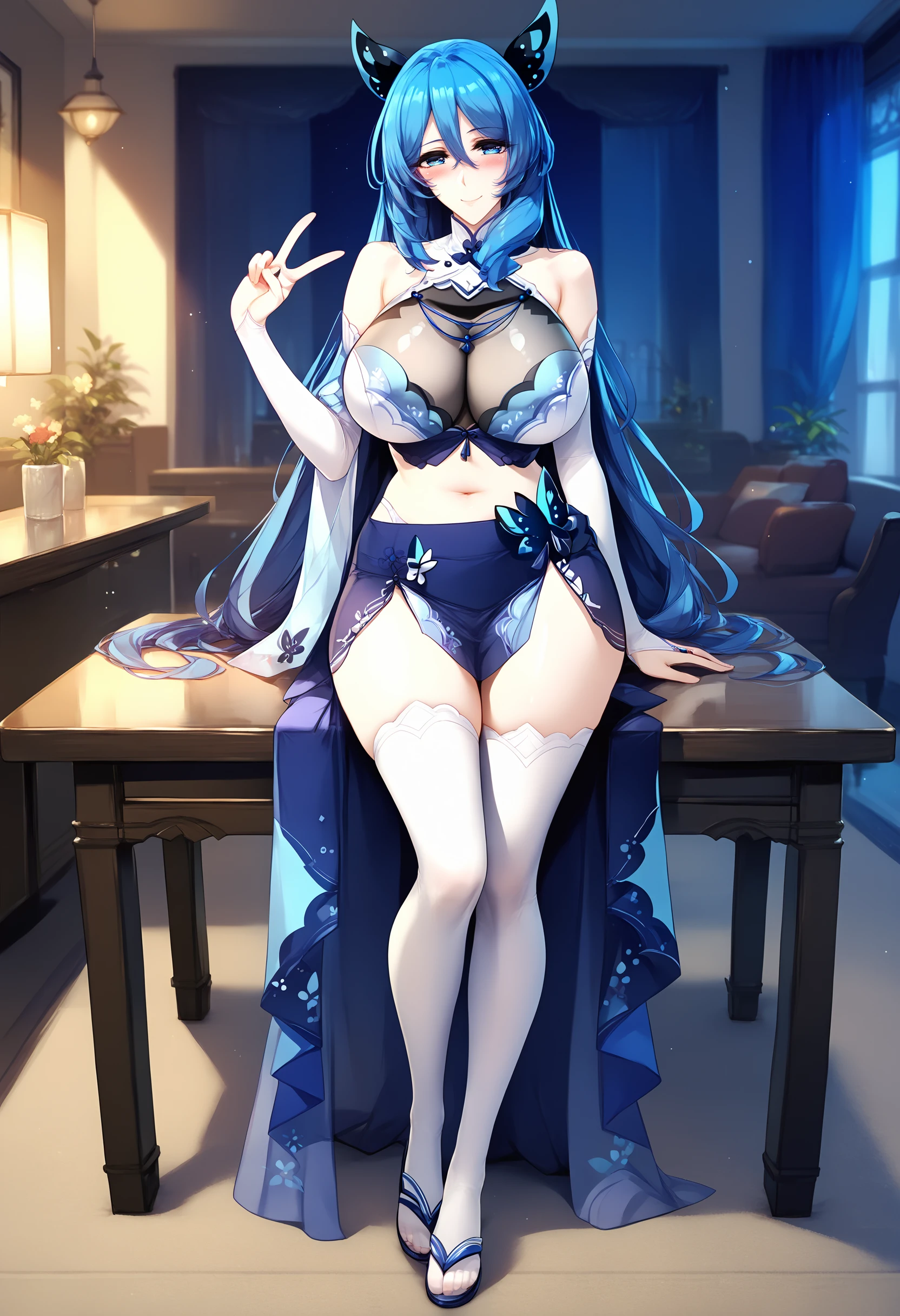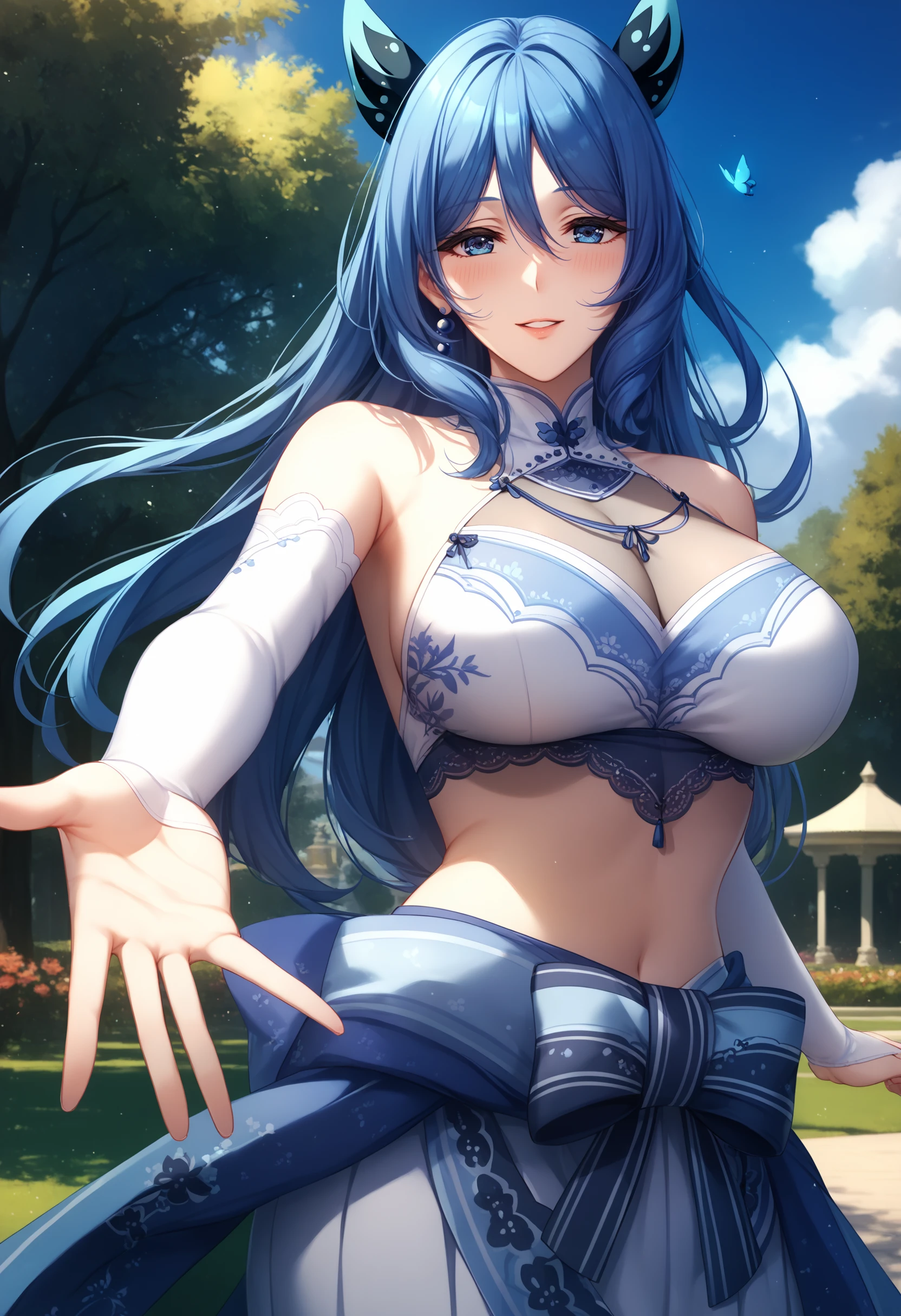 blue hair, blue eyes, long hair, butterfly hair ornament,