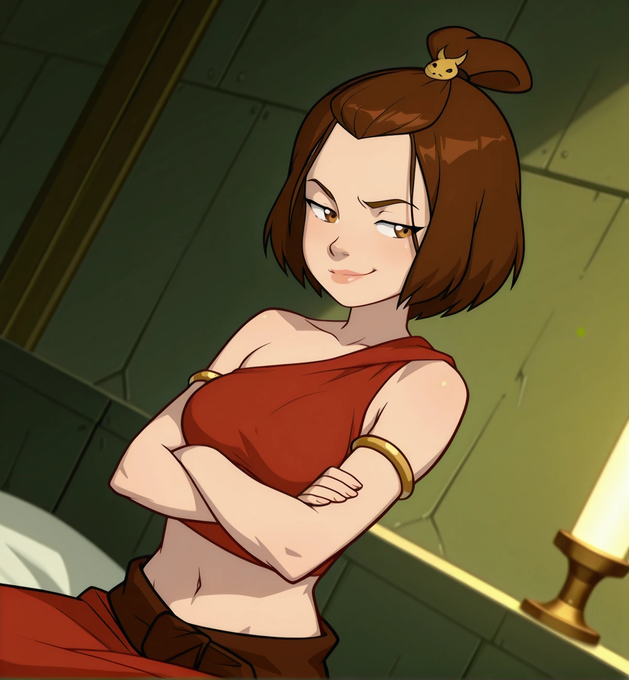 Suki: suki (avatar), 1girl, solo, brown eyes, brown hair, short hair, medium breasts, topknot, lips, forehead, crop top, red top, single-shoulder shirt, single strap, midriff, navel, gold armlet, hair ornament, small breasts