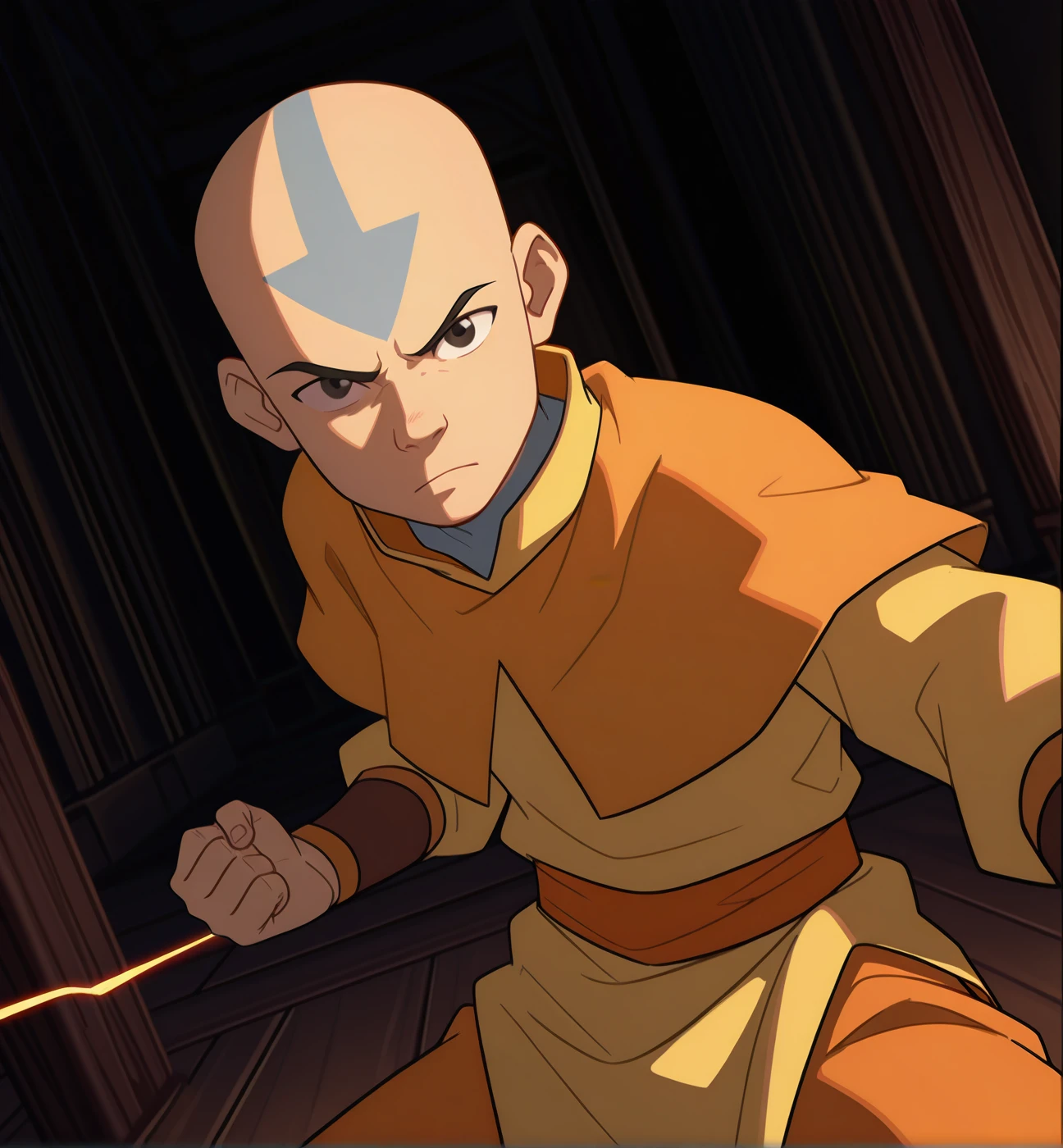 Aang: aang, solo, 1boy, facial mark, tattoo, bald, forehead tattoo, male focus, black eyes, forehead mark, arrow tattoo, orange capelet, long sleeves, yellow sleeves, yellow tunic, orange pants