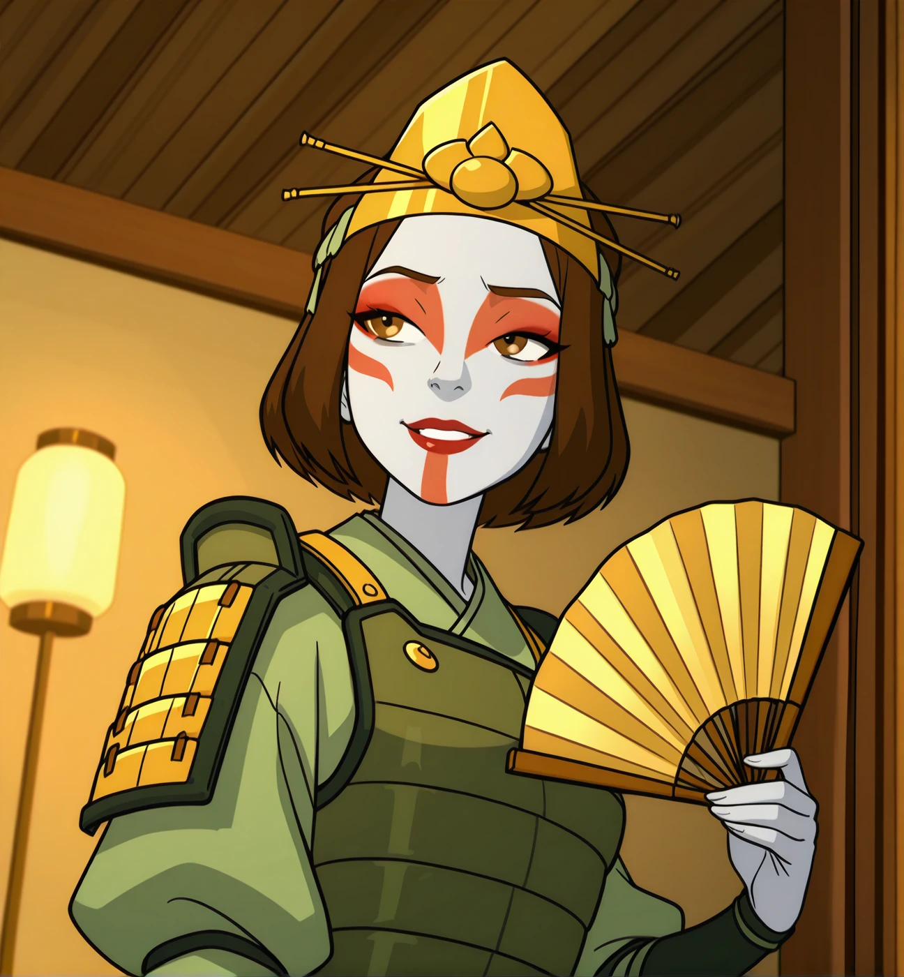Kyoshi Warrior: ky0sh1, 1girl, solo, short hair, brown hair, brown eyes, pale skin, red lips, lipstick, red eyeshadow, eyeliner, upper body, headpiece, headdress, japanese clothes, japanese armor, long sleeves, puffy sleeves, folding fan, holding fan, green clothes, indoors, armor, kusazuri, :d, facepaint:0.6, //optional// suki (avatar)