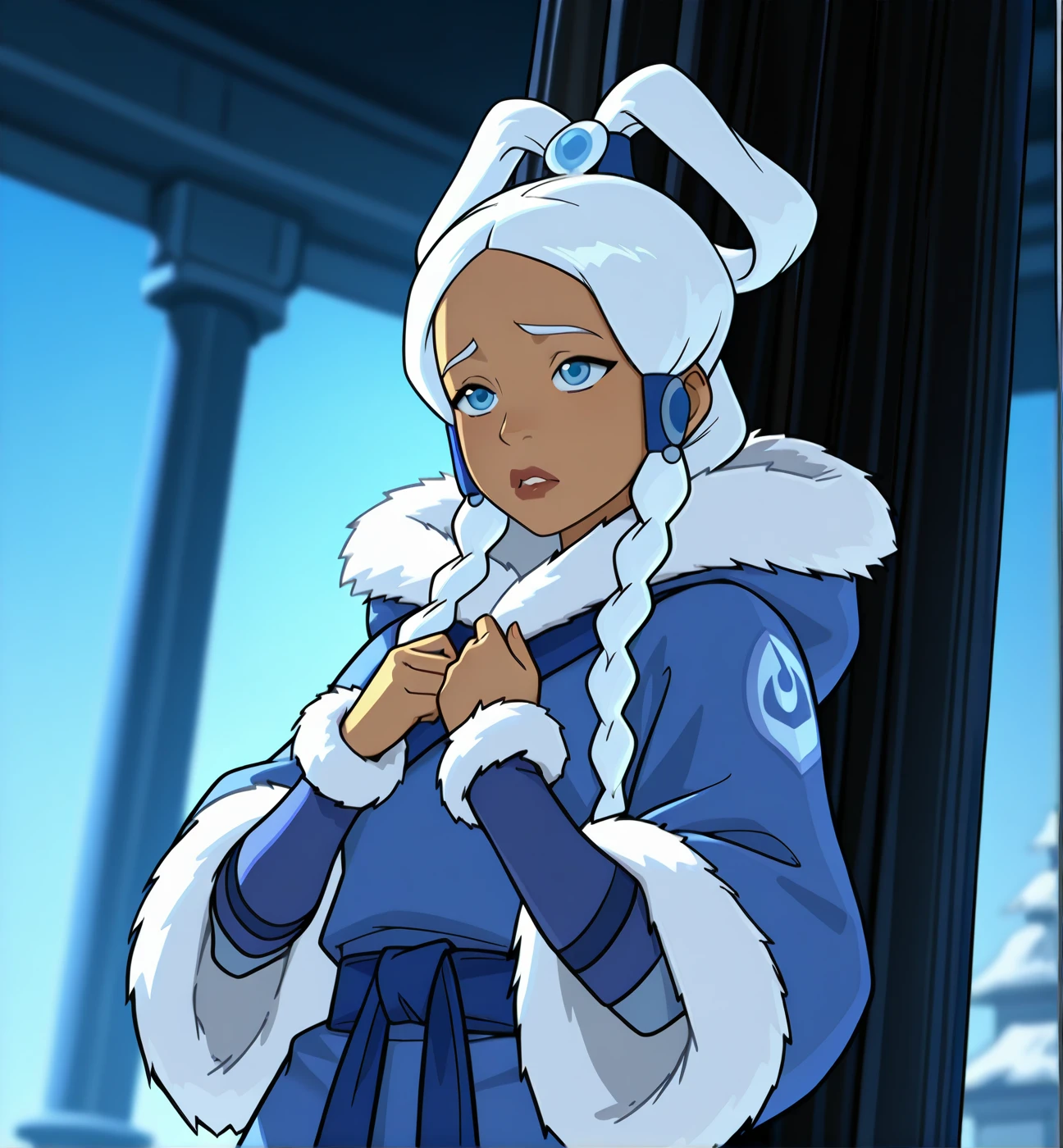 |//season1//|: forehead, ponytail, braid, single braid, fur trim, fur coat, fur-trimmed coat, hood, hood down, blue coat, winter clothes, hooded coat, hair bun, single hair bun