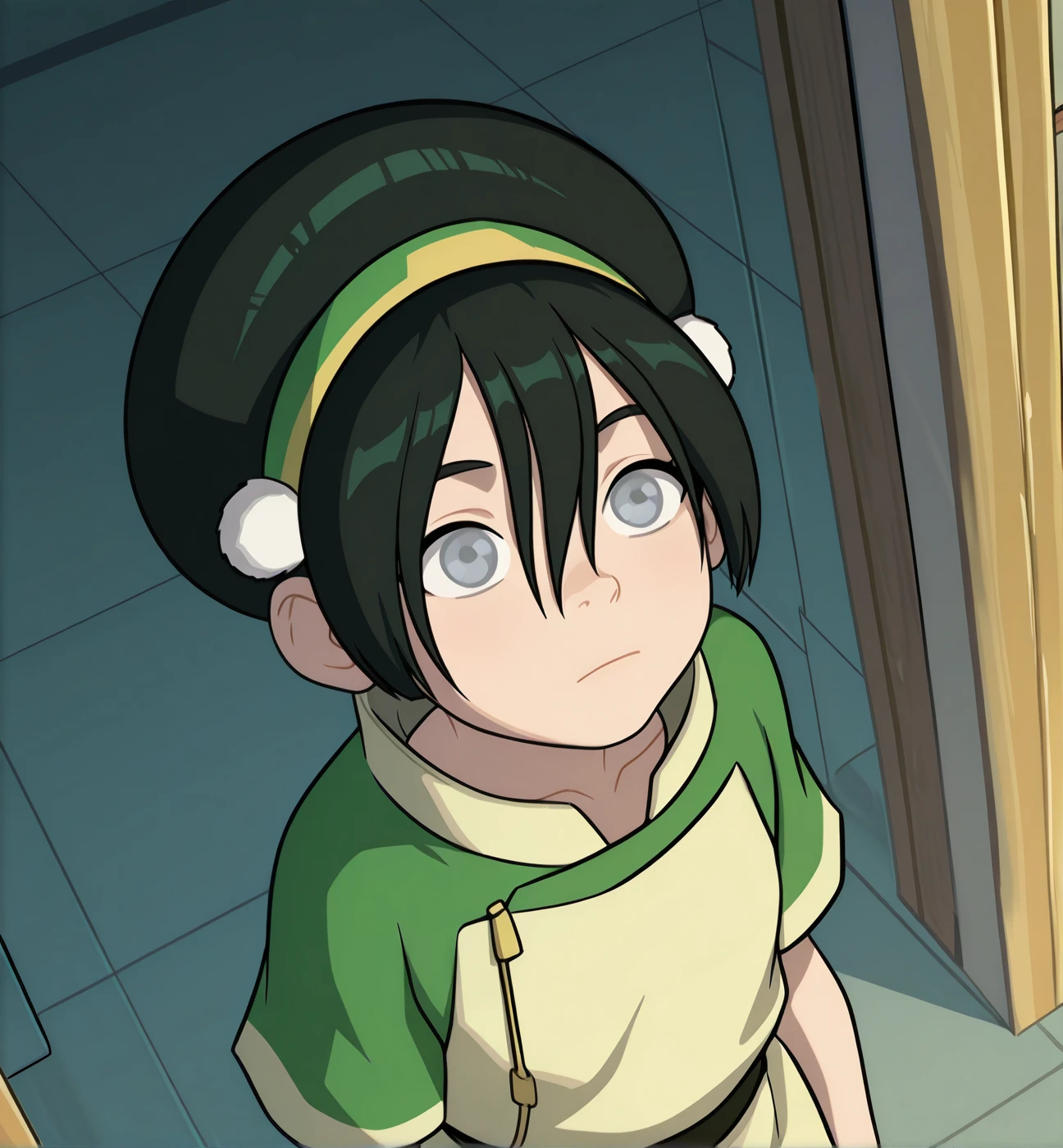 Toph Beifong: toph beifong, 1girl, solo, grey eyes, blind, black hair, short hair, hair between eyes, yellow hairband, hair bun, single hair bun, green hairband, short sleeves, green robe, white robe