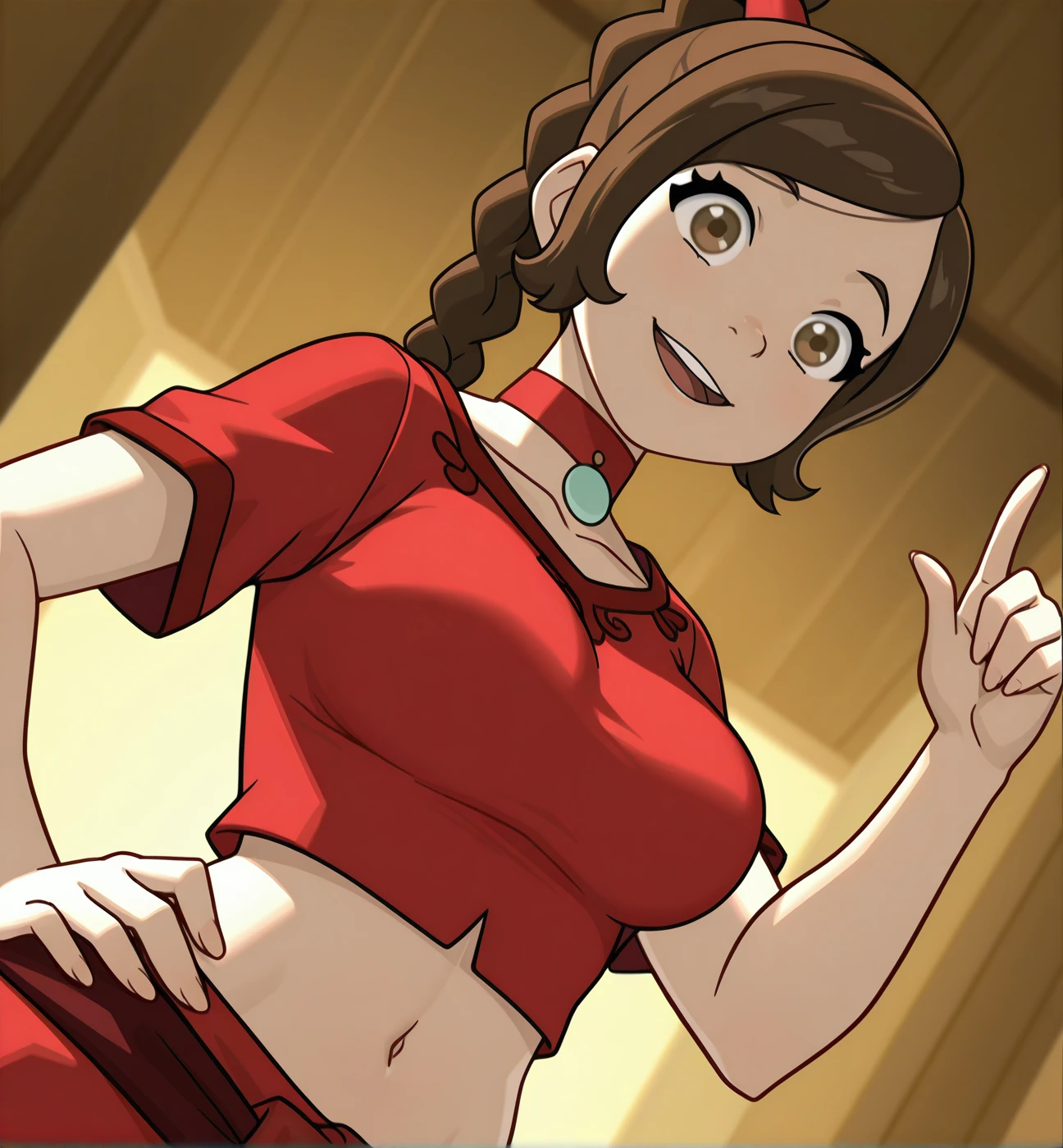 Ty lee: ty lee, 1girl, solo, brown eyes, dark brown hair, long hair, medium breasts, large breasts, ponytail, braid, red choker, braided ponytail, high ponytail, crop top, red top, midriff, navel, short sleeves
