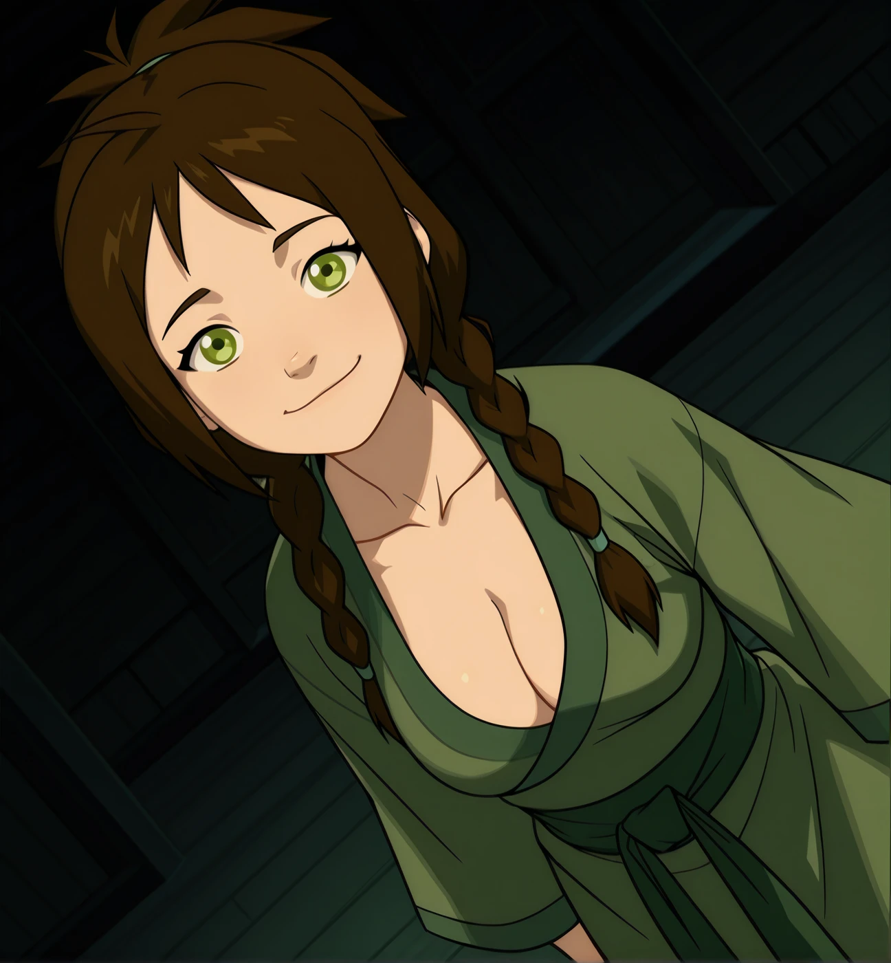 Jin: jin (avatar), 1girl, solo, green eyes, dark brown hair, medium breasts, long hair, collarbone, japanese clothes, cleavage, kimono, sash, wide sleeves, long sleeves, green clothes, spiked hair, ponytail