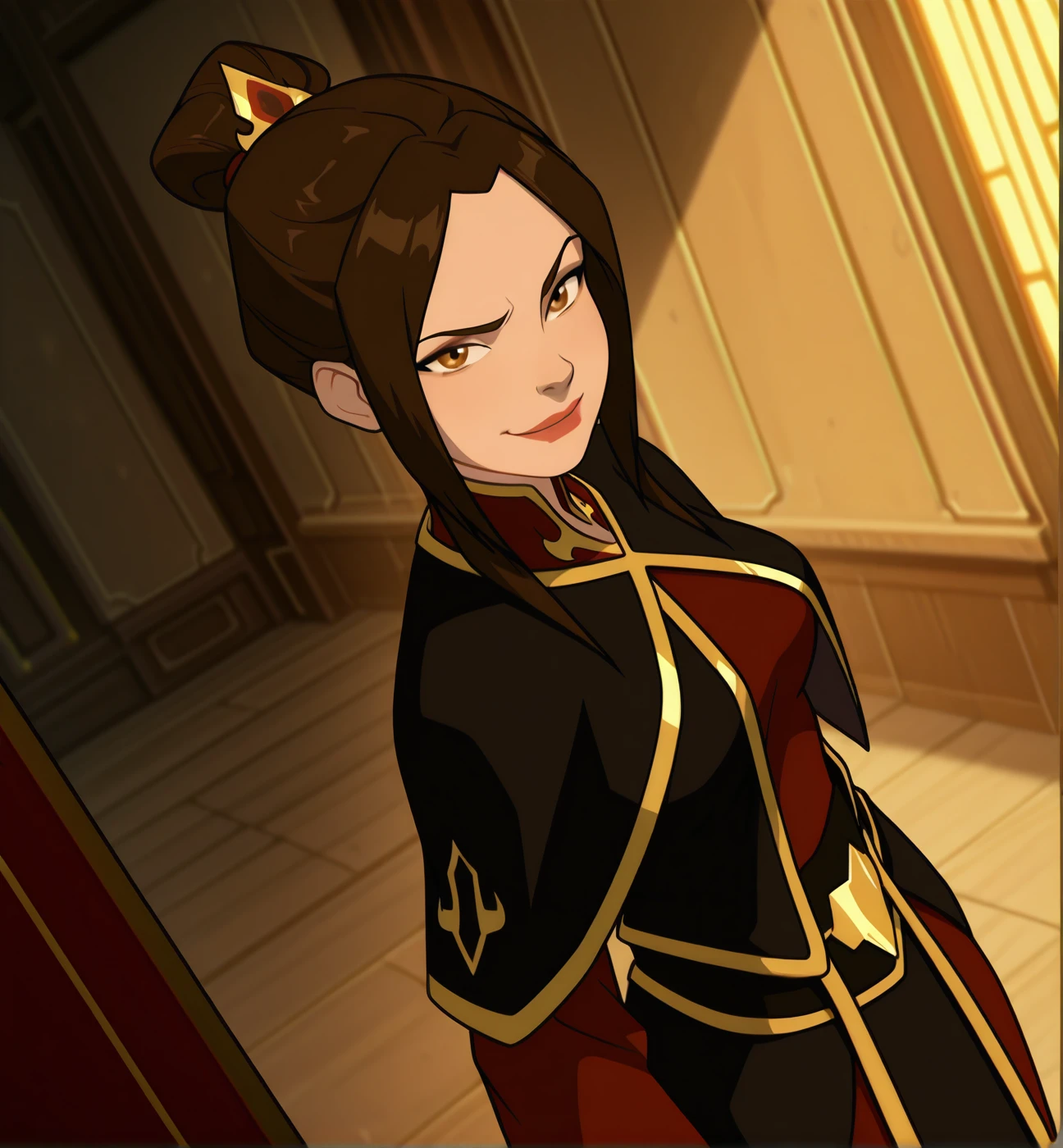 Azula: azula, 1girl, solo, brown eyes, short hair, long hair, brown hair, black hair, hair ornament, lips, lipstick, medium breasts, parted bangs, hair bun, single hair bun, sidelocks, black capelet, gold trim, red pants, tunic, red clothes, black clothes