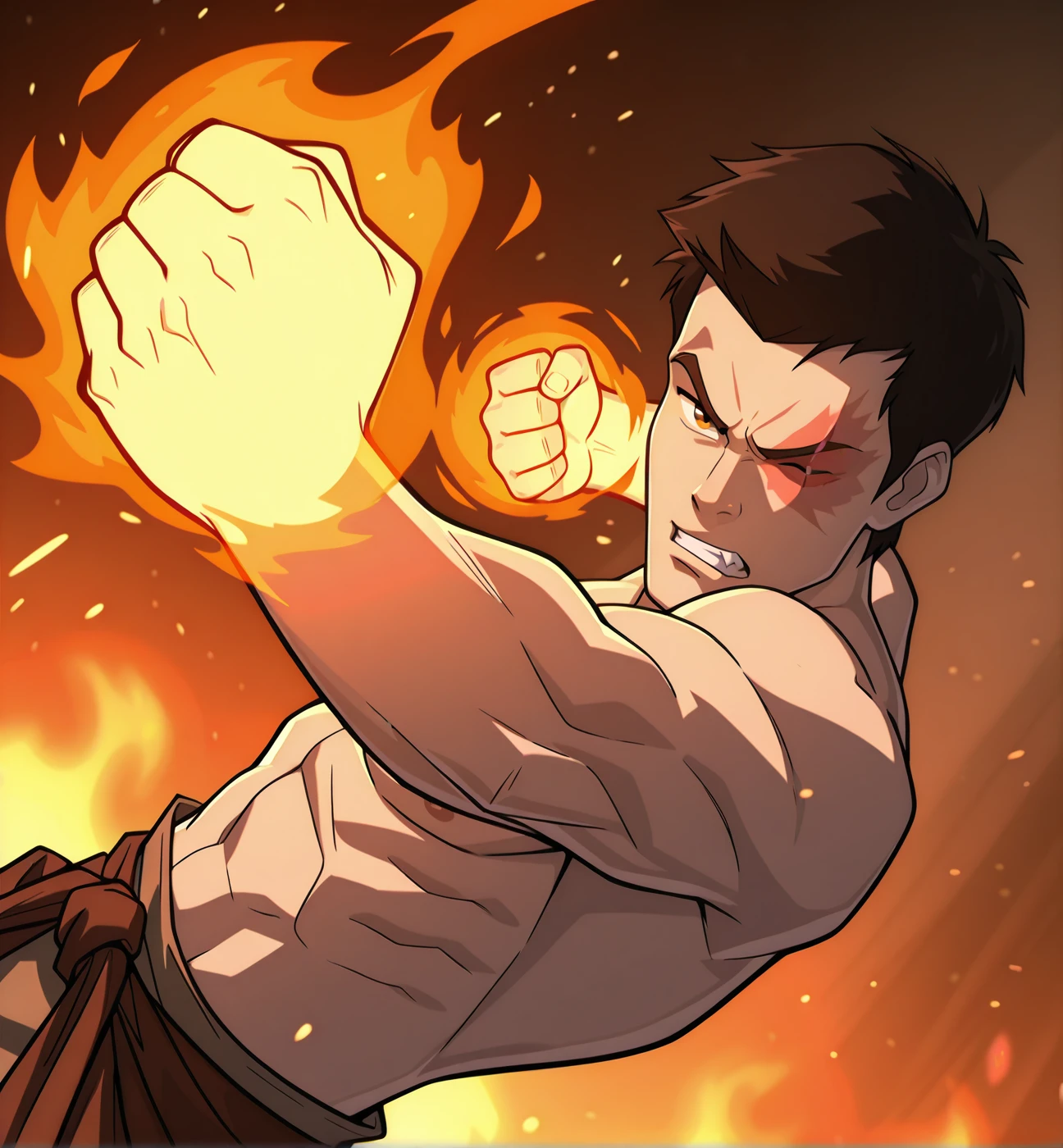 Zuko: zuko, 1boy, male focus, solo, brown hair, black hair, hair between eyes, brown eyes, collarbone, sleeveless, belt, scar, pectorals, crossed arms, scar on face, red clothes