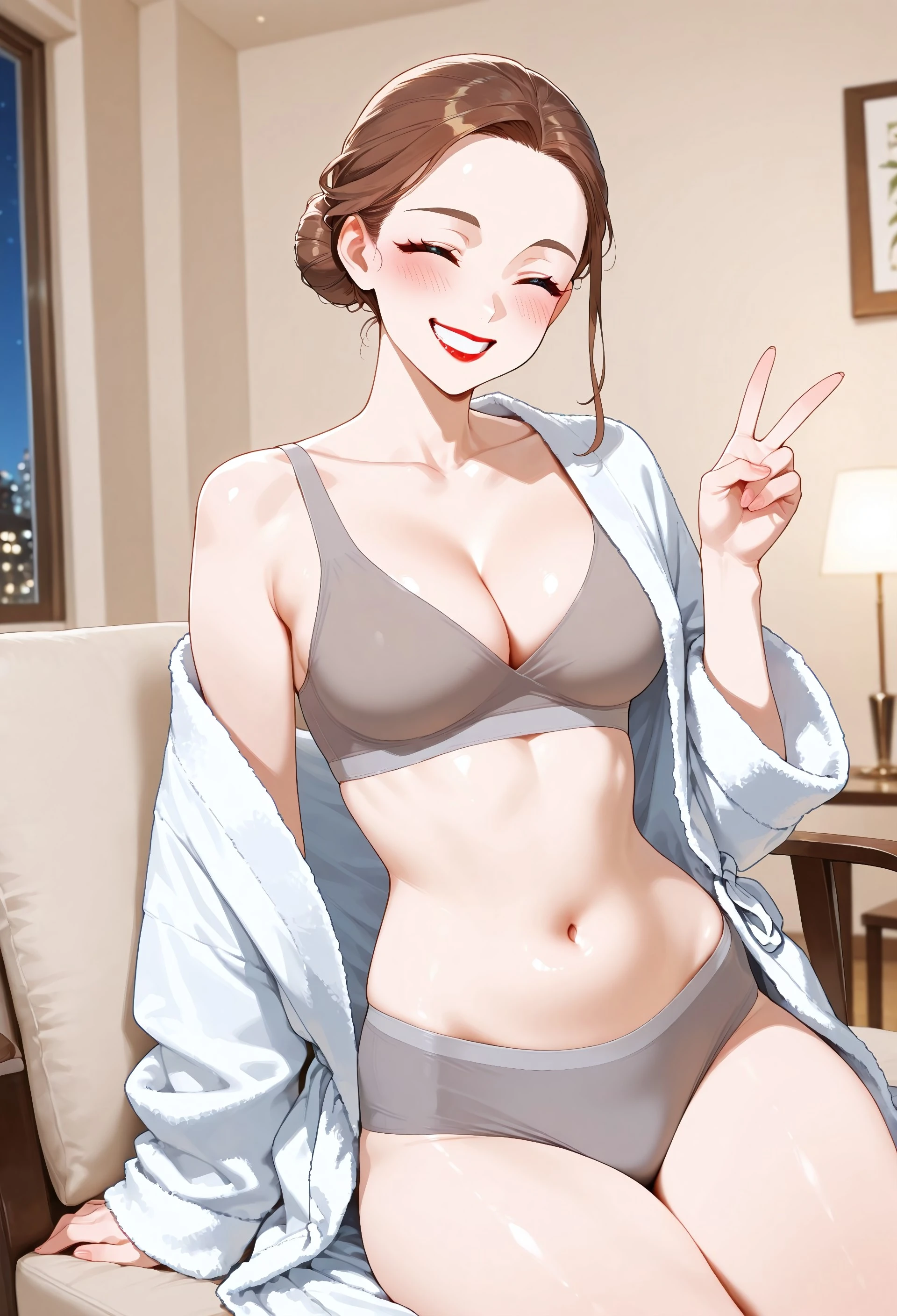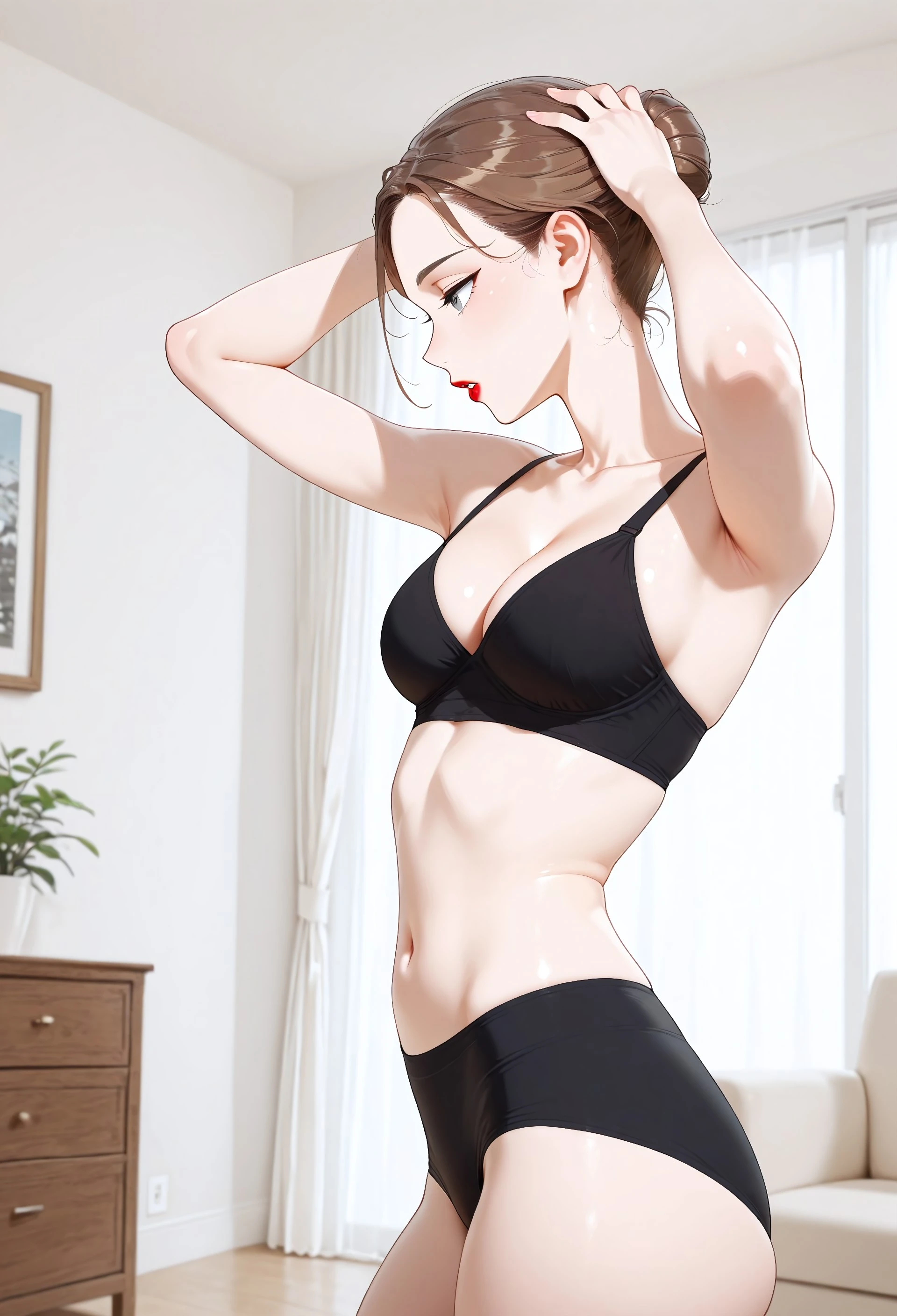 Appearance: 1girl, solo, grey eyes, light brown hair, single hair bun, natural makeup, medium breasts, navel, collarbone, cleavage,