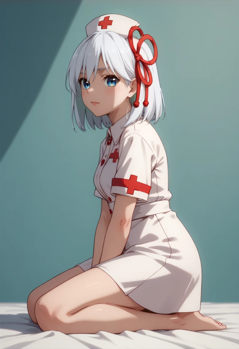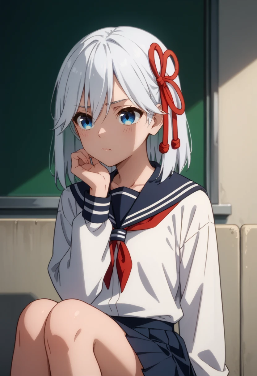 amagamiasahi, blue eyes, white hair, red ribbon, hair ribbon