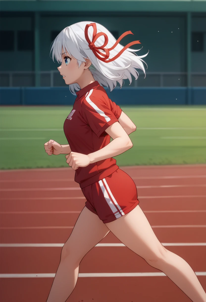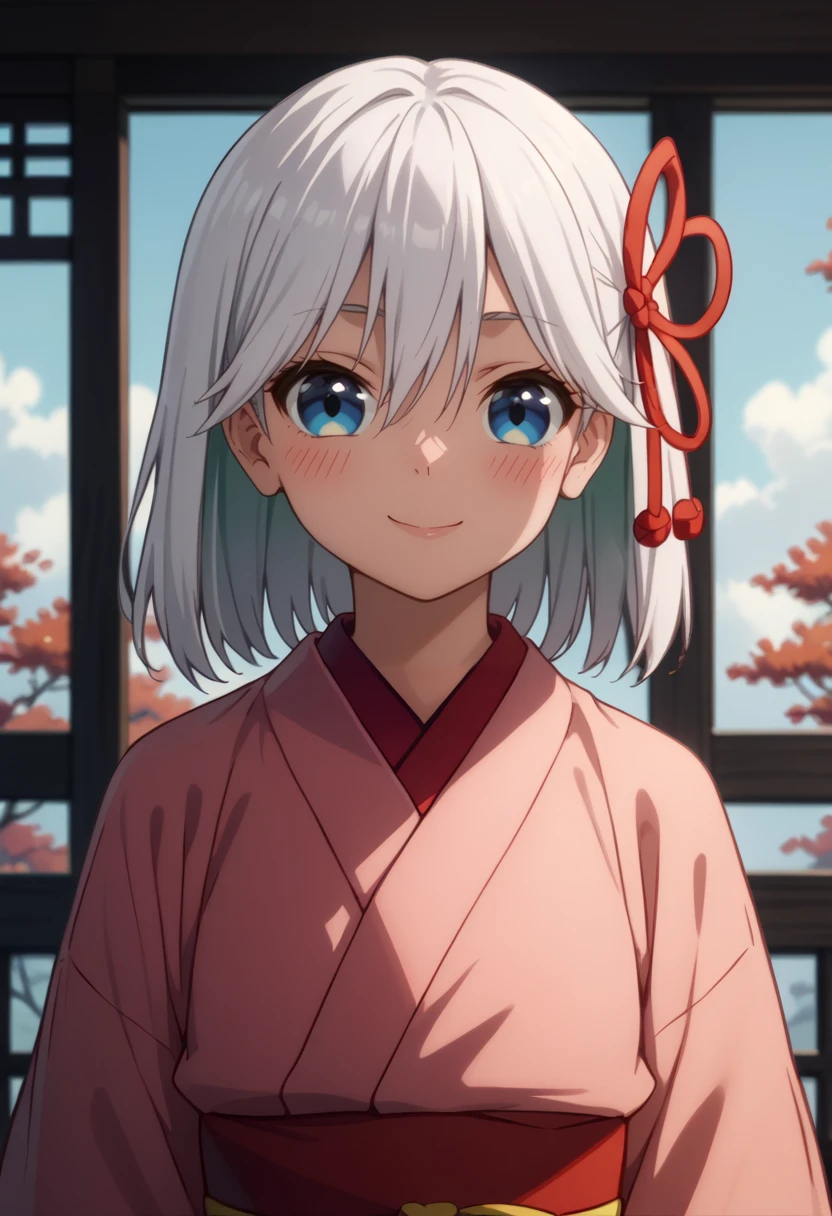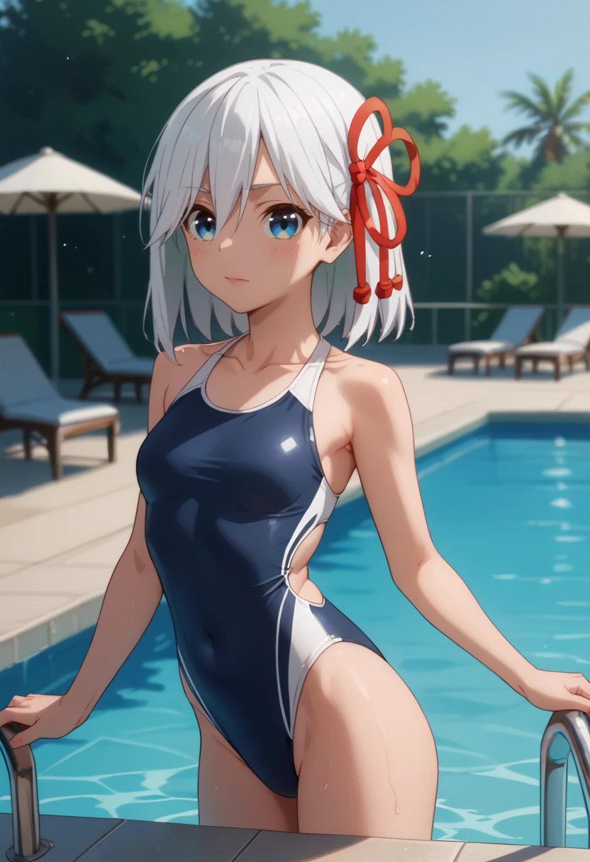 character: amagamiasahi, blue eyes, white hair, red ribbon, hair ribbon