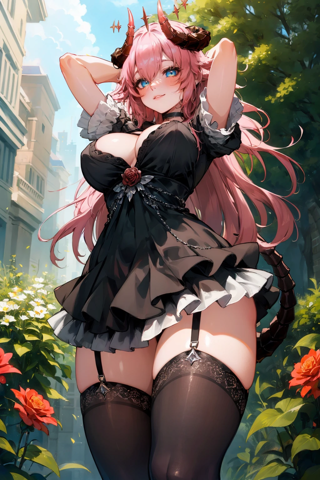 black choker, red rose, black dress, cleavage, frilled dress, puffy short sleeves, black thighhighs, garter straps,