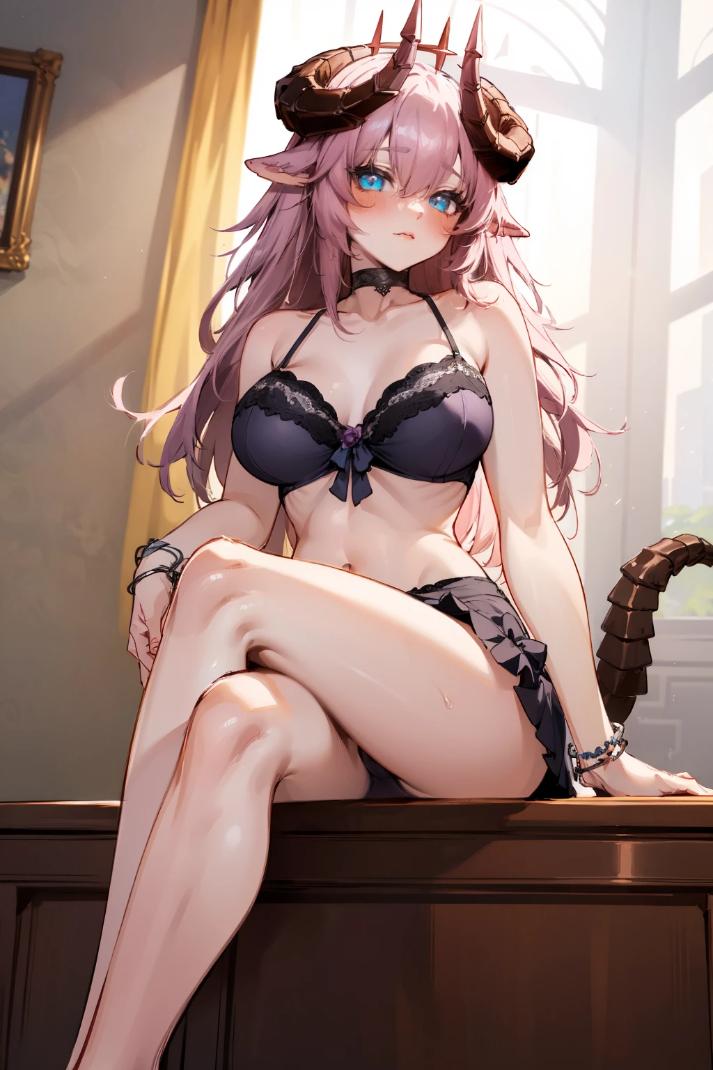 purple choker, bracelet, (purple babydoll:1.2), underwear, bare shoulders, frills, purple flower, highleg panties, midriff, bikini skirt,Description