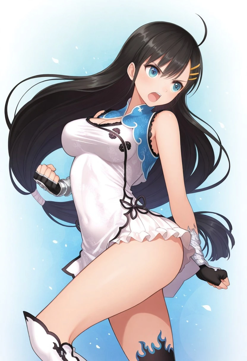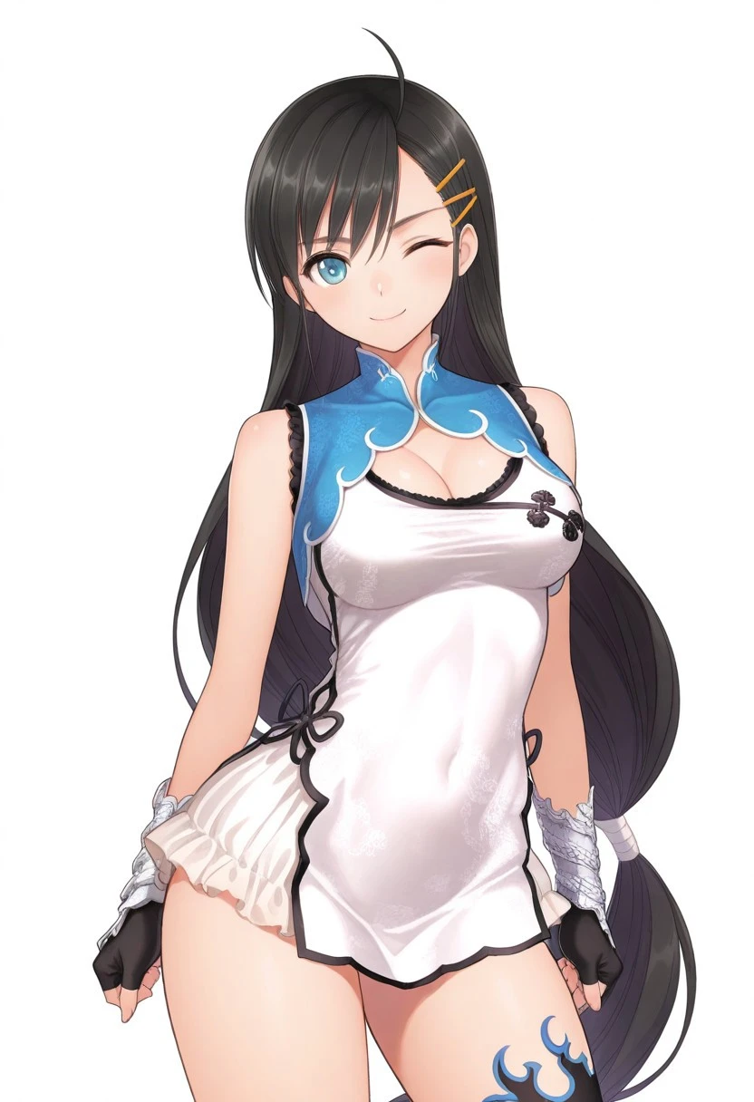 1girl, solo, WanPai, black hair, cyan eyes, very long hair, low ponytail, yellow hairclips, bare shoulders, blue cropped jacket with white trim, sleeveless jacket, cleavage opening, white chinese dress with black trim, side ribbons, semi-transparent skirt, skirt under dress, frilly skirt, silver wristbands, black fingerless gloves, asymmetrical socks, white kneesock with black trim, black and blue thighhigh