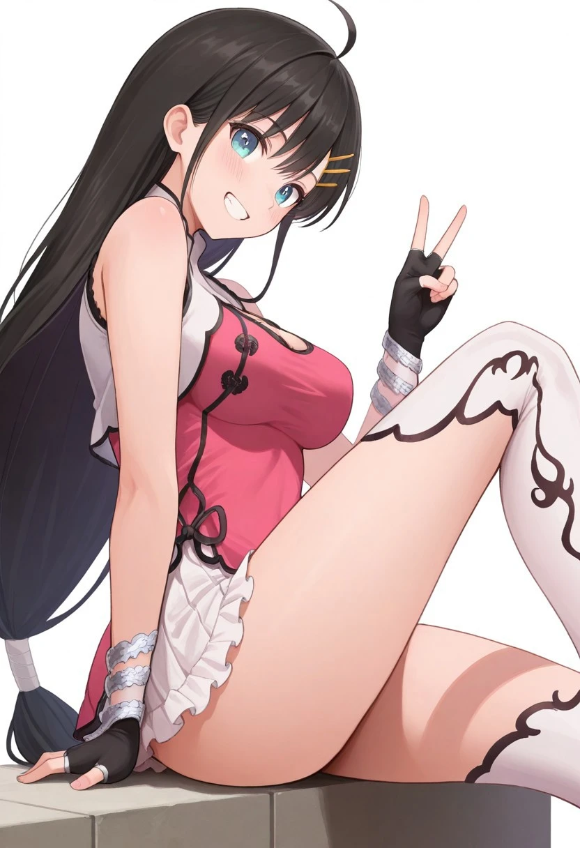 1girl, solo, WanPai, black hair, cyan eyes, very long hair, low ponytail, yellow hairclips, bare shoulders, white cropped jacket with black trim, sleeveless jacket, cleavage opening, pink chinese dress with black trim, side ribbons, semi-transparent skirt, skirt under dress, frilly skirt, silver wristbands, black fingerless gloves, asymmetrical socks, pink kneesock with black trim, white and gold thighhigh