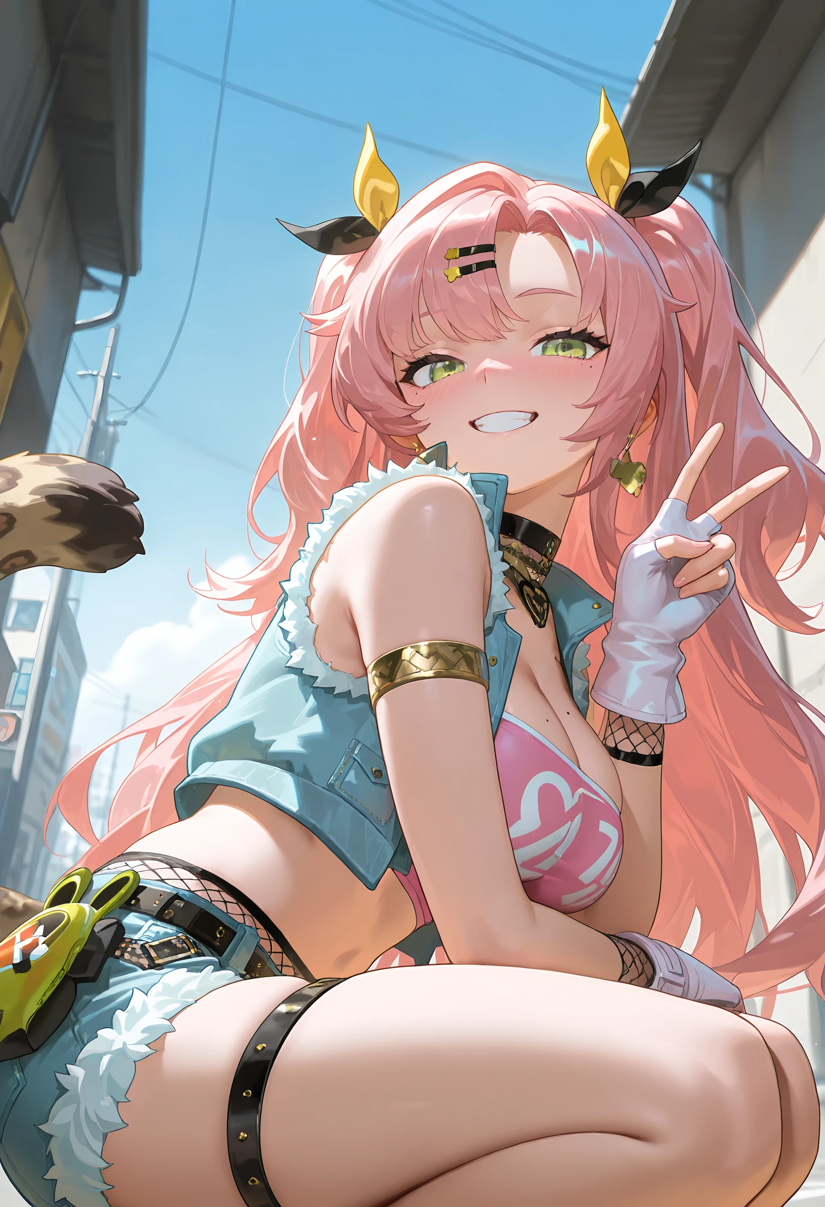 Tags for her outfit2: bare shoulders, choker, midriff, white gloves, stomach, fingerless gloves, crop top, fur trim, short shorts, thigh strap, fishnets, armlet, blue shorts, pink shirt, denim shorts, yellow ribbon, leopard print, leopard tail, fur-trimmed shorts, belt, pink tube top, denim vest, sleeveless vest,