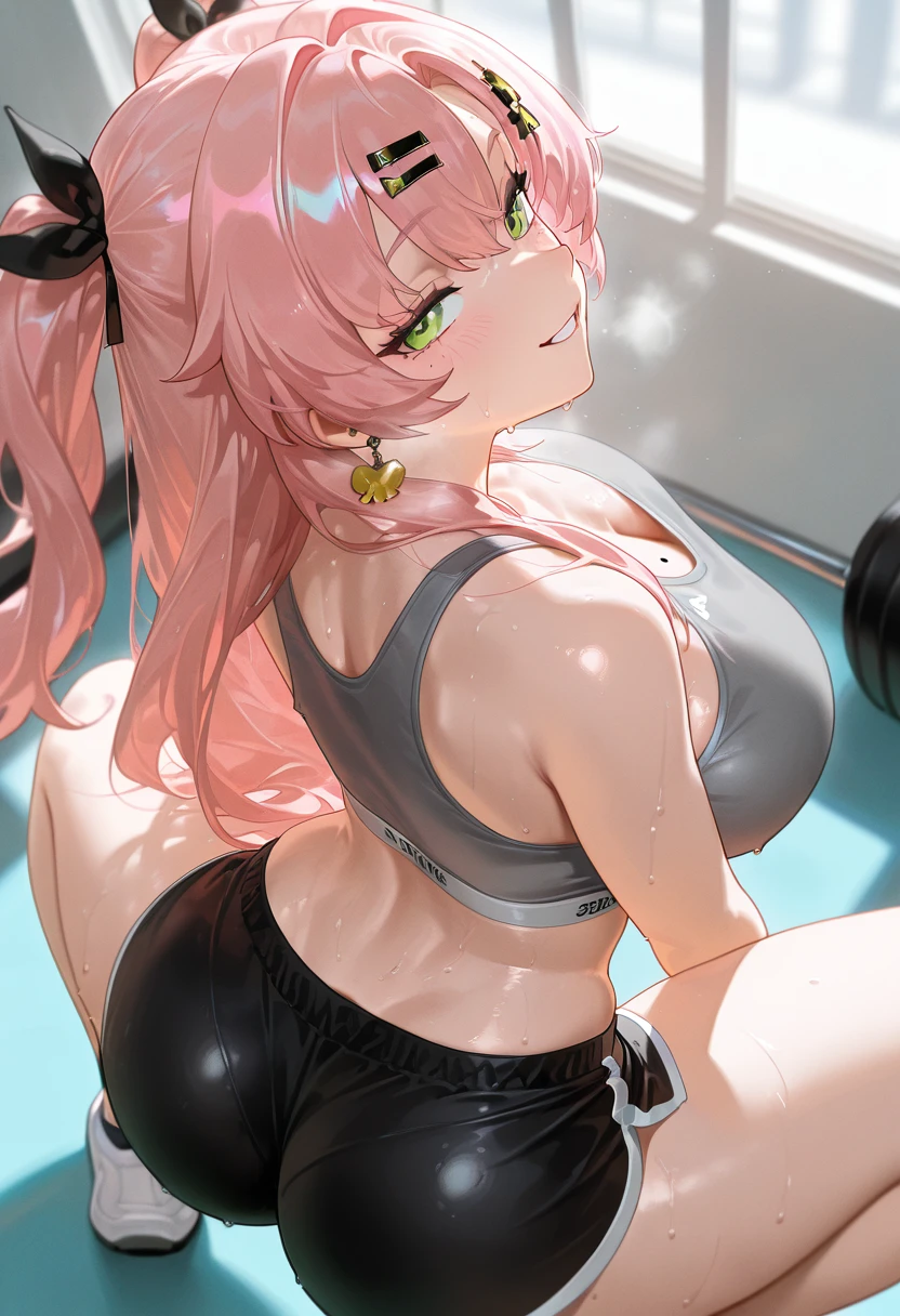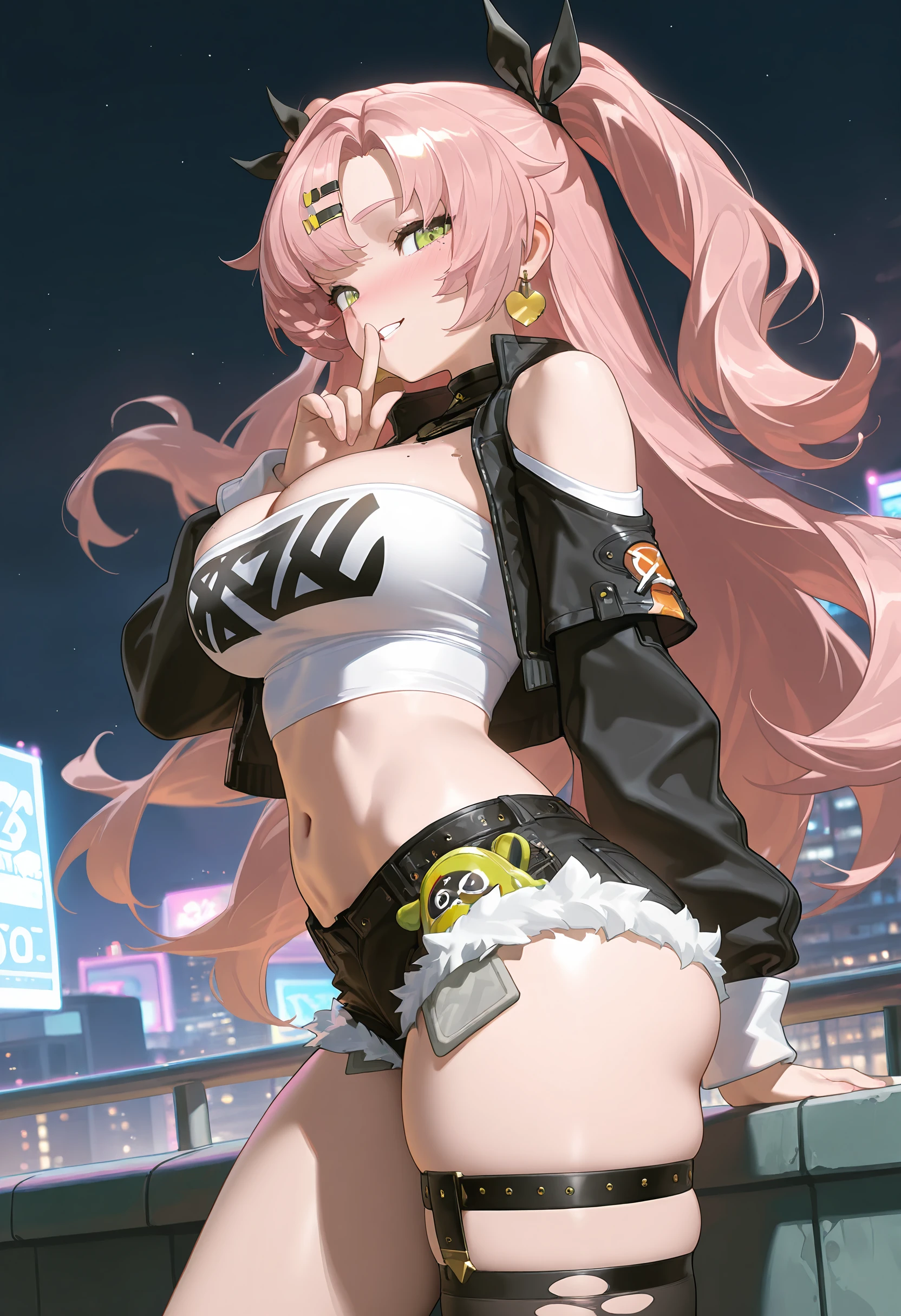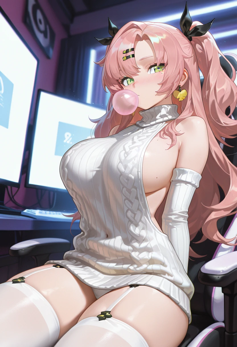 Tags for her look: 1girl, solo, long hair, large breasts, hair ornament, very long hair, green eyes, pink hair, hair ribbon, earrings, hairclip, two side up, mole under eye, black ribbon, mole on breast,
