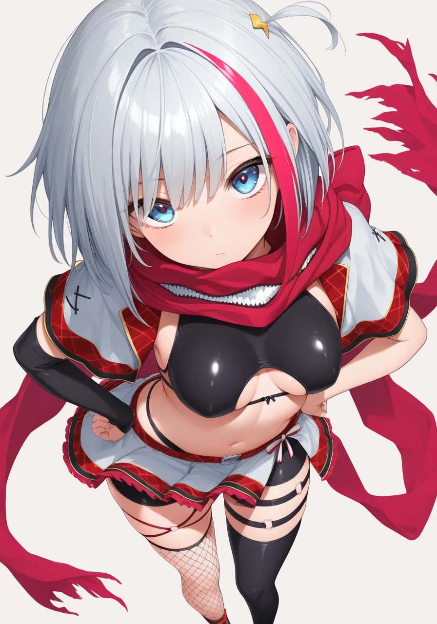 speeskin4, blue eyes, silver hair, streaked hair, scarf, shorts under skirt, asymmetrical legwear, single fishnet thighhigh,________